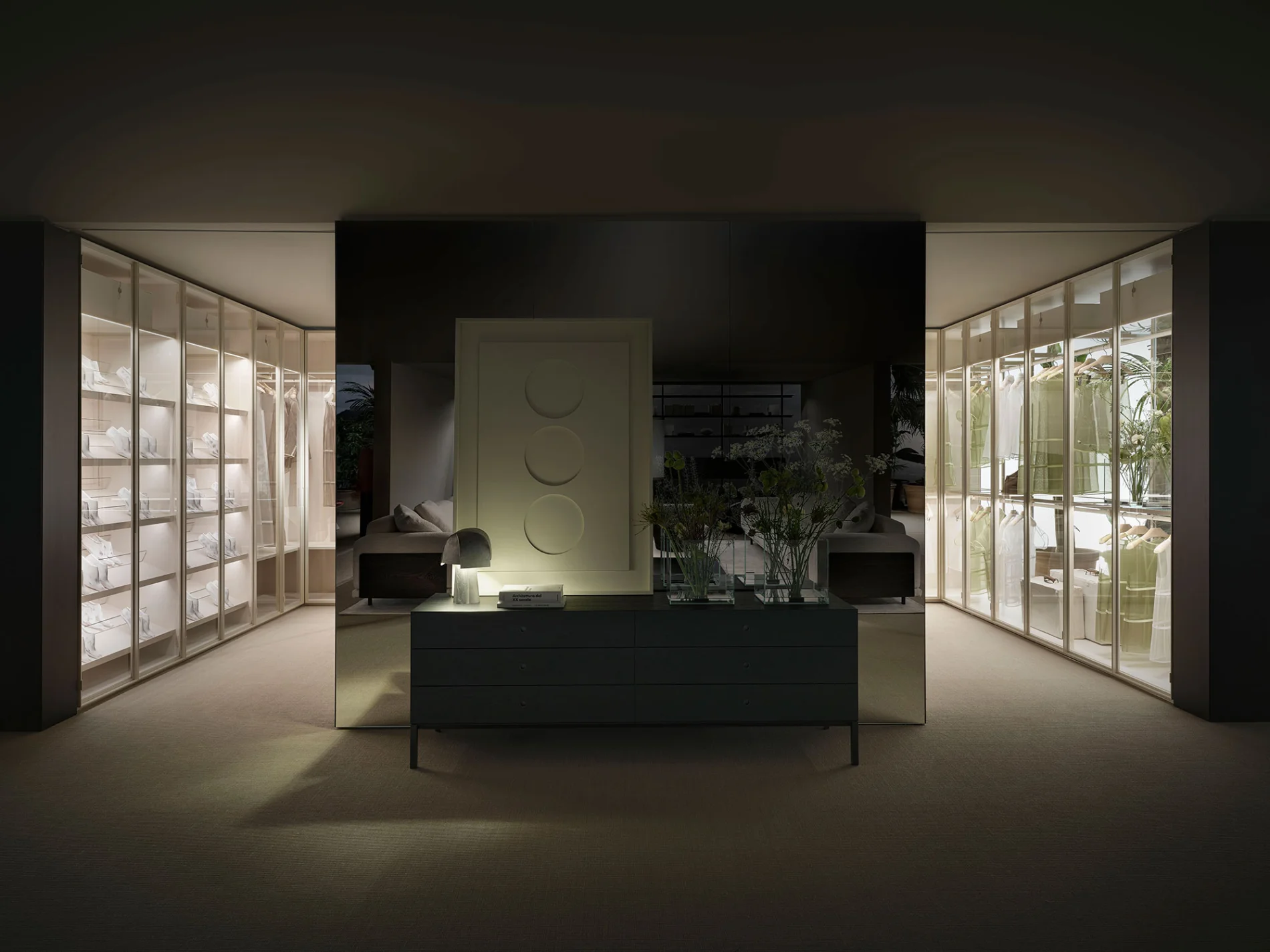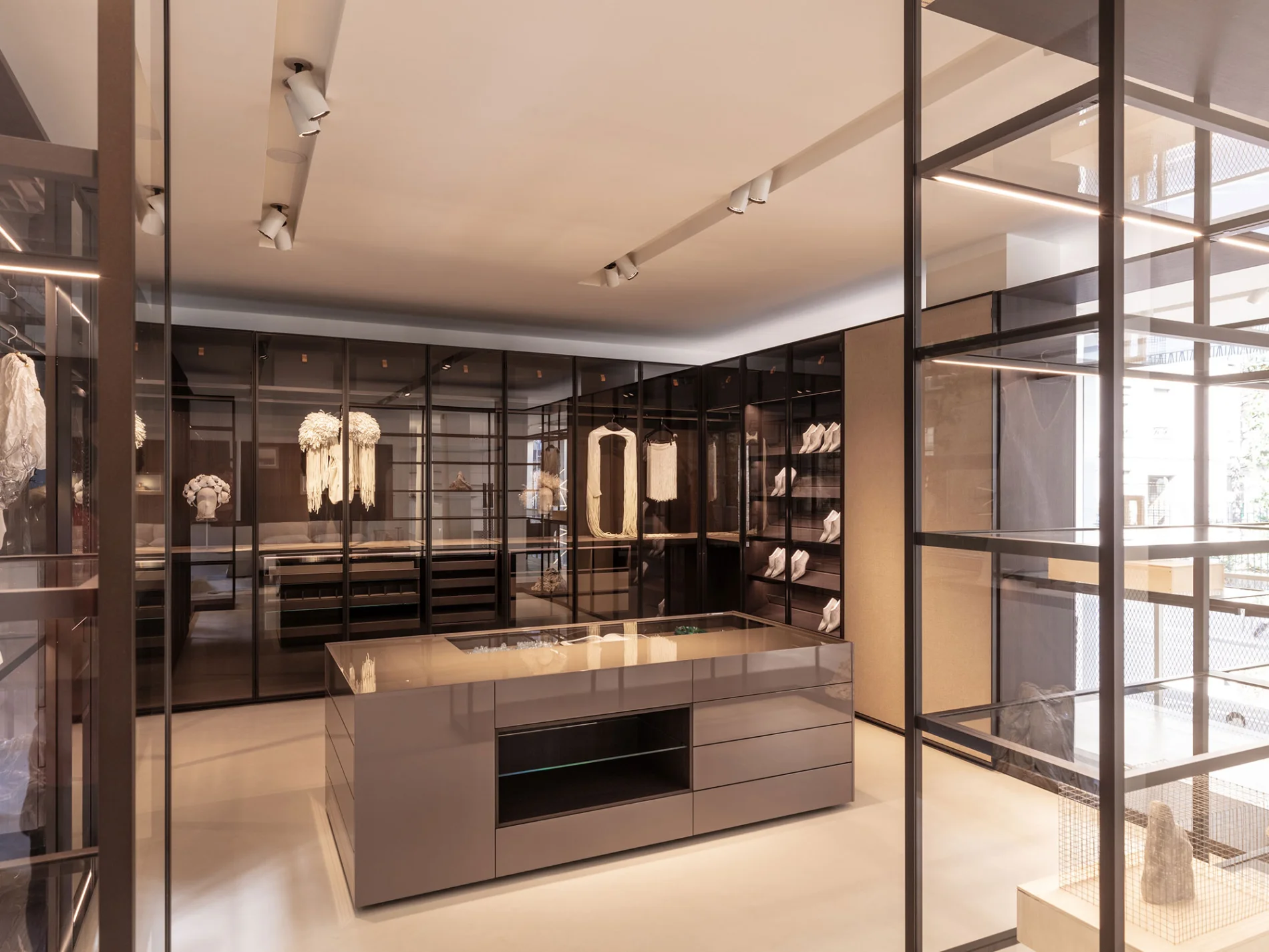In questa configurazione totalmente trasparente, centro stanza e con il fondale luminoso alle spalle, si sottolinea come Storage non sia un semplice guardaroba, ma una vetrina per esporre i vestiti preziosi non solo nelle residenze private, ma anche nei progetti contract.