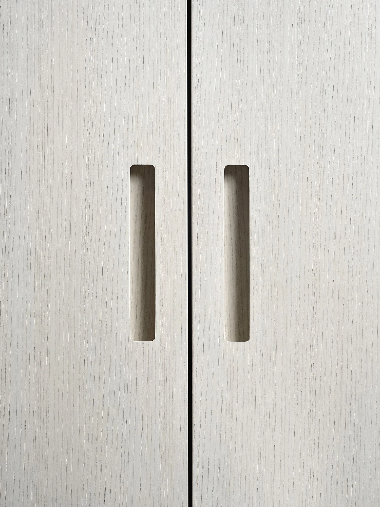 Gli schienali e le attrezzature Storage sono in Ciliegio White, una delle raffinate texture disponibili per gli interni degli armadi Porro, selezionate e prodotte in esclusiva per il brand coniugando resistenza e alti valori estetici.