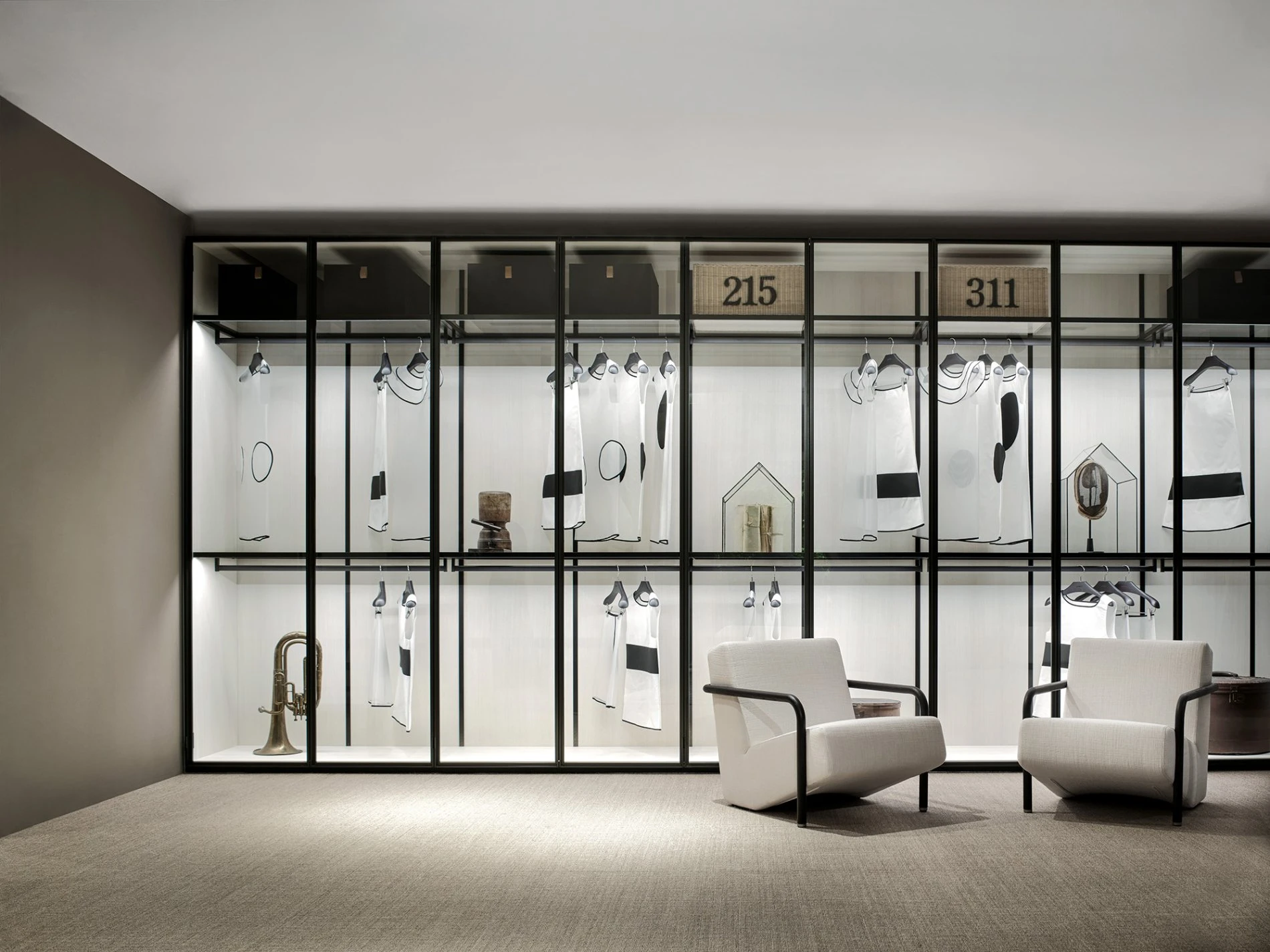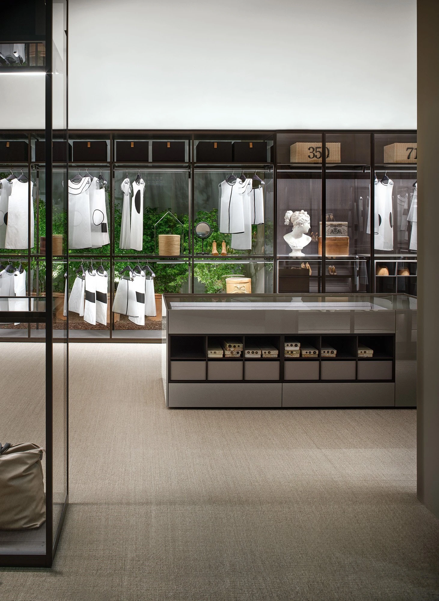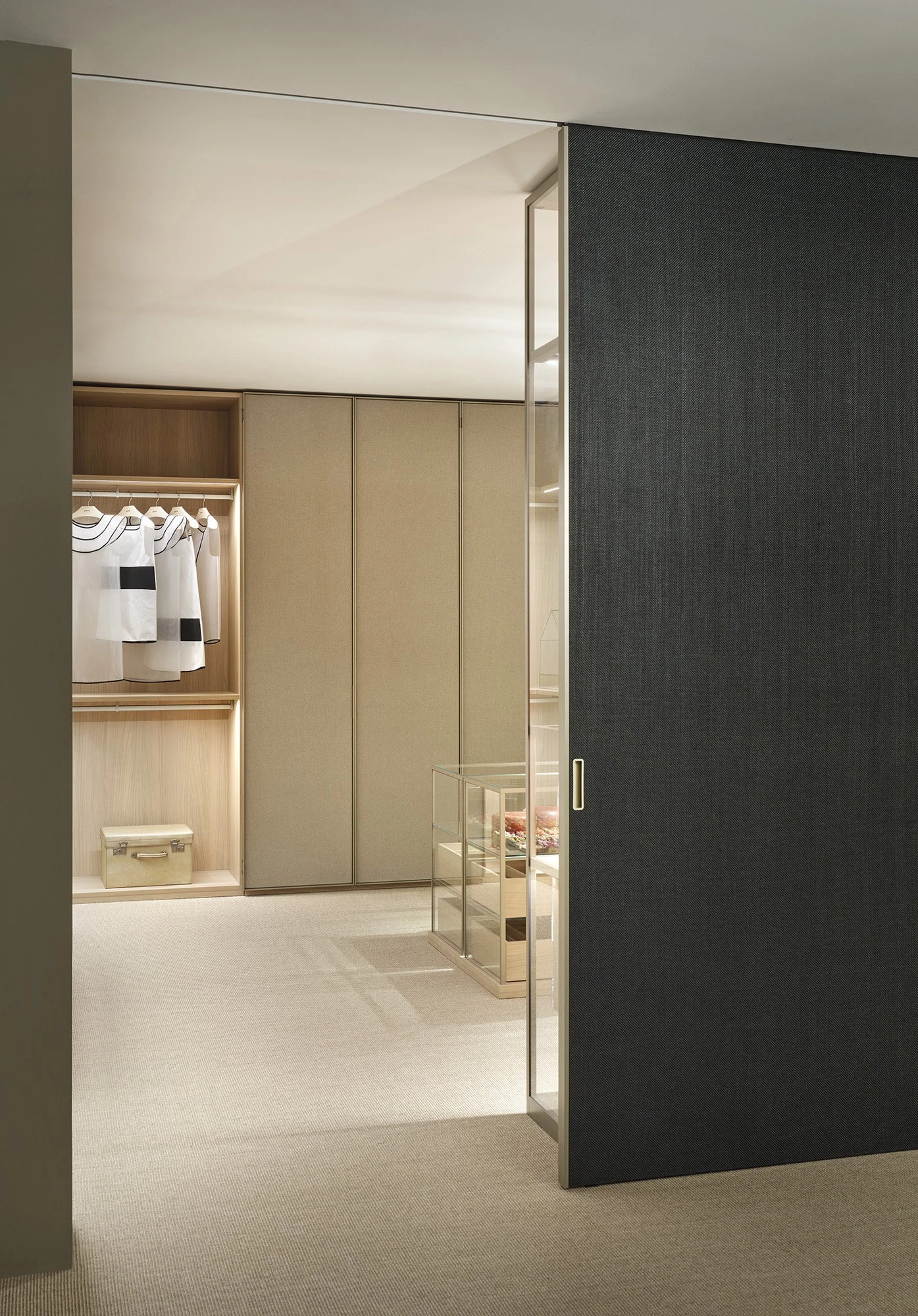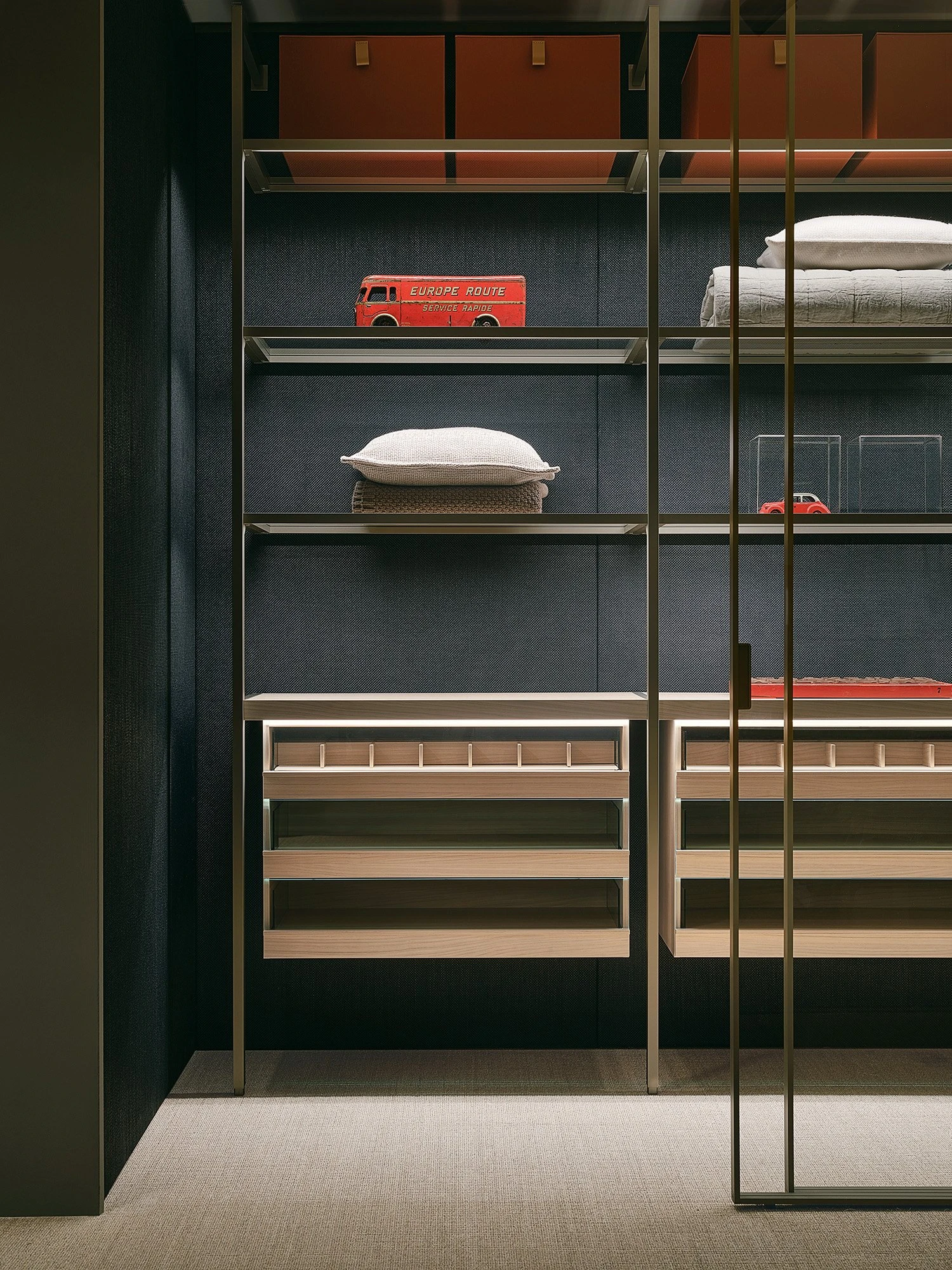 La dressing room angolare Storage alterna vani trasparenti, completamente aperti o racchiusi da ante in cristallo, con vani chiusi dalle nuove ante Portrait in tessuto.