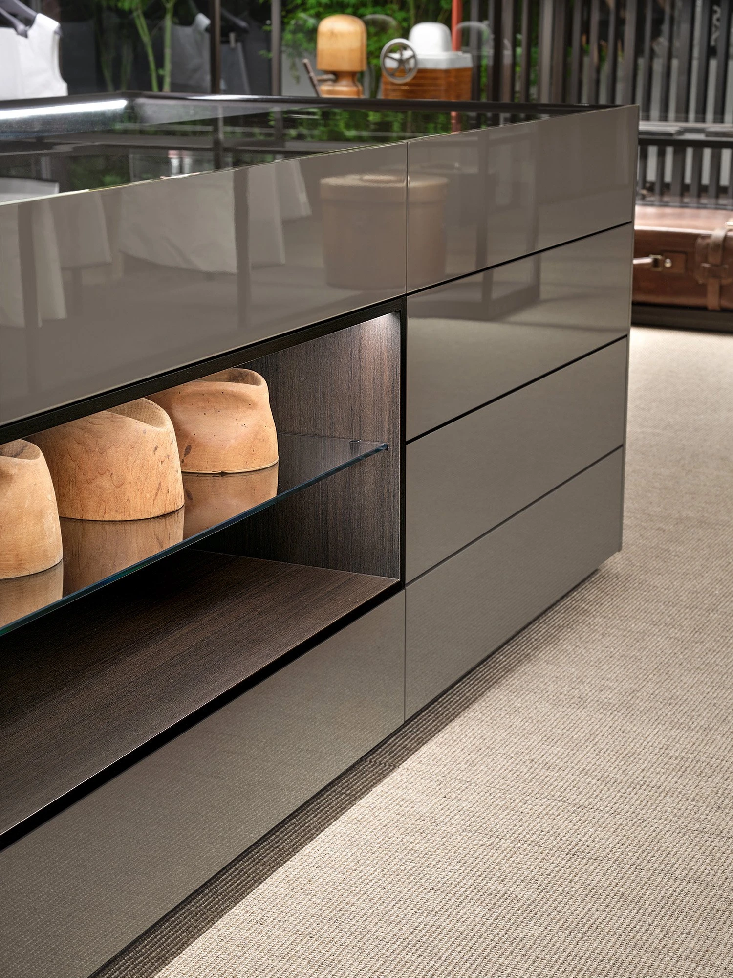 Al centro la nuova cassettiera Storage Isola, che incorpora le attrezzature di serie che rendono unico il sistema notte Storage e le combina in un’infinita serie di possibilità: con il top di vetro serigrafato, il vano a giorno, la cassettiera in testata, nasce un nuovo contenitore multifunzione per completare la dressing room, in contesti domestici e nei contract più raffinati.