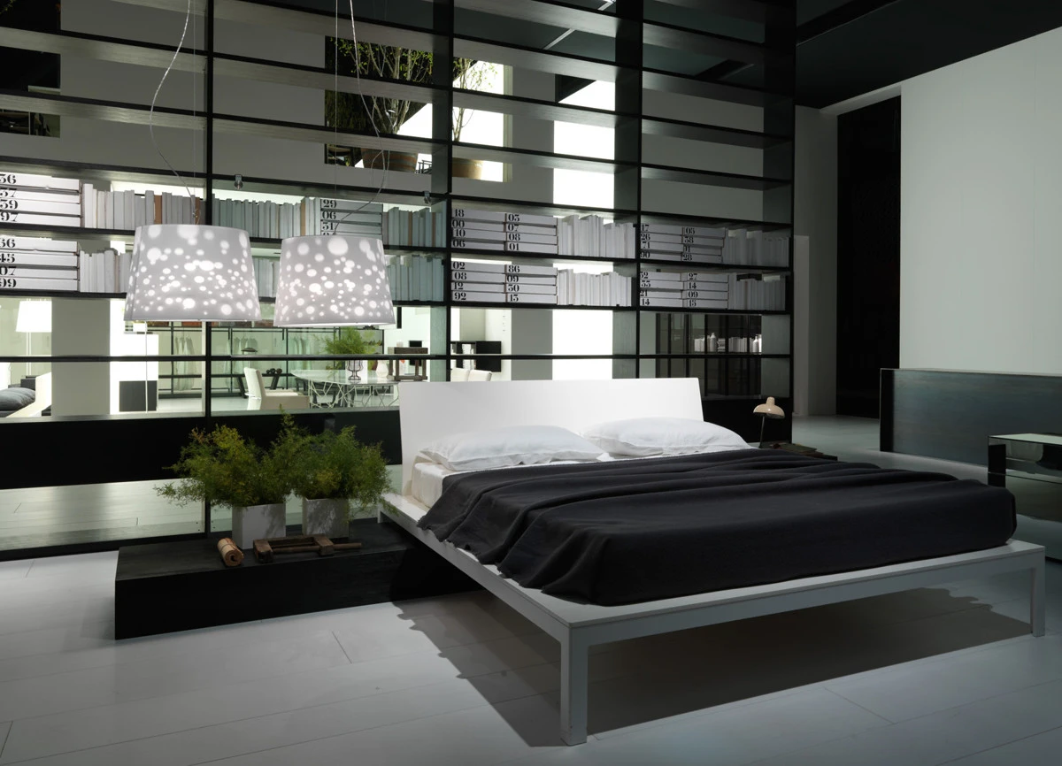 System 2010 è presentata in un’importante composizione bifacciale total black in hemlock tinto nero con 2 ante scorrevoli in cristallo trasparente e chiusure con ante a ribalta in laccato nero opaco, essa funge da quinta prospettica che scandisce visivamente, senza separare, gli ambienti giorno su cui si affaccia.