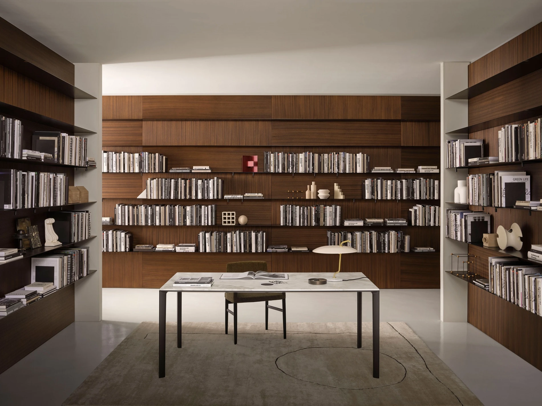 Nata come libreria completamente bianca che scompare alla parete creando l’effetto di una successione di libri sospesi in aria, modifica il suo look negli anni accogliendo nuovi materiali e finiture senza perdere riconoscibilità e forza espressiva di un gesto progettuale tanto semplice quanto radicale.