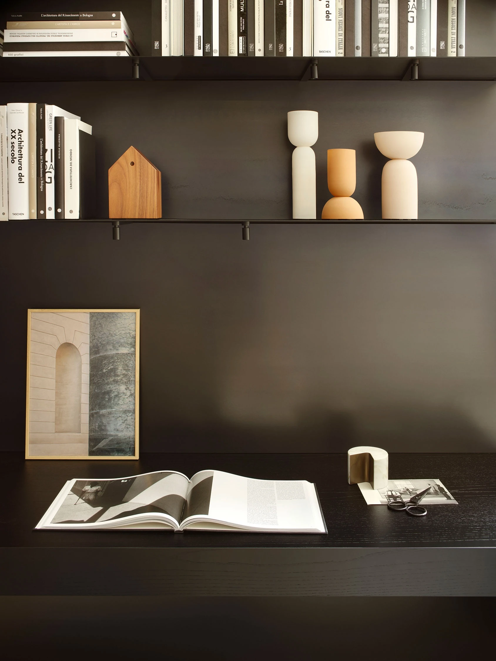 Abbinata al piano scrittoio Modern in frassino tinto nero, la libreria Load-it monomaterica con mensole e pannelli in acciaio veste la superficie dando carattere all’ambiente. Per valorizzare uno spazio di passaggio dando vita ad una libreria con postazione home-working e illuminazione integrata, grazie ai faretti con attacco magnetico posizionabili a piacere lungo il profilo elettrificato presente sotto la mensola.