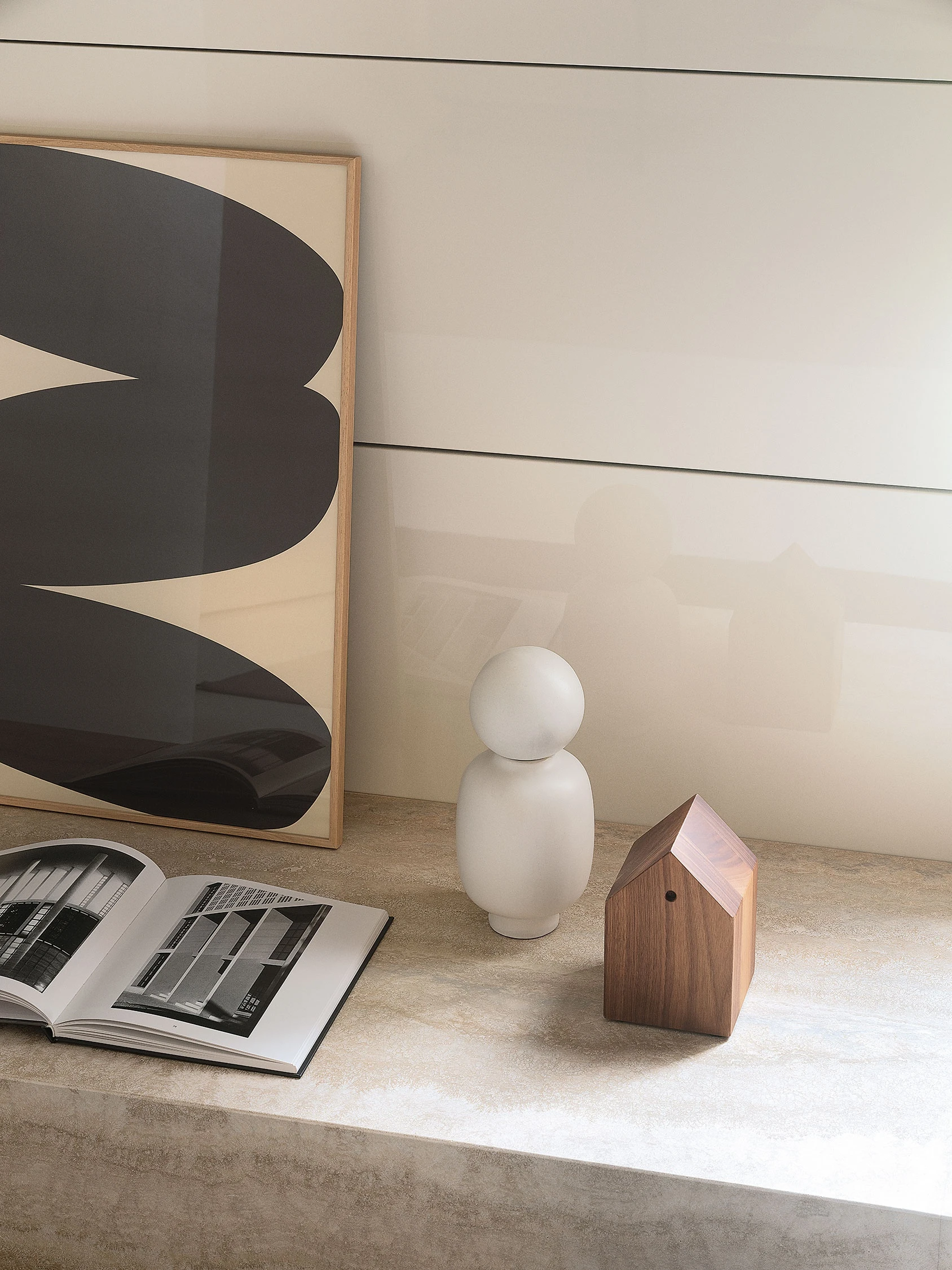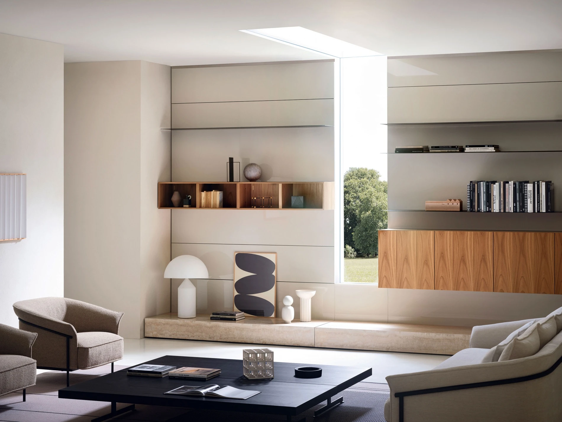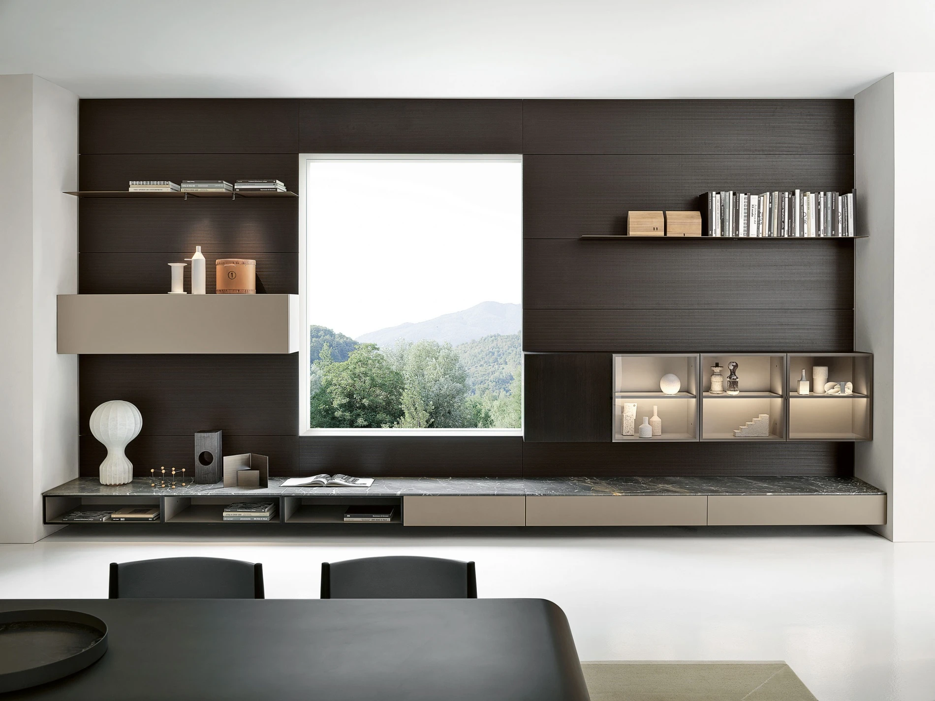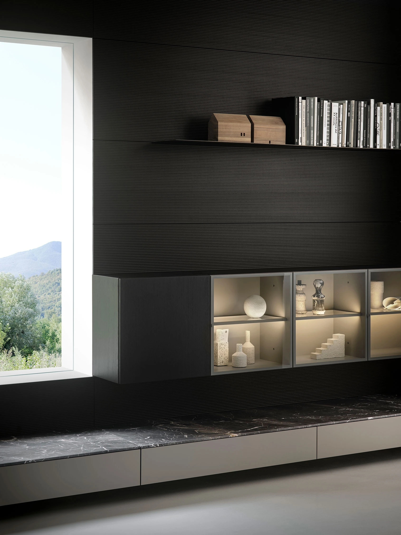 La Libreria Load-it con mensole in acciaio e pannelli a muro in canneté tinto nero incornicia la finestra centrale e genera un fondale grafico da cui si staglia e in cui si muove il modulo quadrato di Modern, sviluppando oggetti diversi per materiali, colori e destinazioni funzionali. Un elemento pensile con anta a ribalta laccato sabbia opaco sulla sinistra e 4 moduli pensili in hemlock tinto nero con anta a battente in essenza o in cristallo con profilo metallico, che lasciano intravvedere gli interni colorati. Infine, funzionale alle attrezzature home video, la pedana in marmo Grey Valentine, che alterna vani a vista a pratici cassetti con ante in laccato sabbia.