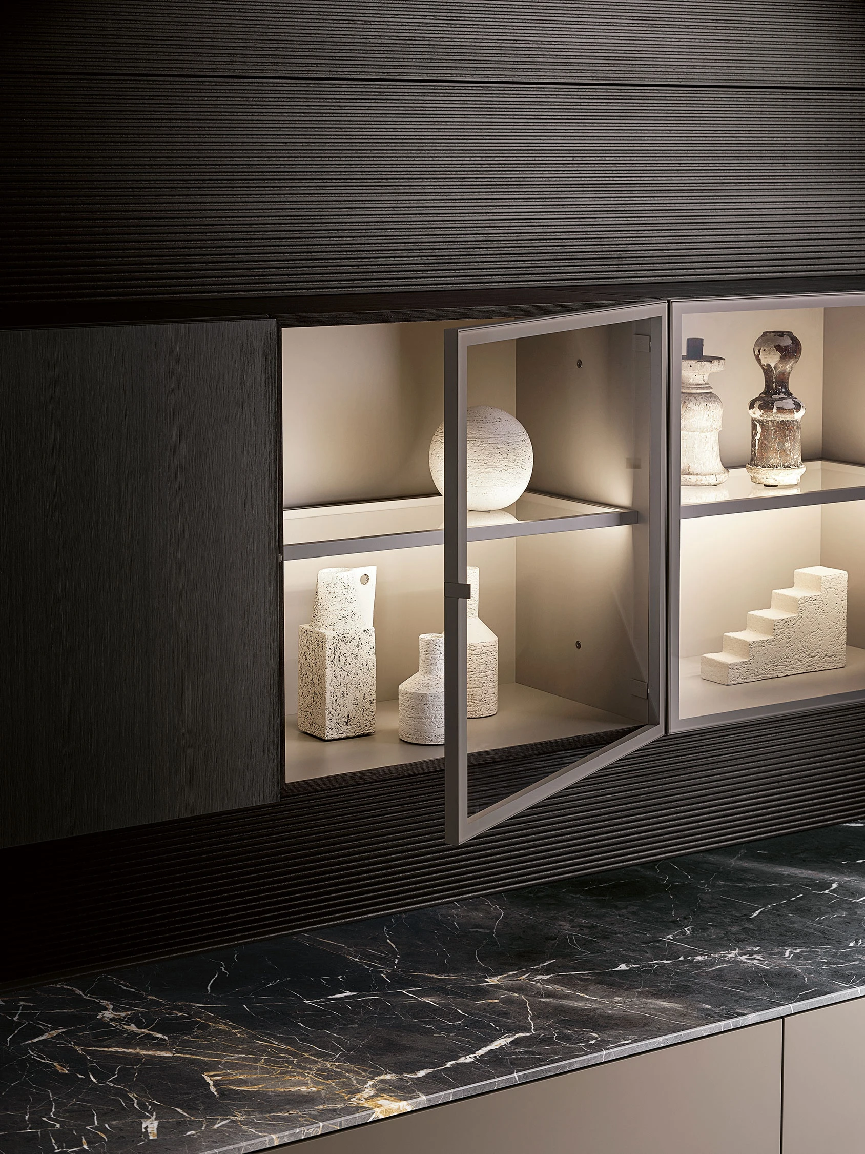 Composizione Modern+Load-it con modulo pensile laccato opaco sabbia, vetrina in hemlock tinto nero con interni laccato opaco sabbia, pedana in marmo valentine grey, pannelli in canneté tinto nero e mensole in acciaio.