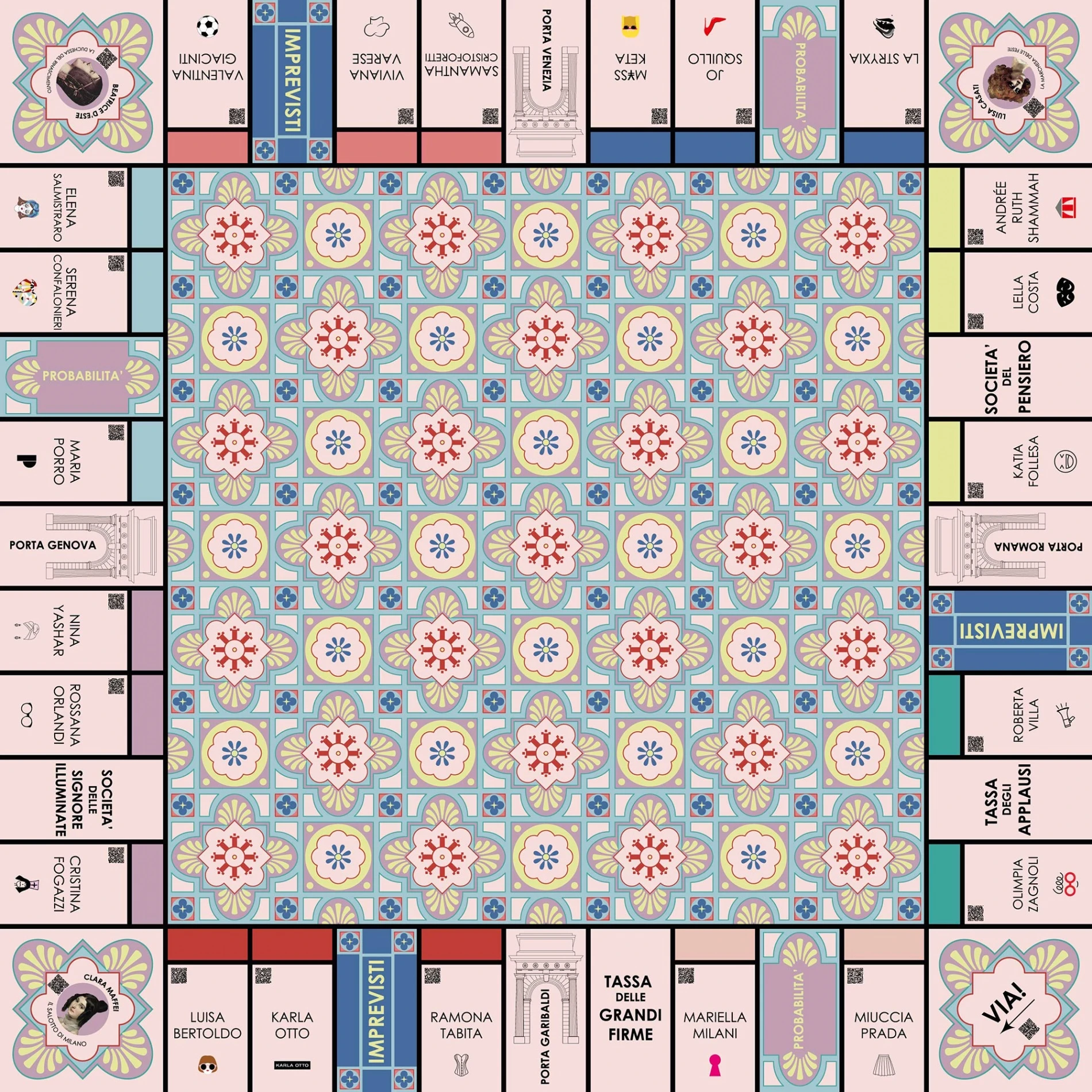 La scenografia riprende tutti gli elementi del gioco ed è stata concepita per fotografarsi e interagire con essa: dalle pedine con i simboli della “milanesità” come il panettone, ai dadi oro e rosa, al tabellone, alle banconote colorate che riprendono in chiave grafica i principali monumenti della città.