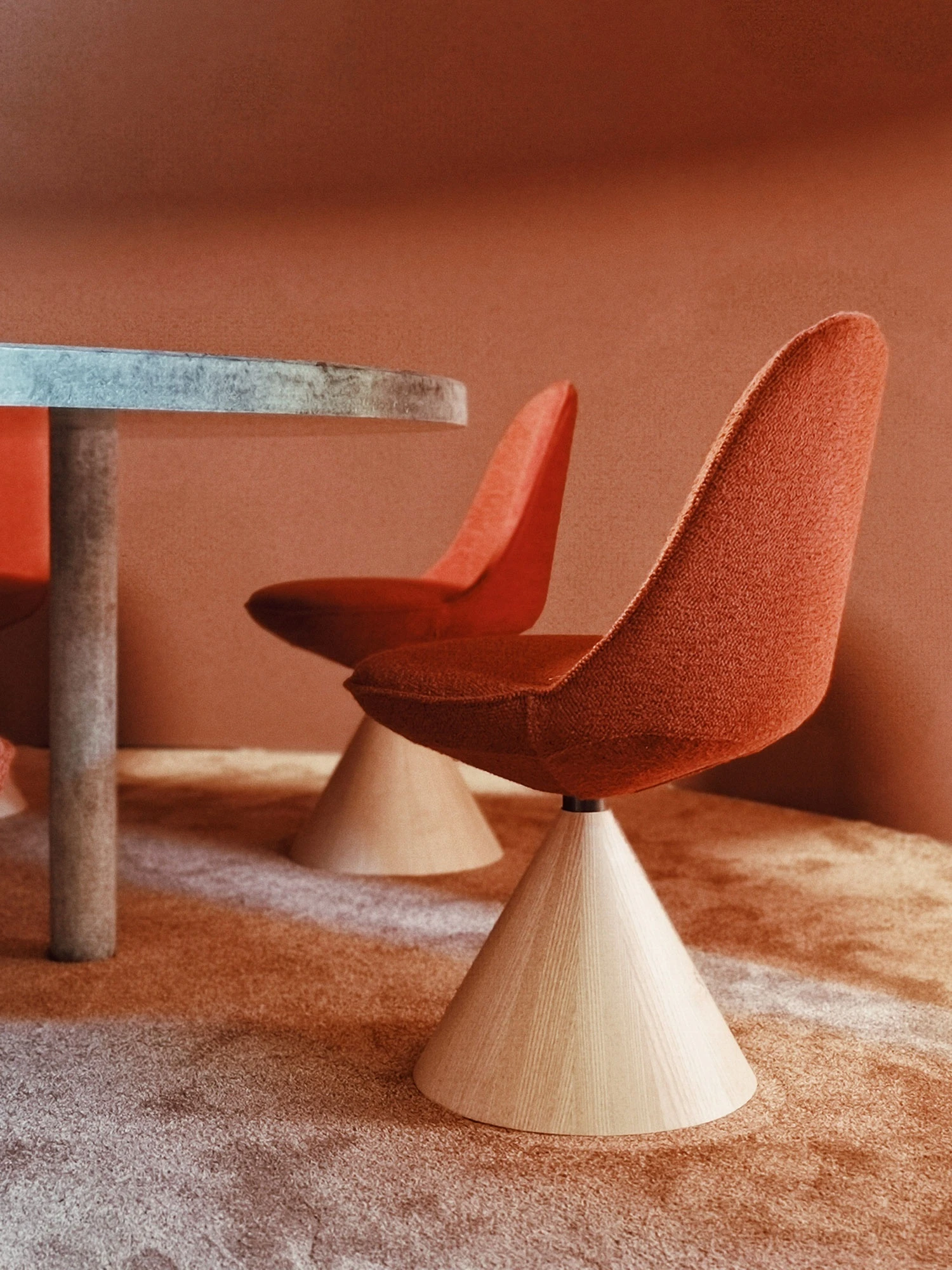La sedia Romby è costituita da due diversi elementi in equilibrio tra loro: la seduta, realizzata rivestita in tessuto o pelle, e la base inferiore conica in legno massello di frassino, realizzata a spicchi.