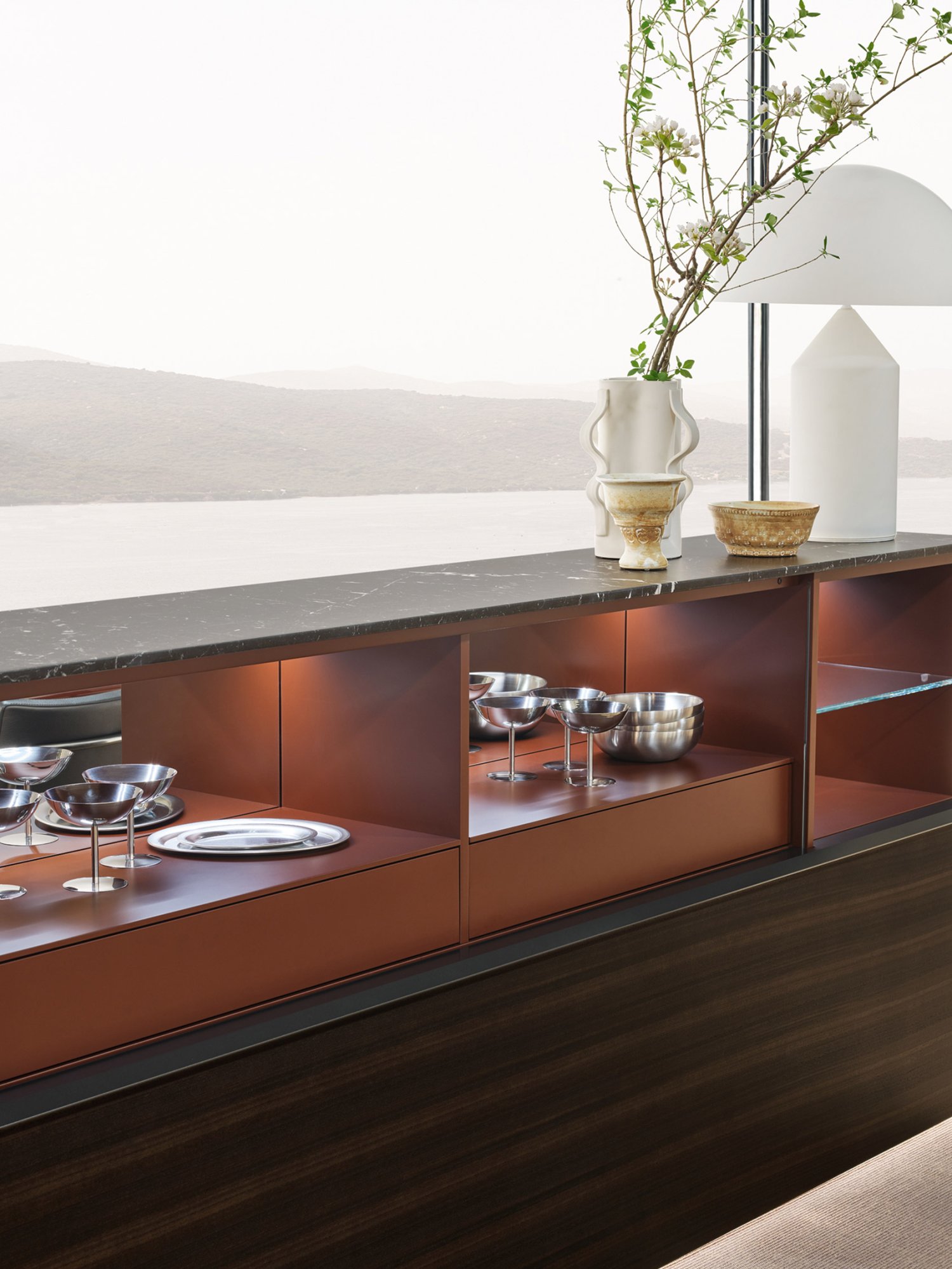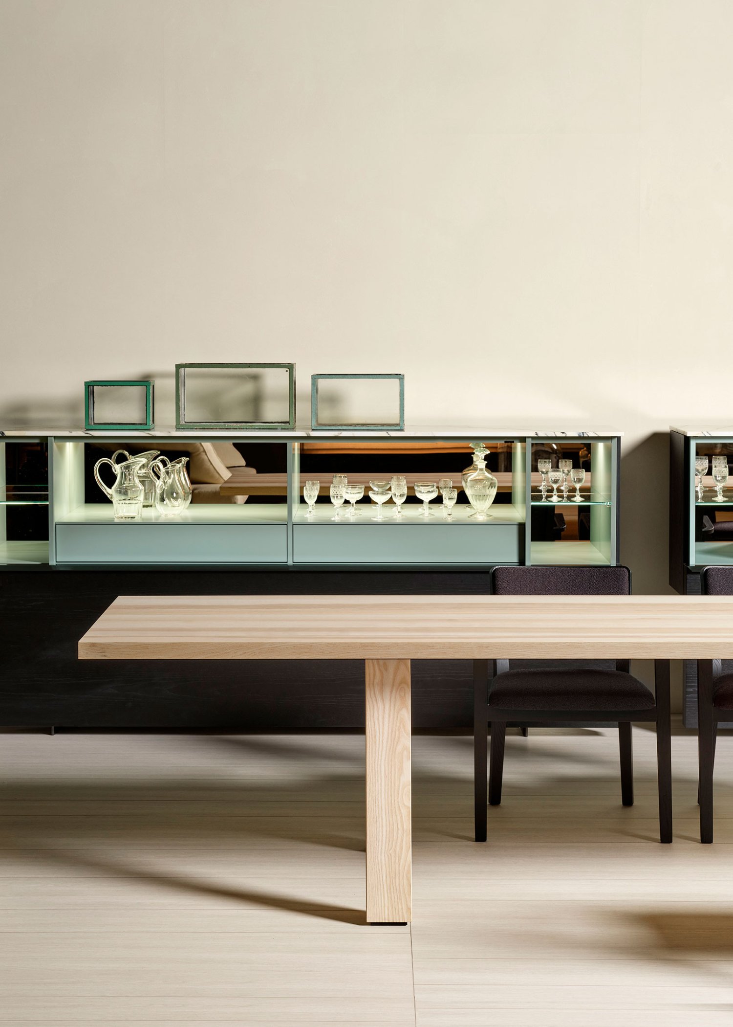 L'anta scorrevole scopre un interno ricco e funzionale, adatto a riporre stoviglie e a fungere come mobile bar. Il fascino di questa madia risiede anche nel peculiare effetto creato dal fondale a specchio che regala luminosità e preziosità agli interni in laccato opaco, in uno dei colori della collezione.