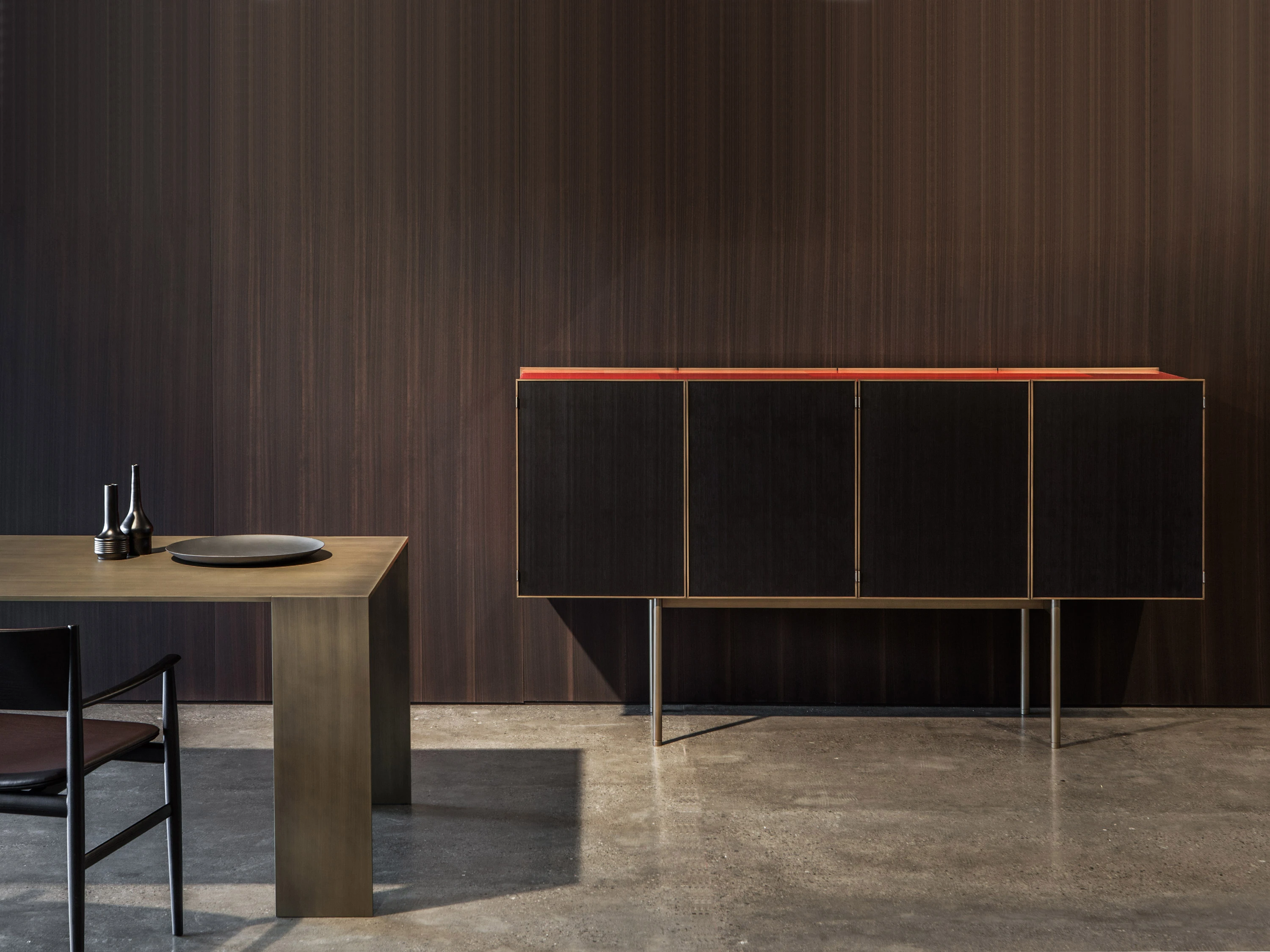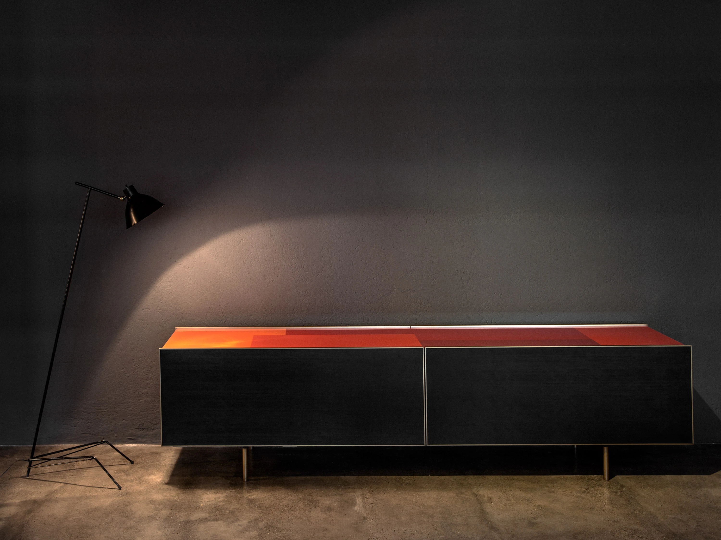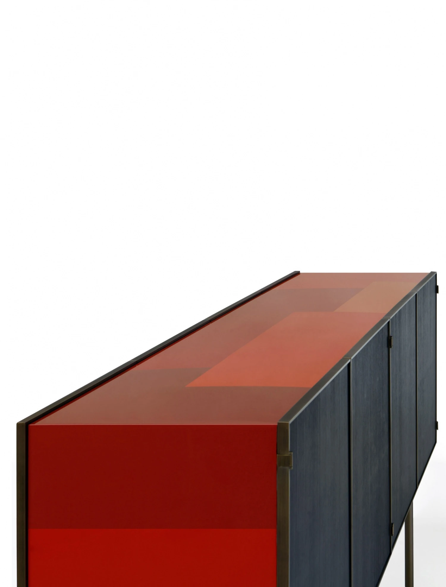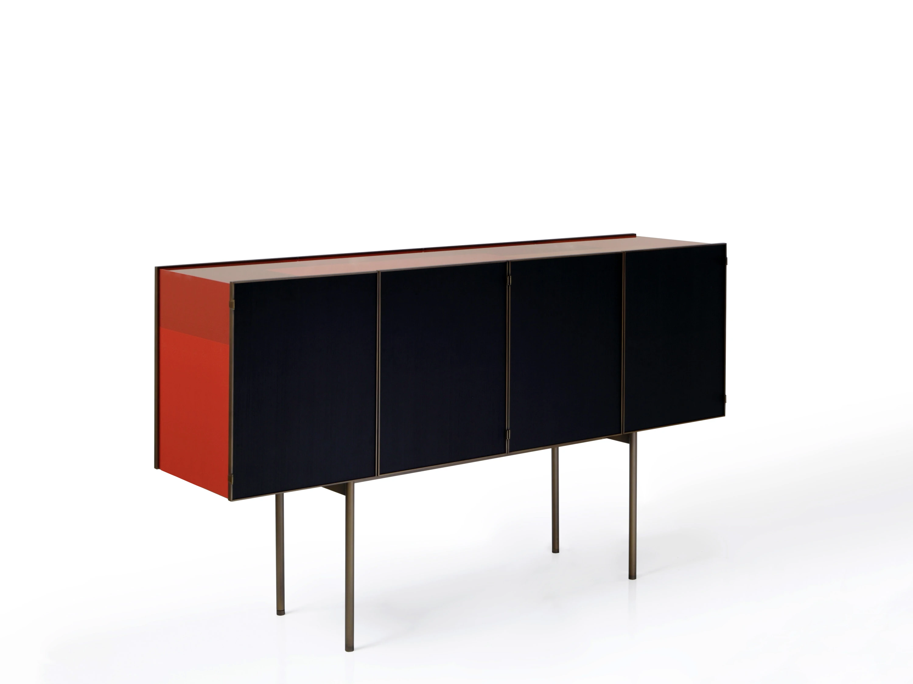 Ipercolore è una piccola famiglia di madie rialzate su piedi in metallo che giocano sul contrasto tra il loro disegno pulito e minimale e l’esuberanza materica, un melting pot di colori che incanta per il fascino dell'accostamento cromatico e la preziosità della lacca lucida. Caratterizzate dalle garbate proporzioni e dal colore brillante e profondo sono declinate in due formati: una madia complanare bassa, ideale per il living o la camera da letto, e una madia più alta a 4 ante battenti, perfetta nel dining per riporre stoviglie ed oggetti. La struttura e i frontali sono in hemlock tinto nero mentre il colore mostra tutto il suo fascino sul top e sui fianchi nelle gradazioni dall'arancio fino al rosso. Il profilo delle ante e i piedini sono in invece ottone brunito.