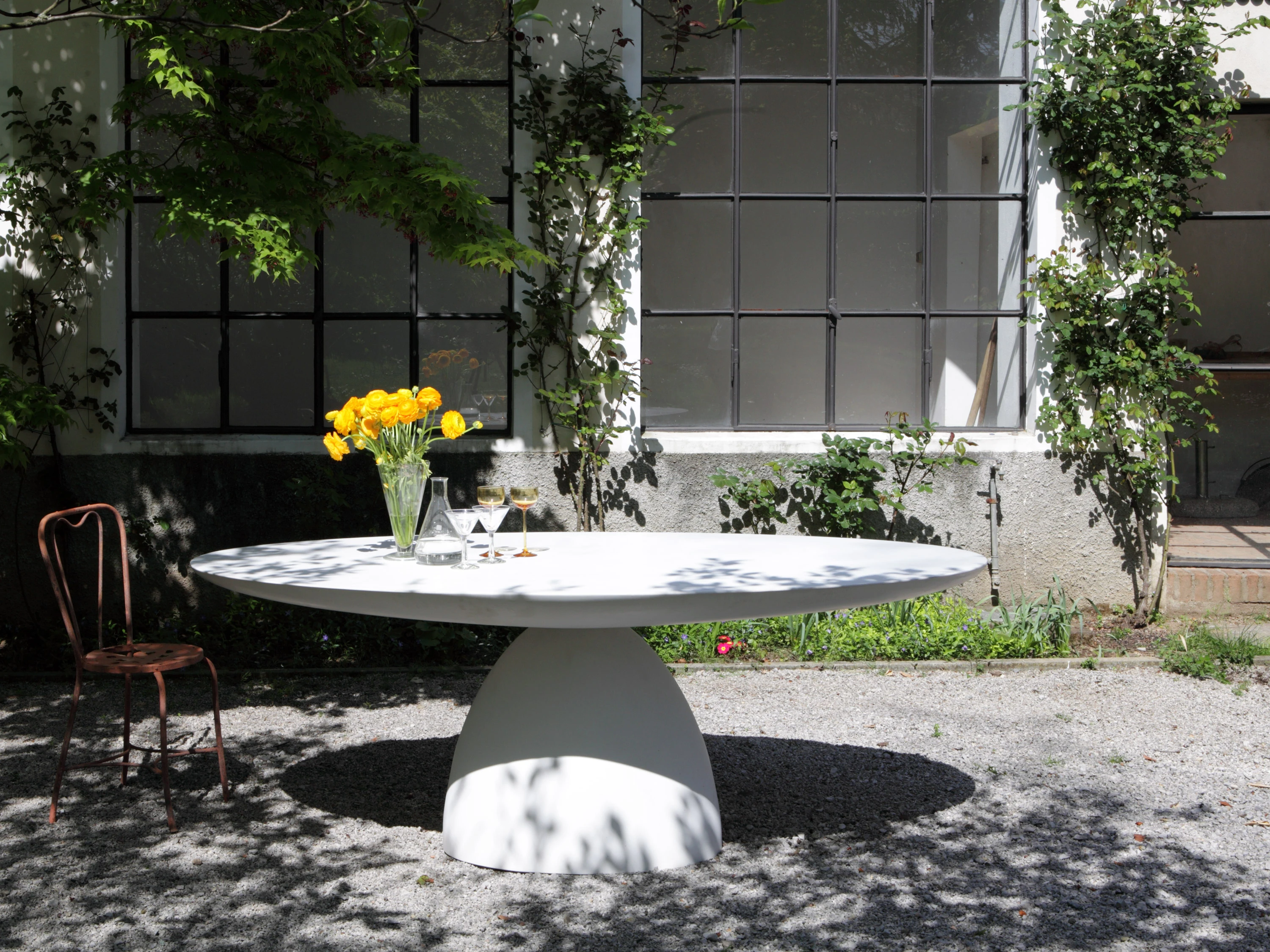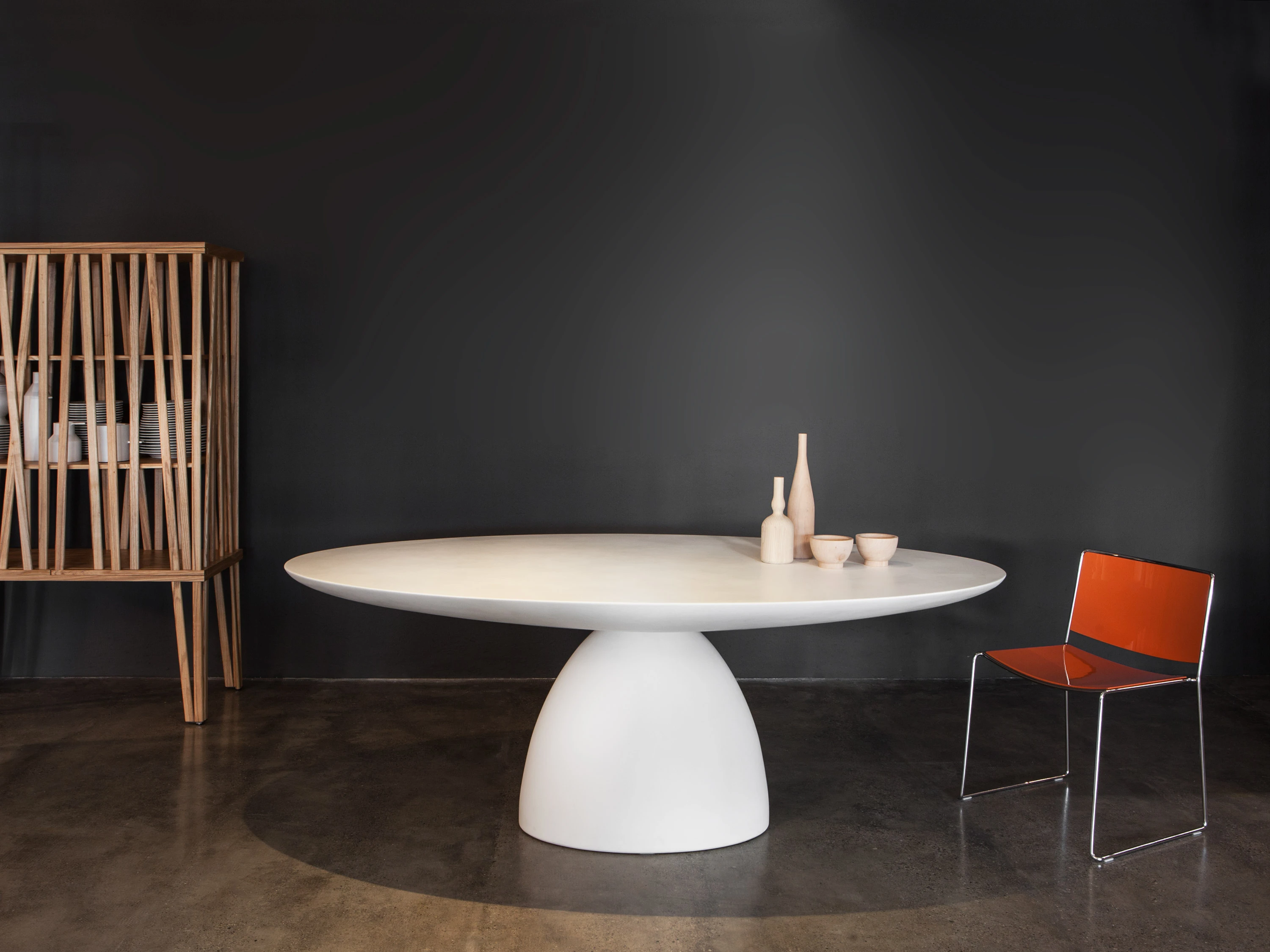 Il tavolo Ellipse Table è una vera e propria scultura nata dall’incontro di due volumi: il piano e il basamento sono due ellissi regolari in equilibrio l'una sull'altra, che sperimentano un appoggio ardito su superfici curve. Ellipse Table è un tavolo dal design forte e unico, studiato in una proporzione adatta ad ogni casa, che accoglie comodamente dalle 6 alle 8 persone. Realizzato in Dulver®, Ellipse Table è un originale e funzionale tavolo per la zona pranzo ed allo stesso tempo un arredo per esterni di grande carattere e proporzioni scultoree. Il Dulver® e un materiale solid surface riciclabile al 100%. Caratterizzato da un peso specifico pari a 0,97 Kg/dm3, presenta una superficie dura ma calda e vellutata al tatto. Dulver è inoltre resistente agli shock termici, idrorepellente e resistente agli acidi. La completa atossicita ne completa le proprieta definendolo ulteriormente come materiale ecologico ideale per essere utilizzato in ogni ambiente domestico.