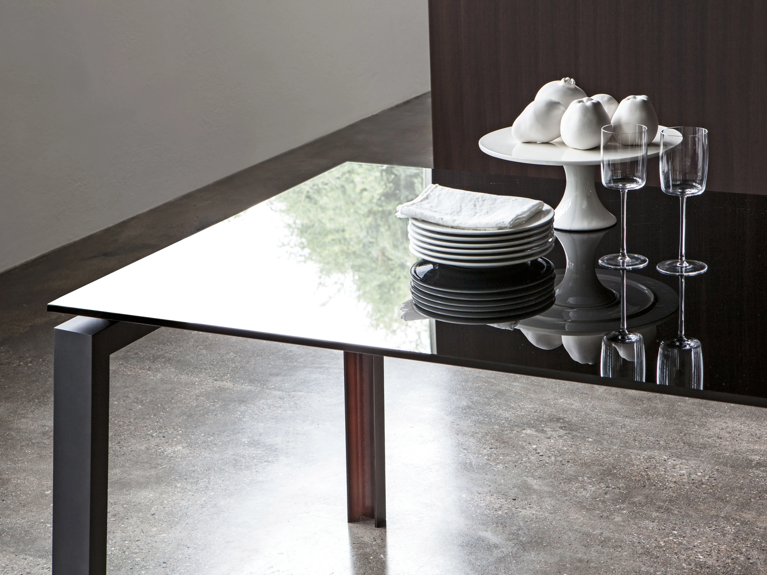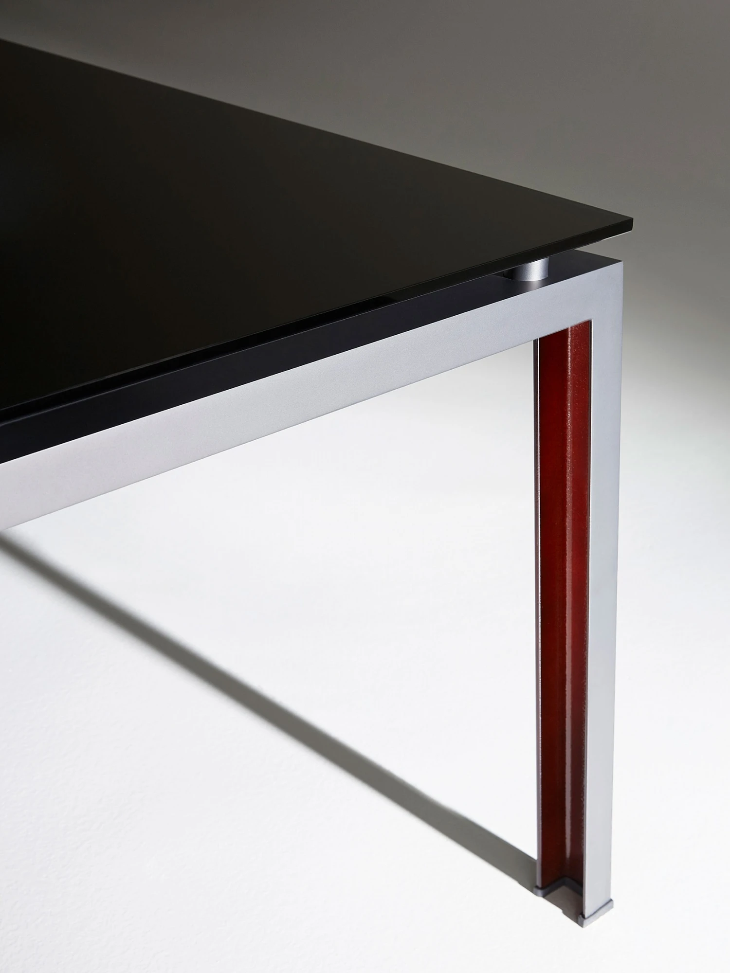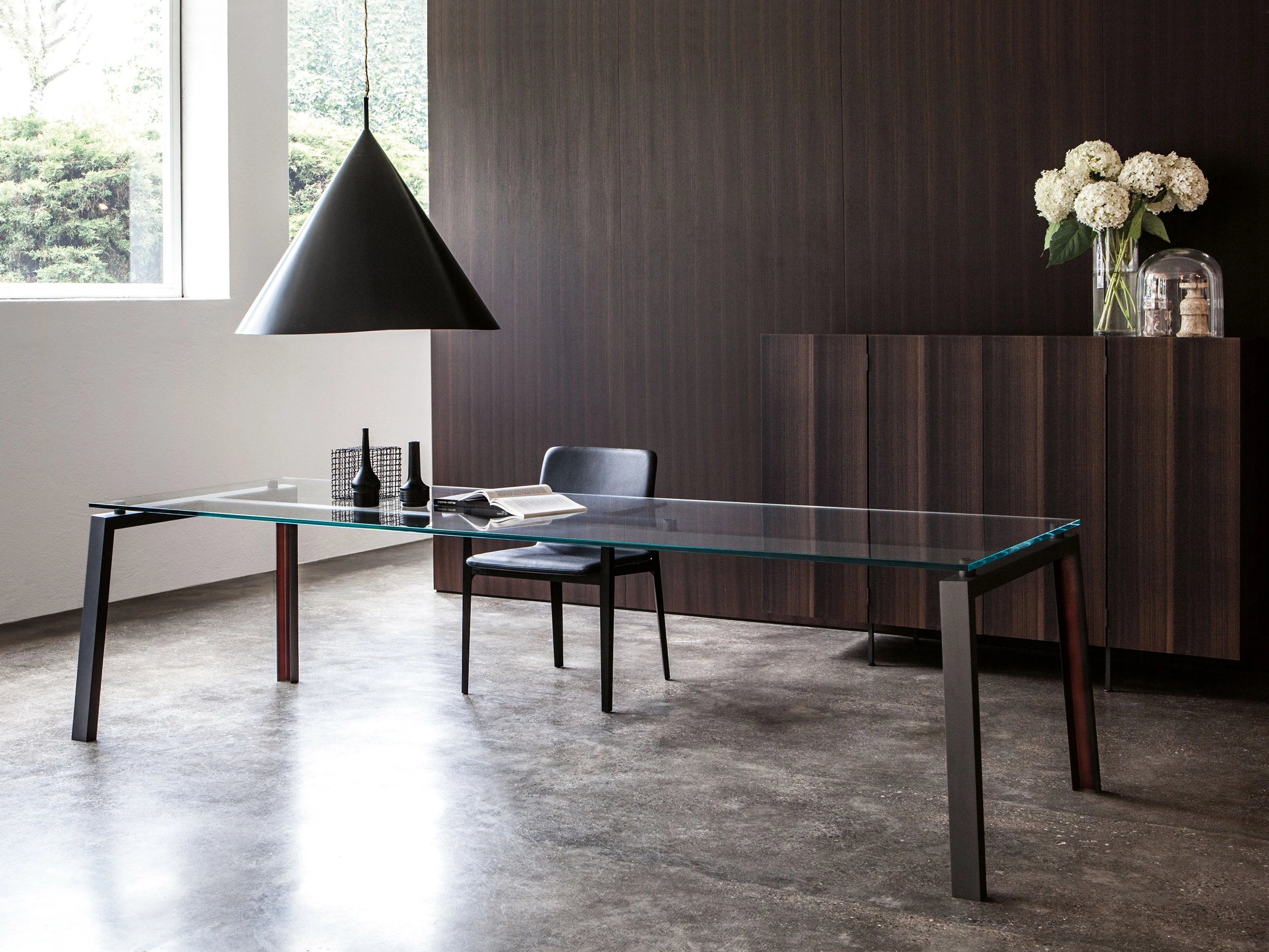 Funzionale, tecnologico, multiuso, Ipe è il tavolo dall’estetica raw, con piano in cristallo o legno e gamba ad U in ferro verniciato nero. Silhouette austera e industriale, si concede un vezzo: l’interno della gamba è color ruggine, un ingrediente segreto, pensato per stupire.