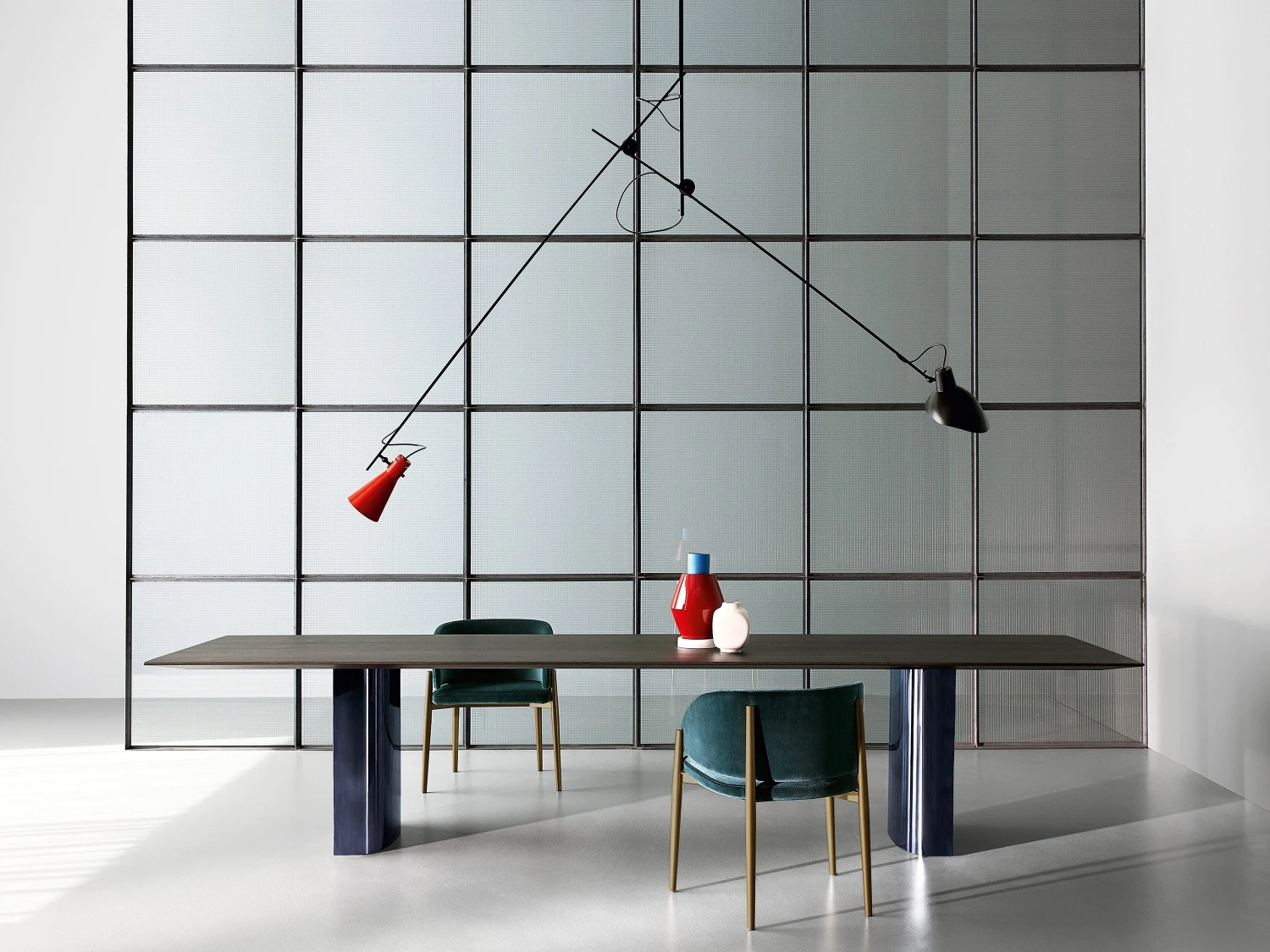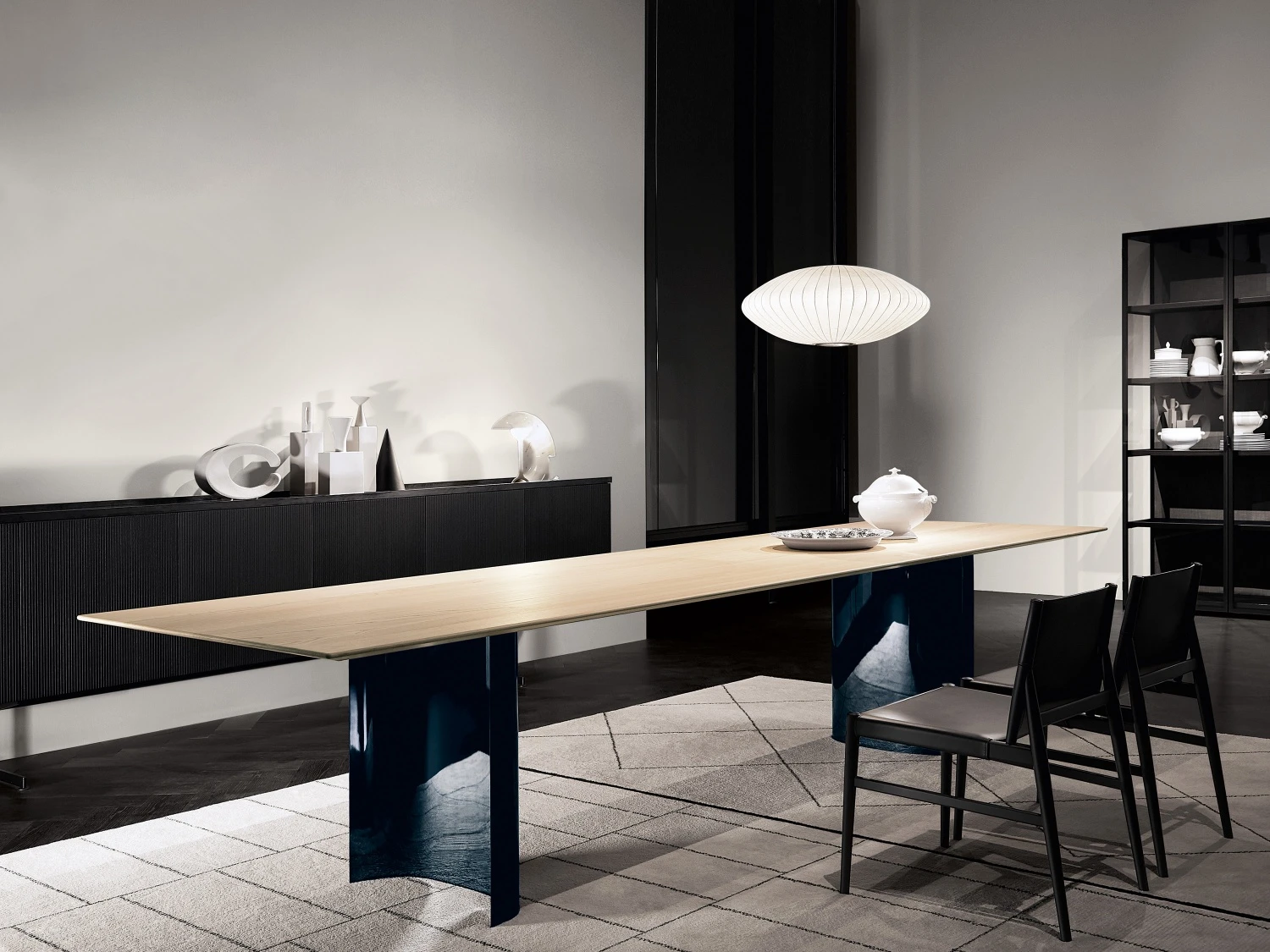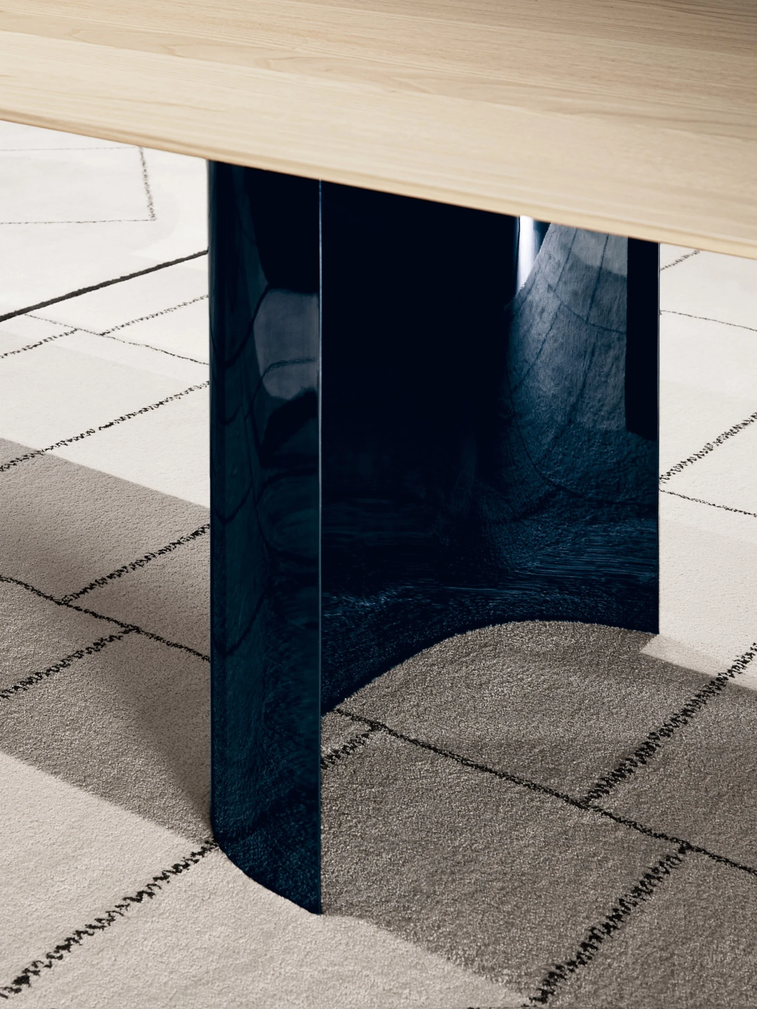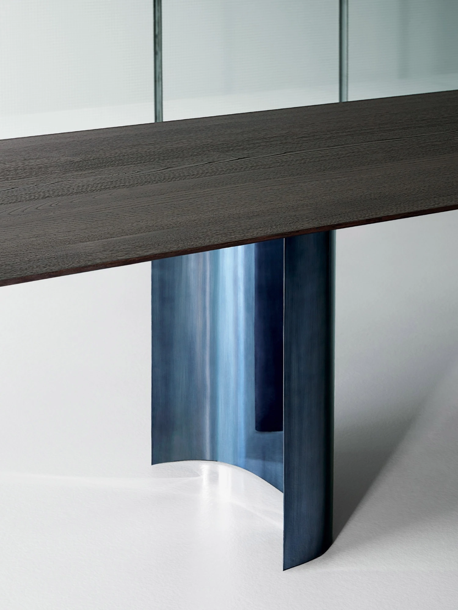 Il tavolo Jeff, design Oscar e Gabriele Buratti, segue la fascinazione della reazione tra superfici specchianti, un tema intrigante tipico di svariati percorsi artistici contemporanei tra minimalismo e massimalismo. Il piano slanciato in massello di castagno o nei legni della collezione appare sospeso sulle due basi centrali, la cui particolare geometria, una semicurva aperta, viene rifinita manualmente, innescando effetti di riflessione in continua mutazione. Il piano, realizzato in doghe selezionate di massello di castagno naturale, tinto moro, tinto nero, o nei legni della collezione si caratterizza per la particolare lavorazione del bordo rastremato che conferisce al piano, dallo spessore importante, grande leggerezza. Un ulteriore smusso su tutto il perimetro addolcisce gli spigoli creando sui quattro angoli una piccola sfera.