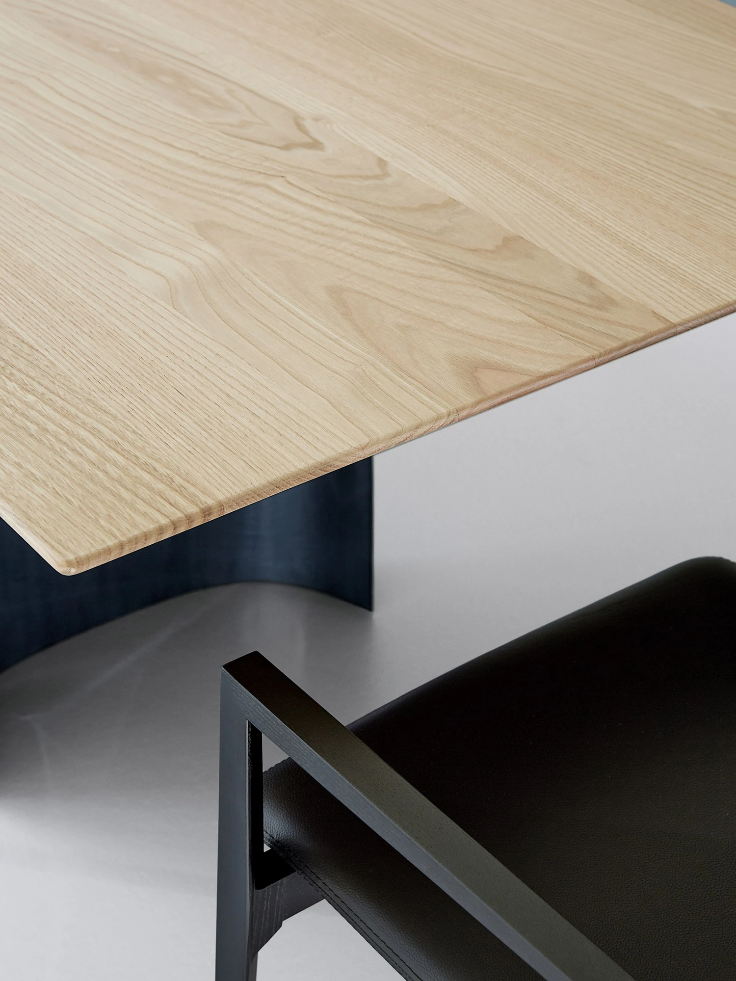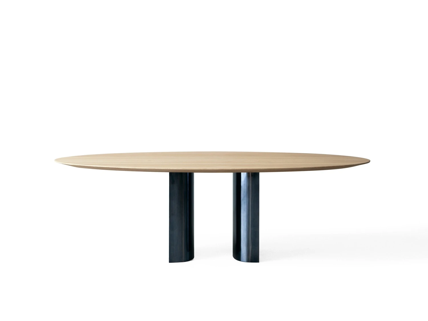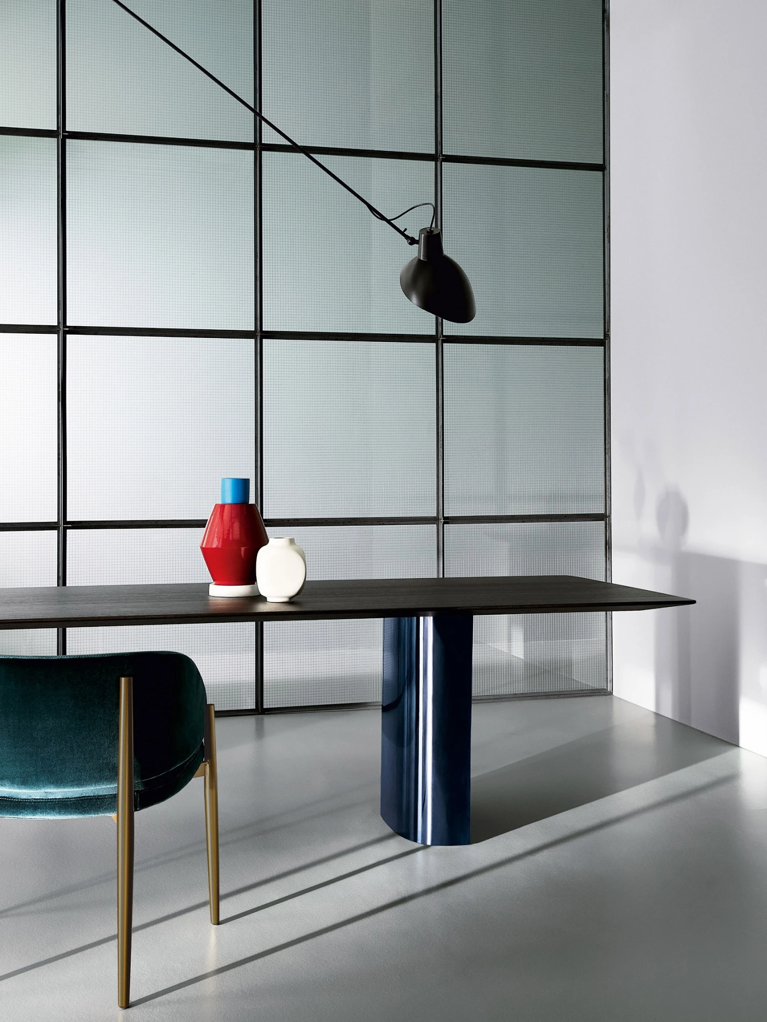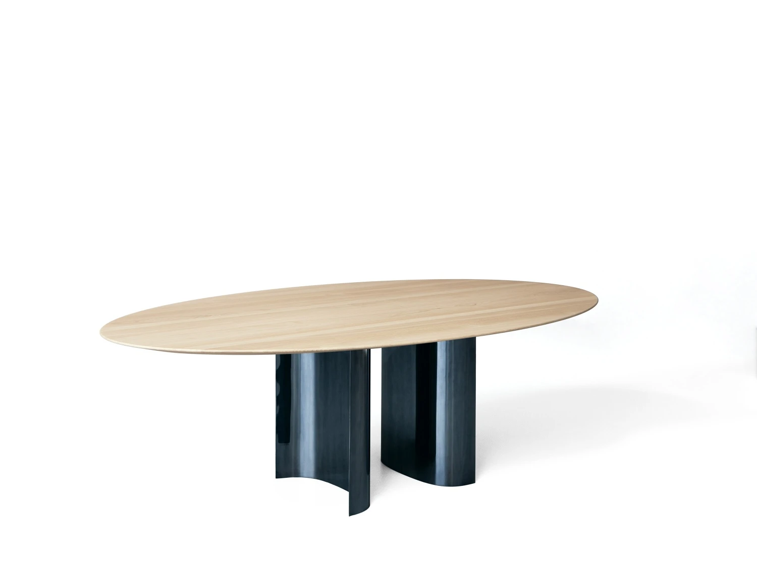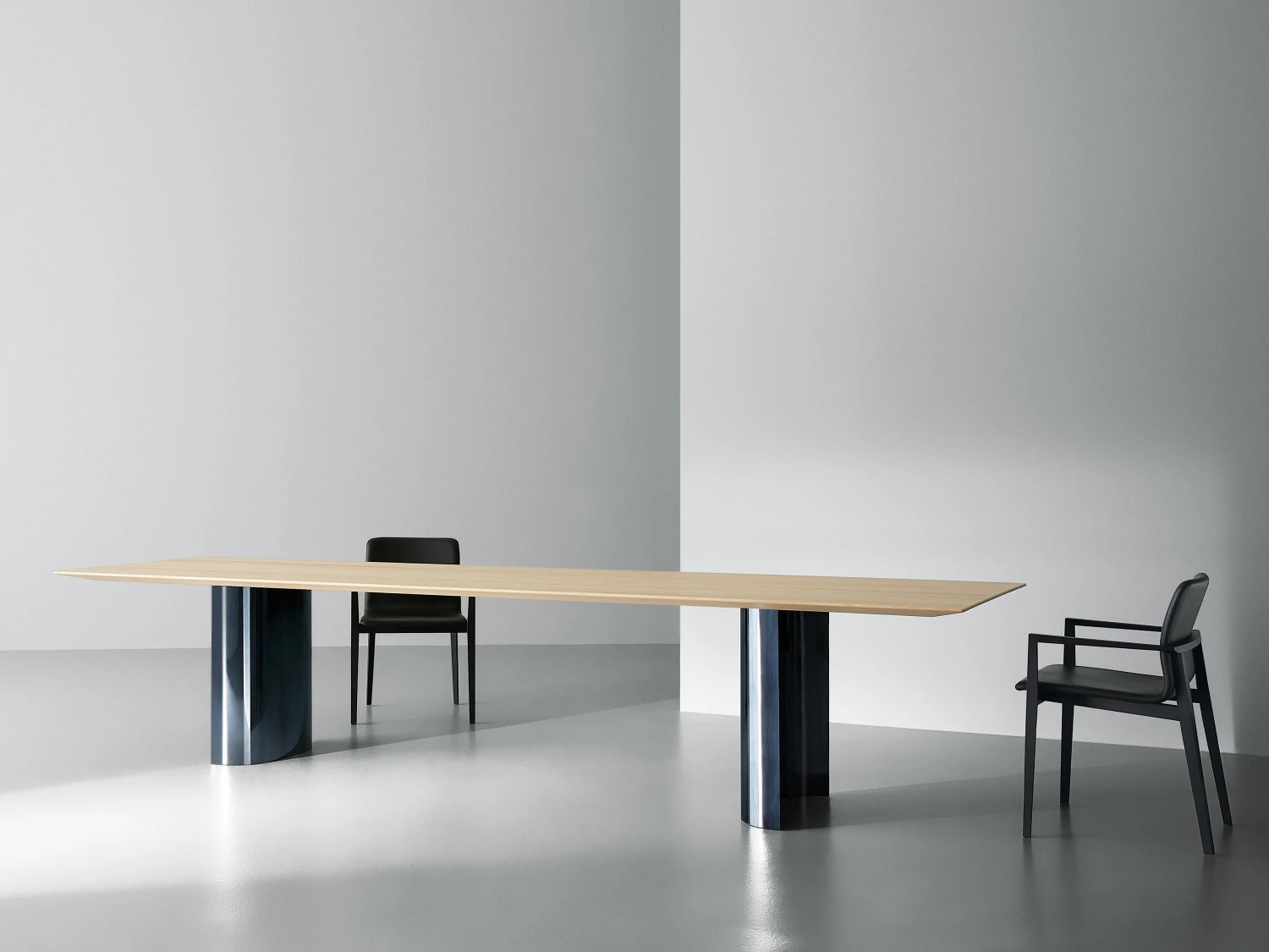 Il tavolo Jeff, design Oscar e Gabriele Buratti, segue la fascinazione della reazione tra superfici specchianti, un tema intrigante tipico di svariati percorsi artistici contemporanei tra minimalismo e massimalismo. Il piano slanciato in massello di castagno o nei legni della collezione appare sospeso sulle due basi centrali, la cui particolare geometria, una semicurva aperta, viene rifinita manualmente, innescando effetti di riflessione in continua mutazione. Il piano, realizzato in doghe selezionate di massello di castagno naturale, tinto moro, tinto nero, o nei legni della collezione si caratterizza per la particolare lavorazione del bordo rastremato che conferisce al piano, dallo spessore importante, grande leggerezza. Un ulteriore smusso su tutto il perimetro addolcisce gli spigoli creando sui quattro angoli una piccola sfera.