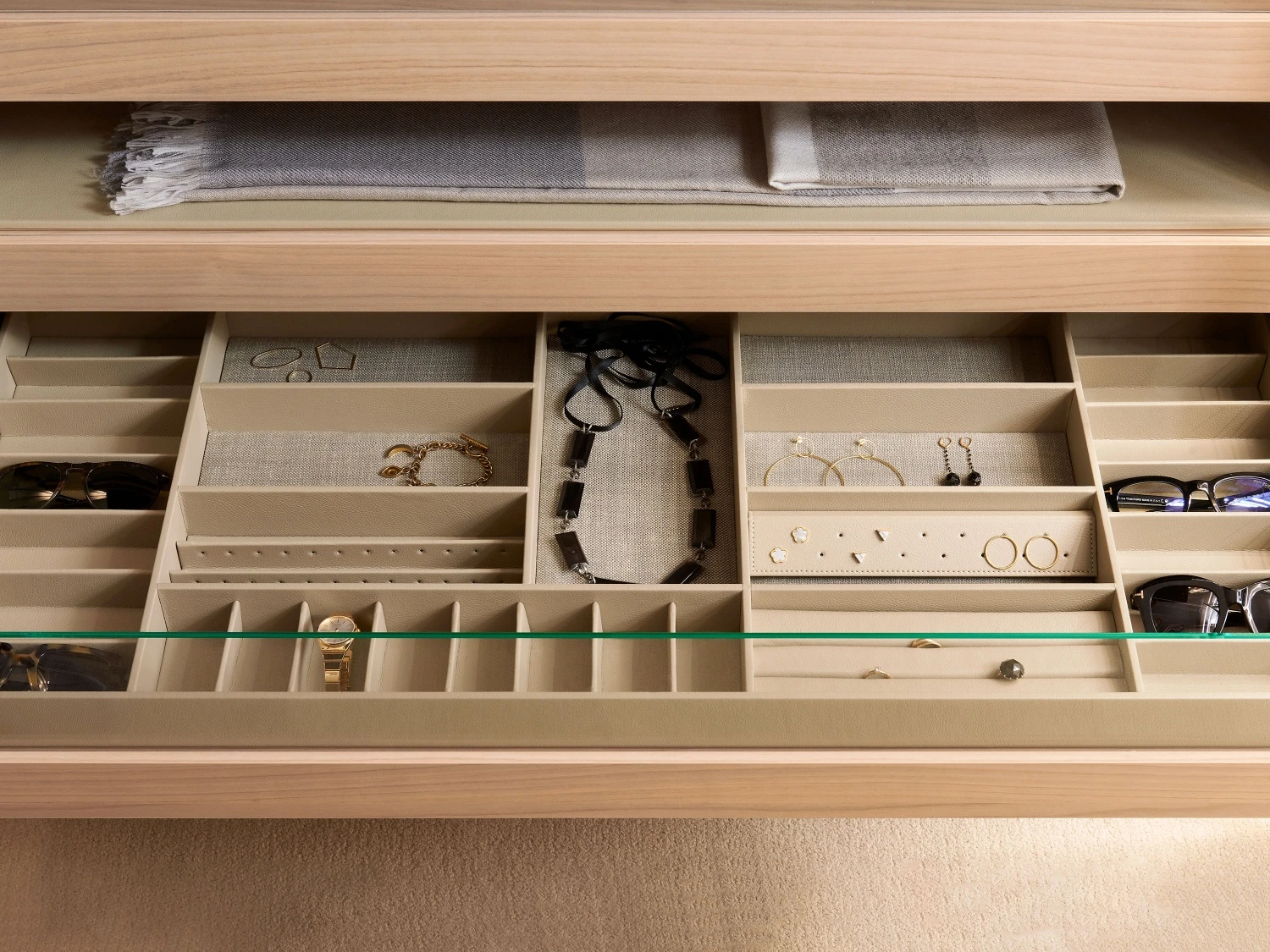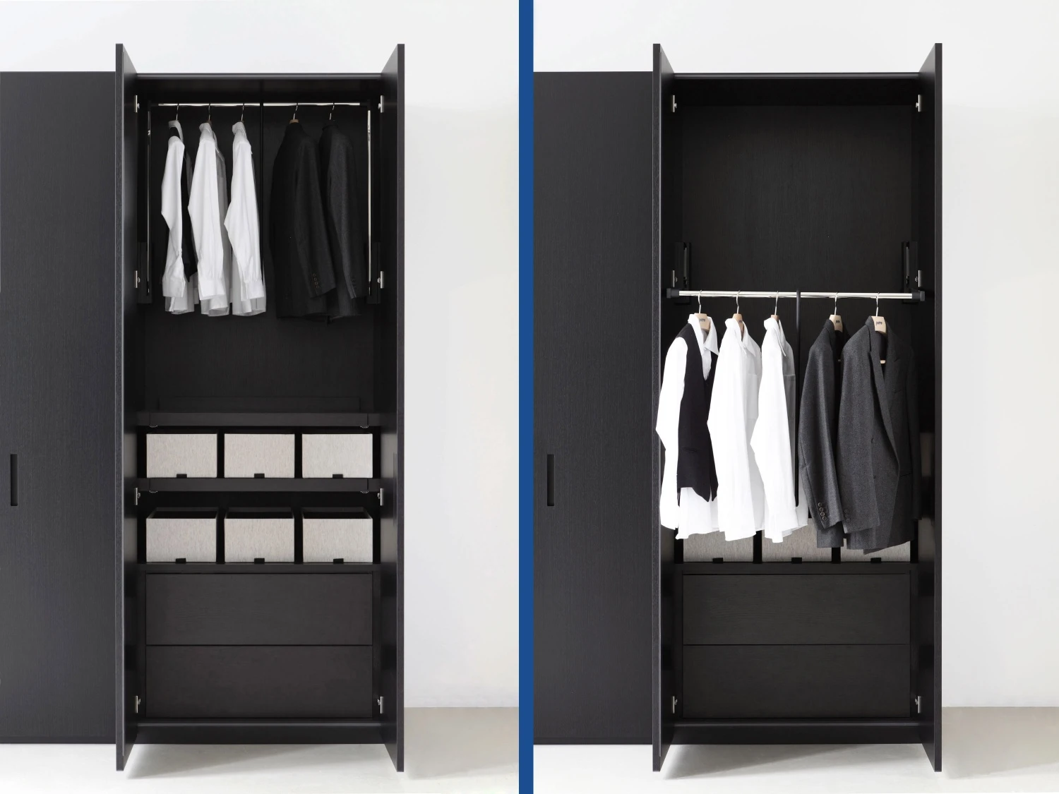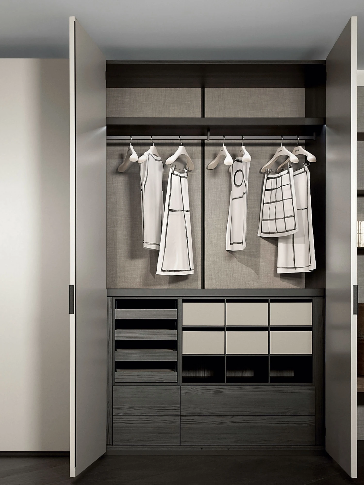 Il sistema Storage si completa con una vasta e pratica gamma di attrezzature interne. Disponibili in tutte le finiture della struttura, sono previste per tutte le larghezze di modulo.