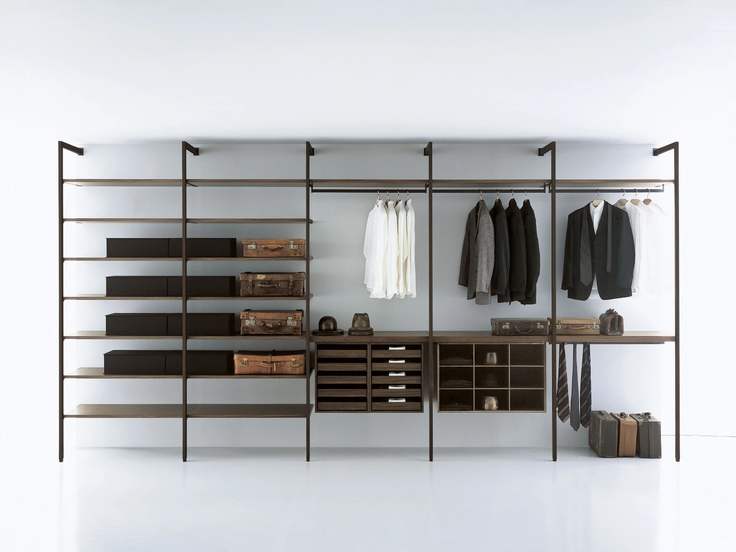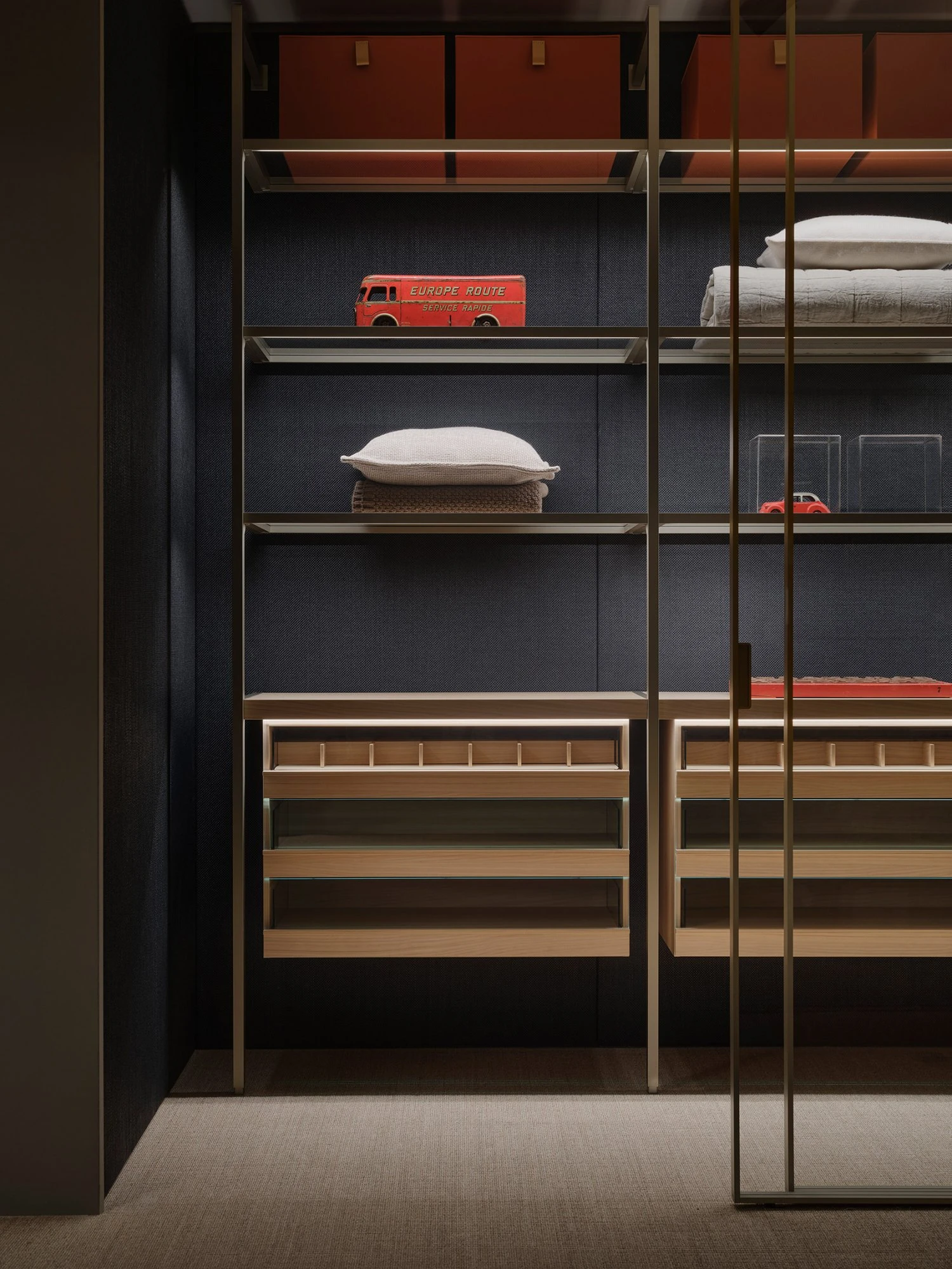 Con ben tre diverse concezioni di struttura dell’armadio, Storage è il primo sistema modulare che permette la continuità dello spazio in tutto l’armadio. L’innovazione nasce dalla nuova concezione dell’elemento portante della struttura. Da sempre visto e concepito come separatore di parti nell’armadio, con Storage il fianco non è più una barriera, ma diviene l’elemento che permette la continuità aerea all’interno dell’armadio, pur risolvendo brillantemente la sua funzione di elemento portante della struttura e di supporto agli elementi orizzontali. All’interno dell’armadio il concetto di spazio acquista un nuovo valore. Grazie alle tre diverse tipologie di struttura, walk-in closet, armadio tradizionale, boiserie, ora perfettamente integrabili tra loro, è possibile creare spazi aperti o spazi chiusi alternando materiali diversi per soluzioni trasparenti e non.