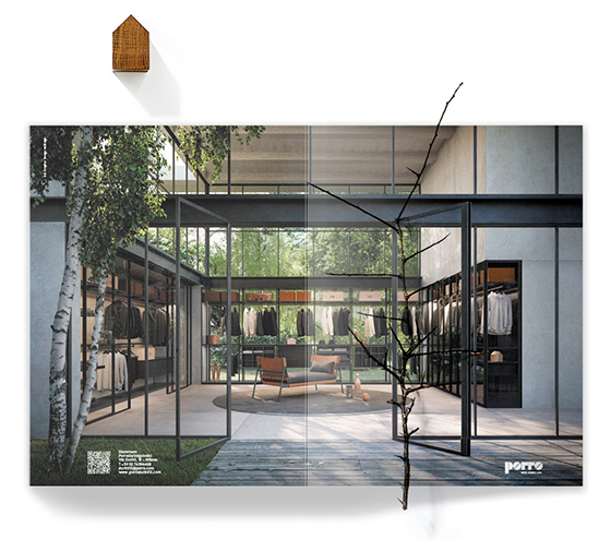 Porro’s new advertising image debuts on the gatefold front cover of Interni magazine, January-February 2022: a house surrounded by nature designed by Piero Lissoni,