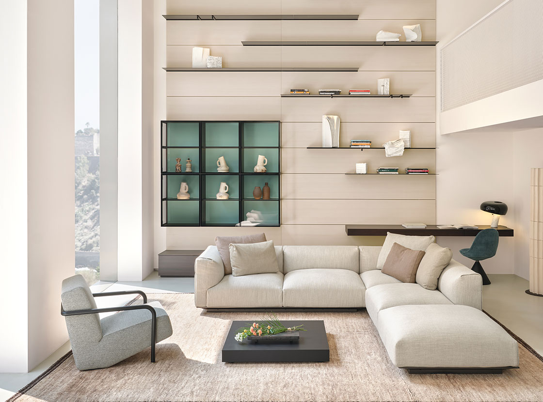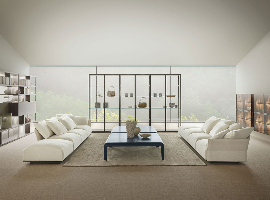 Designed to offer a deeply enveloping comfort experience, the Tobu sofa rests directly on the floor, with a solid base — available in upholstered or lacquered versions — onto which backrests and armrests with their distinctive wing-like shape are fitted, upholstered in either leather or fabric.