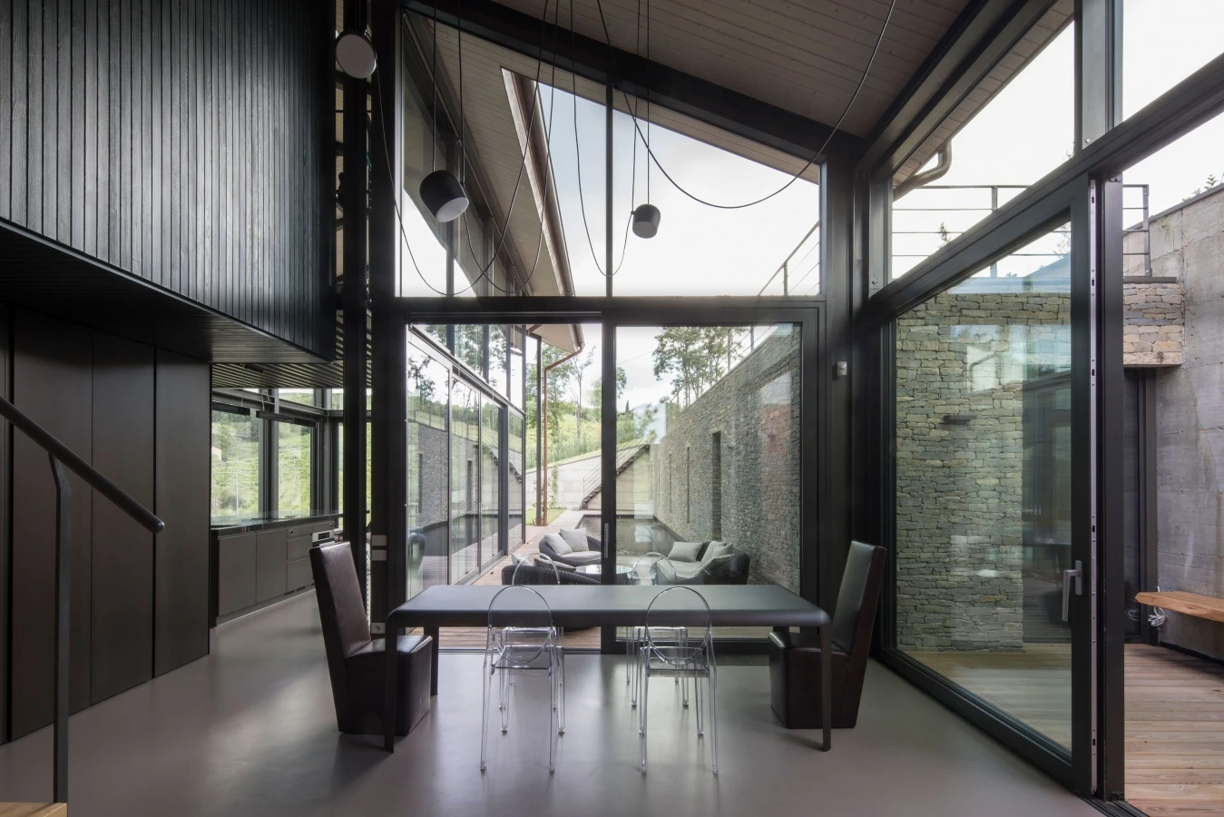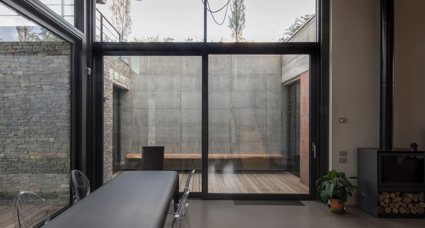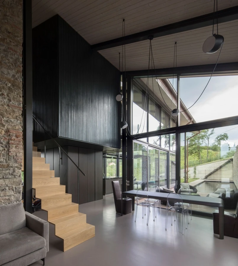 The new expansion was imagined as a transparent volume with large sliding windows supported by an exposed steel structure: a double-height space that hosts the dining area where the essential and iconic Ferro table by Piero Lissoni for Porro fits perfectly, with its curved shape inspired by nature. For dining and carrying out daily activities immersed in the surrounded hilly landscape.
