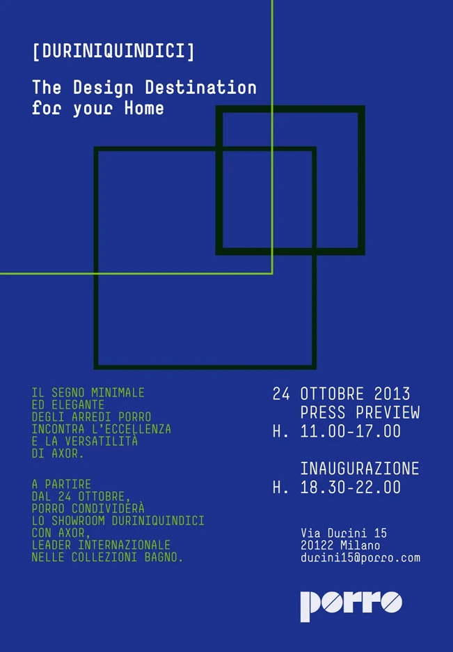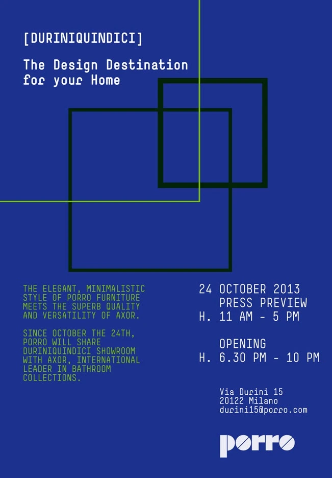 The elegant, minimalistic style of Porro furniture meets the super quality and versatility of Axor. Since Octorber the 24th, Porro will share Duriniquindici showroom with Axor, international leader in bathroom collection.