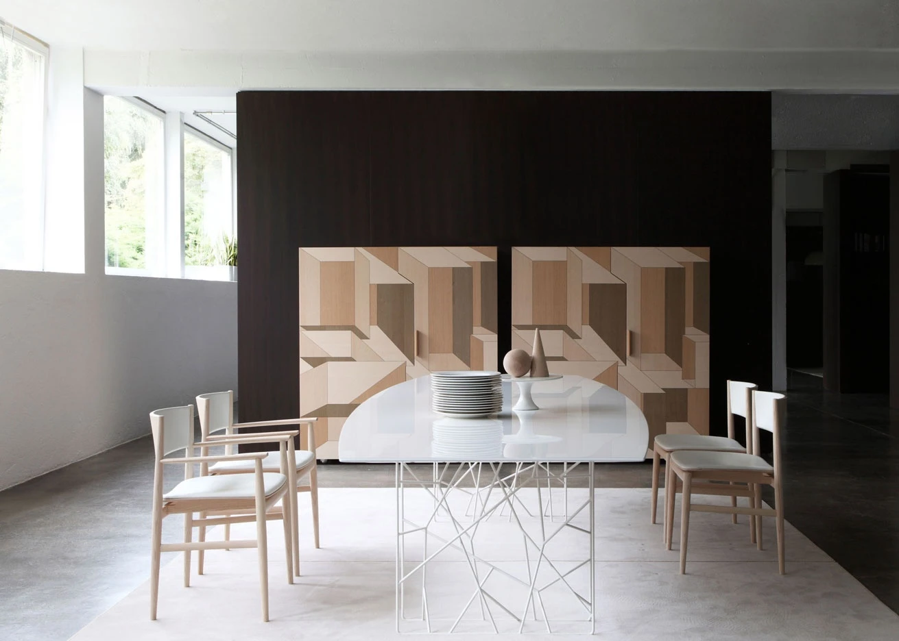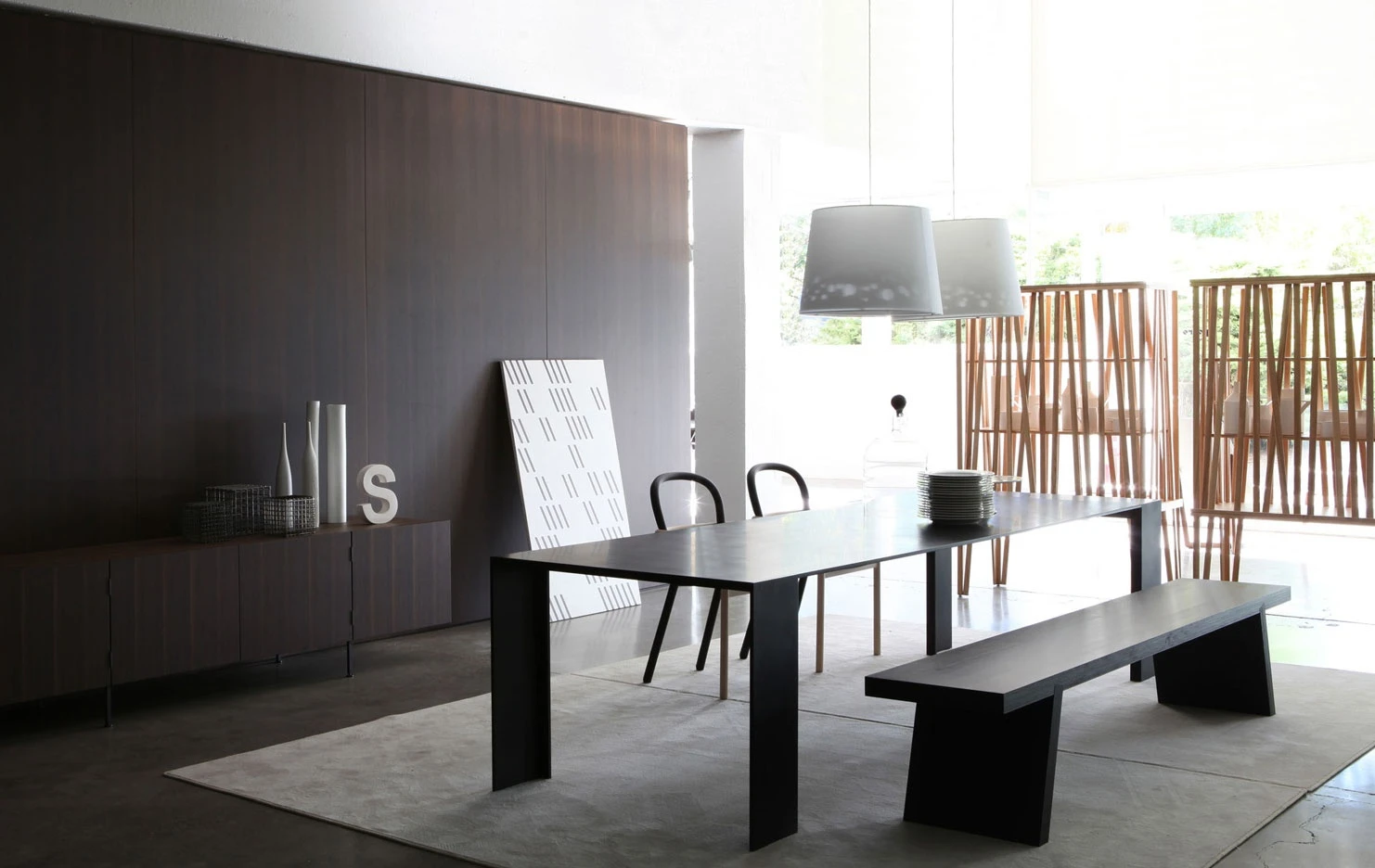 In the first dining setting, the black table Metallico integrates well with Gentle chair's two-tone flexibility and with the inherent elegance found in the Groove bench, made from black-painted hemlock. Defining the area – lit up by the Shadow Light lamp – is Tiller, a low madia, which thanks to a special hinge, has eucalyptus flush sliding doors; and a new creation for 2013, two Mikado containers for the living area which are enclosed by a double row of wooden slats, inclined and slightly offset, that give a glimpse of the interior contents in a striking game of “now you see me, now you don't!”.