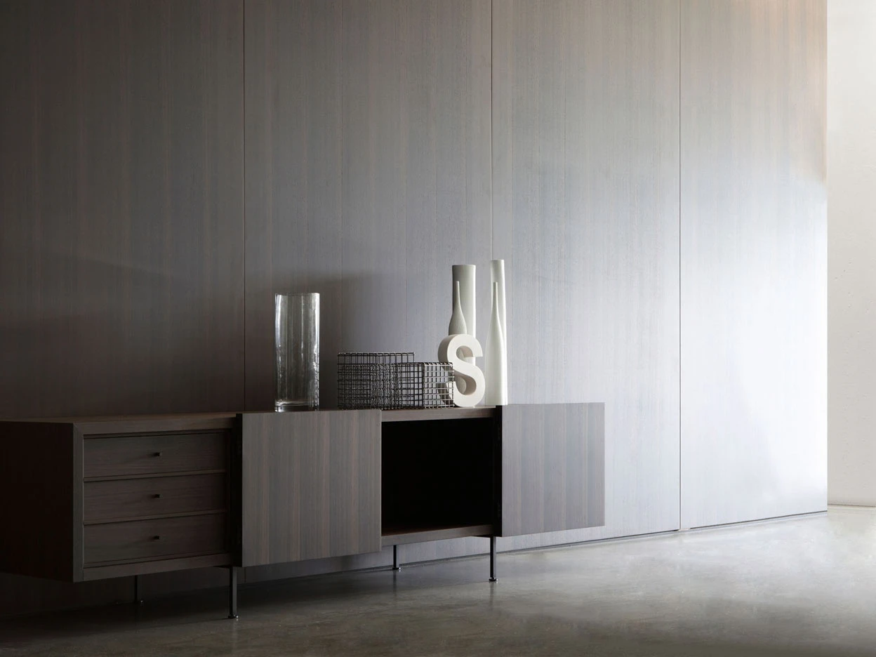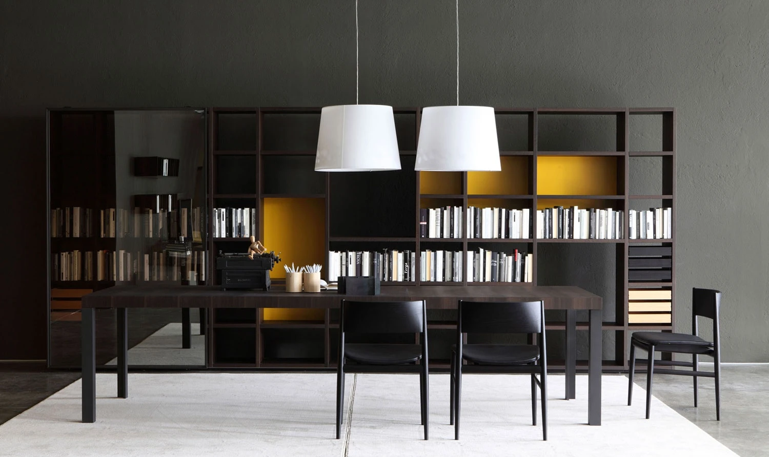 The next environment tells the story of a home-office space, where the soft firmness of the Neve armchairs, made from black-painted ash and upholstered in black leather, gather around the extendable Taac table with eucalyptus veneer. On the wall is the System eucalyptus bookcase, with random backs in sulfur yellow opaque varnish, personalized by an Iron sliding door in smoked glass and by drawer trays in hemlock, either natural or black, next to which are two Modern sulfur-yellow cupboards.