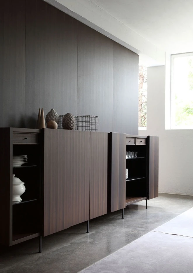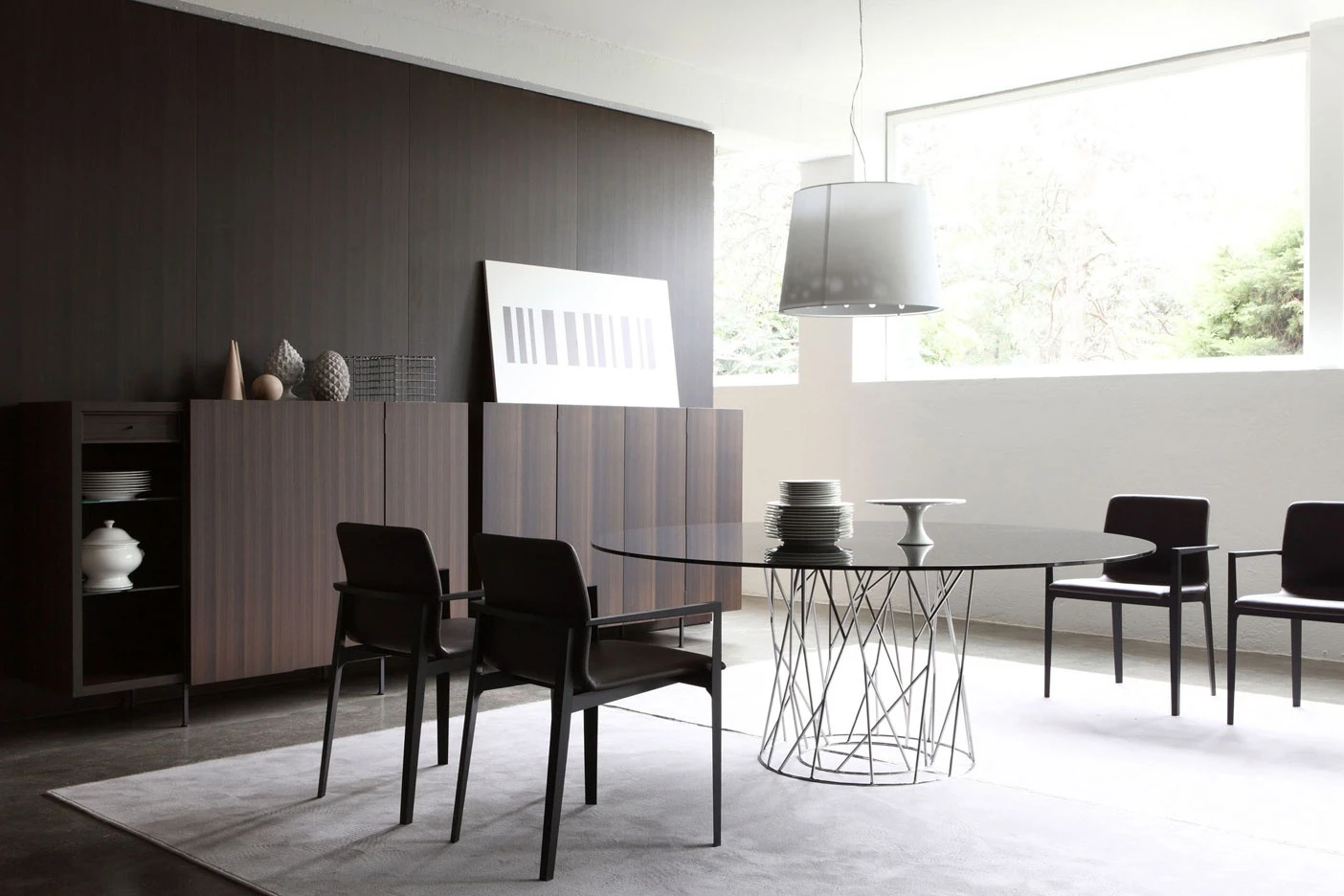 A second dining area differs itself in its darker shades that enhance the Synapsis table, in its round version, surrounded by the new Garda armchairs, made from an ash base that is painted black and upholstered in brown leather, and the tall Tiller madia, raised on elegant legs.