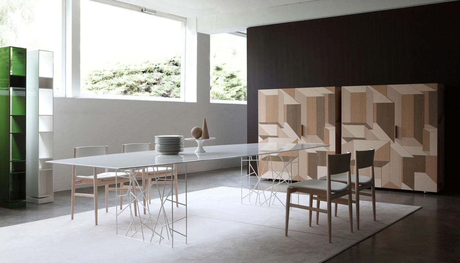 The effects of natural nuances and organic forms distinguish the dining room where the Synapsis table, with its interlaced base, combines with the Neve chair seats made in white-painted ash and upholstered seats and backs, and the Inlay madia with inlaid oak; while the crystal side and bottom version of the Ex-Libris bookcase is displayed. The environment is completed by the Shadow Light chandelier and by the vibrant colors of the Sidewall swiveling bookcase.