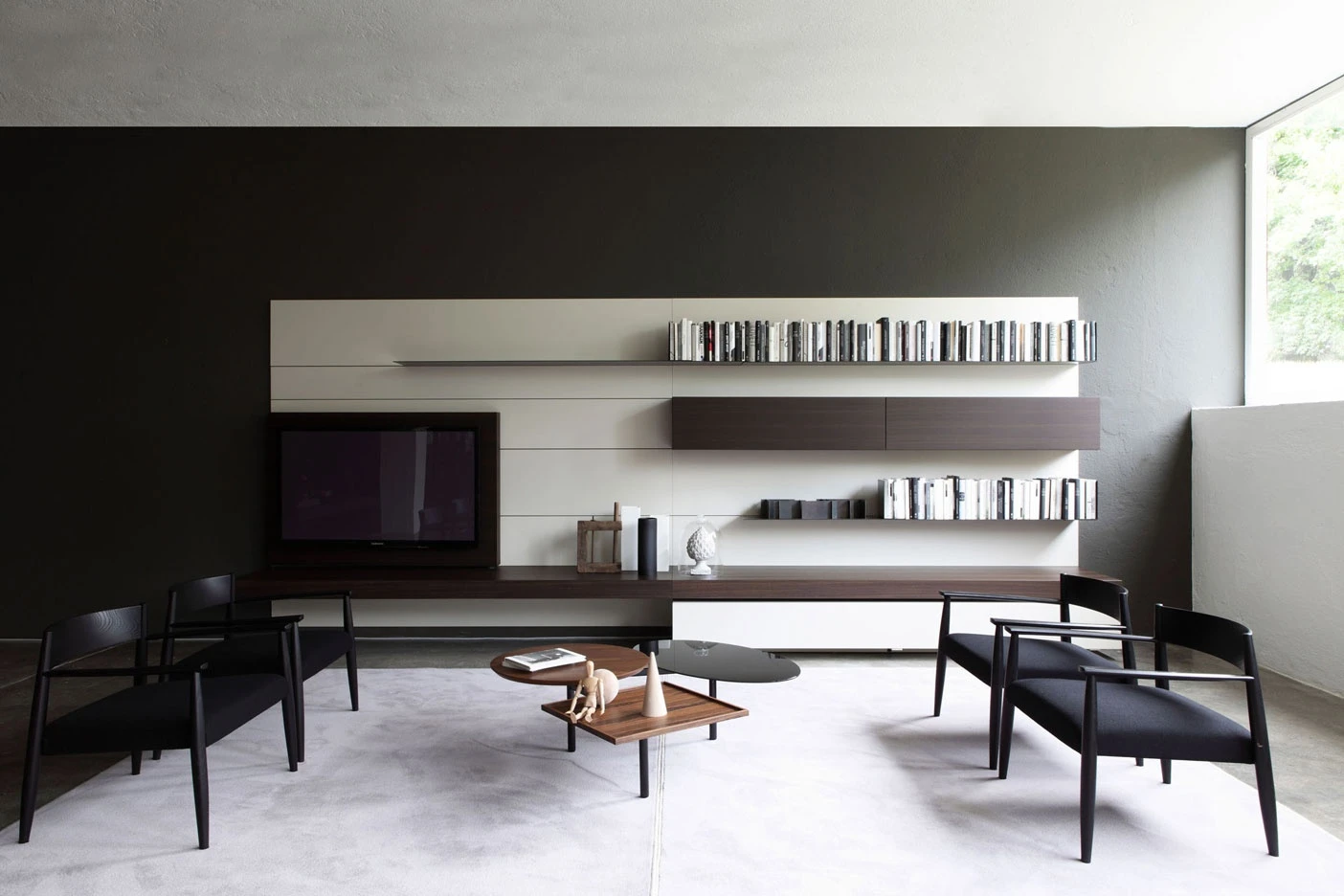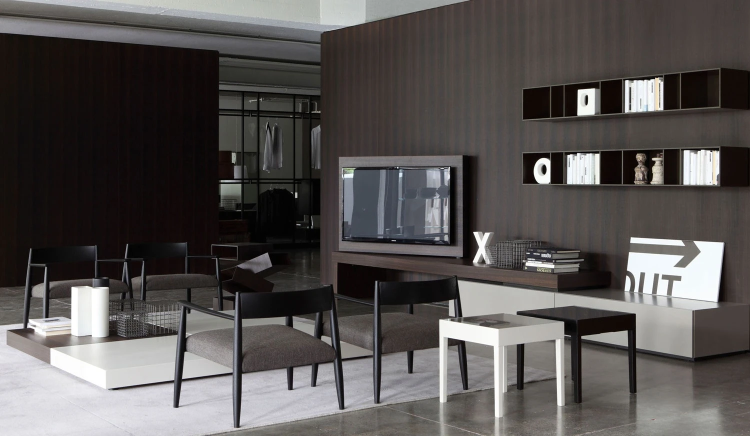 In the last living area is a Modern tv unit that combines a modular unit with a folding panel in sand-colored varnish and a modular unit equipped with a TV Flag eucalyptus panel that can rotate 90°, complemented at the top by a Sidewall horizontal cabinet in chocolate varnish that functions as a modular bookcase or display case for small items. The area is then enriched by low square Modern eucalyptus benches in sand-colored varnish, the low Ghiaccio armchairs made from black-painted ash and mélange brown fabric, and by Showcase Tables in black and sand varnishes.
