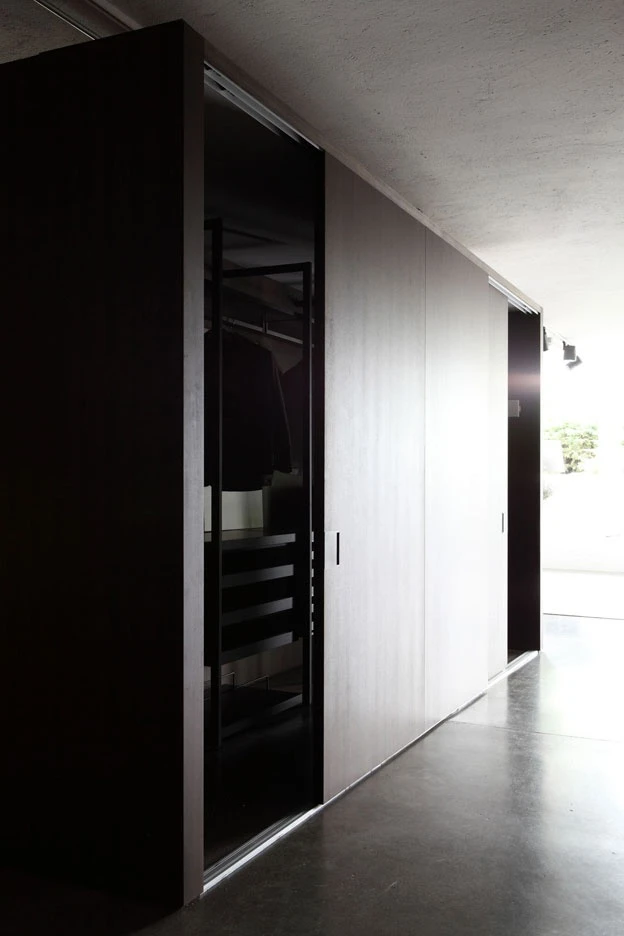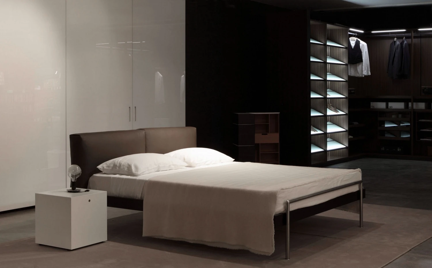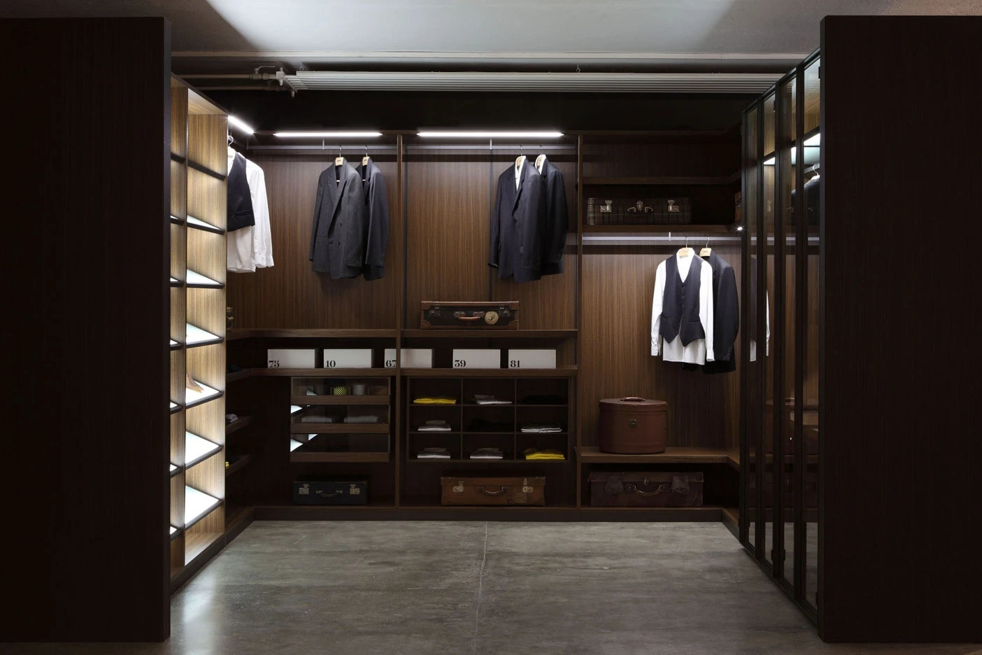 Approaching the sleeping area, one can find an area dedicated to studying, created using steel shelves from the Load-It library together with Modern eucalyptus floating shelf. In front of a first dressing room, protected by new Shift sliding doors open upon the Storage area: the Porro storage system of wardrobes, open wardrobes and walk-in closets. In the bedroom, the Shin bed is accompanied by two white Offshore nightstands and surrounded by wardrobes with new Riff swing doors that have no handles. The area finishes with a walk-in closet distinguished on the left by a large angular mongoi unit; the first side is reserved for lit shelves inclined for shoes, the second side benefits from a new angular solution, while the third side shows two closed modules with Iron doors in transparent crystal with a metal profile painted to give it the effect of iron.