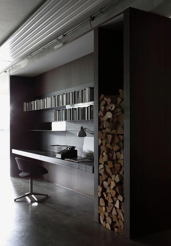 In the next living area, a fitted wall combines steel shelves and ivory wall panels of the Load-It bookcase with the ivory platform, to the floating shelf, to the cabinet containers and eucalyptus Flag panel of the Modern system. Next to it, a relaxation area arises that plays upon the minute forms of the Ghiaccio black-painted ash armchairs with black fabric and with new 3Table adjustable tables, distinguished by oval, square and round surfaces.
