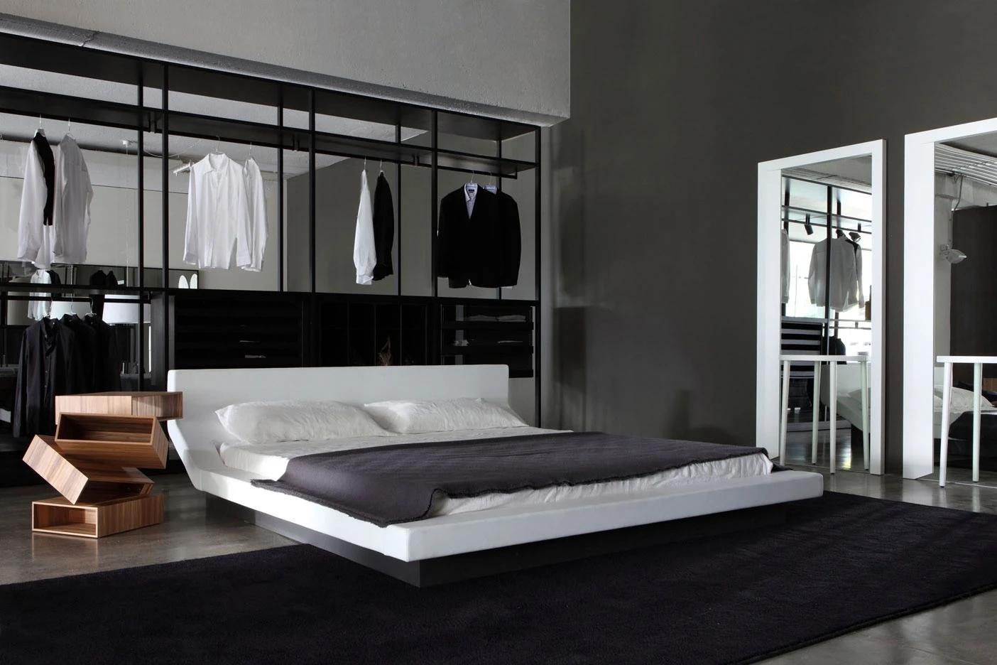 In the first bedroom, the Lipla bed in white leather is displayed with Balancing Boxes santos rosewood nightstands, and surrounded by the carbon-black oak Storage Air wardrobe, two Mirror Table mirrors and inlaid chest of drawers, Inlay, with its 4 different shades of oak.