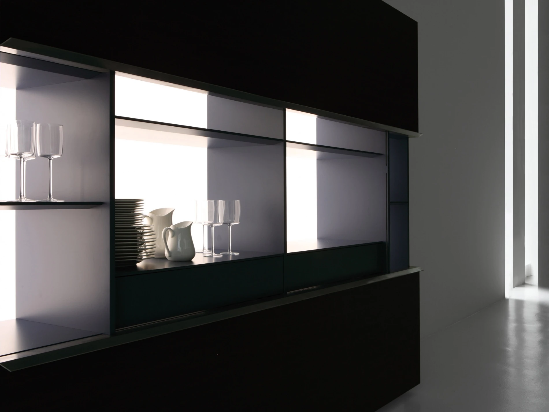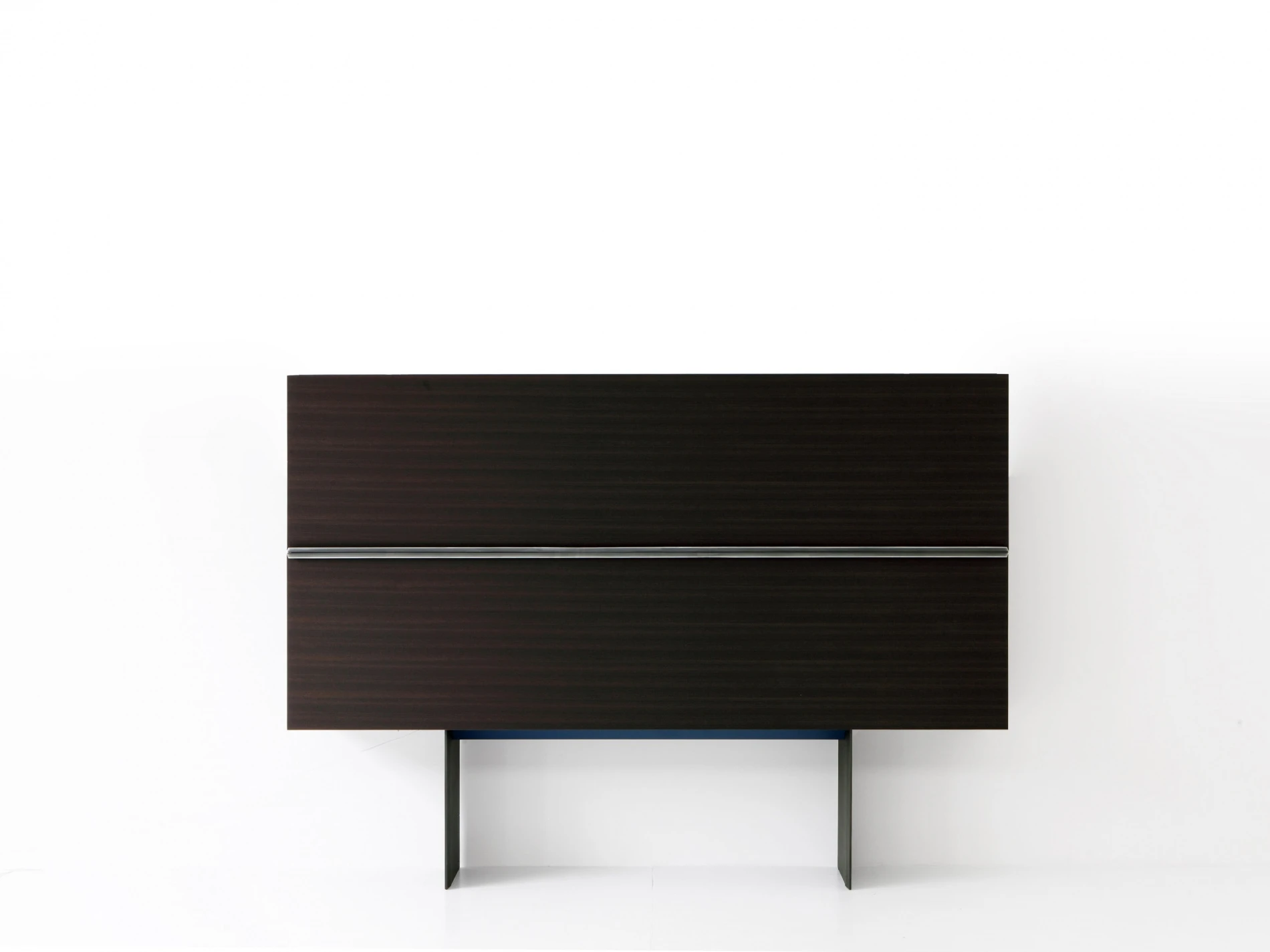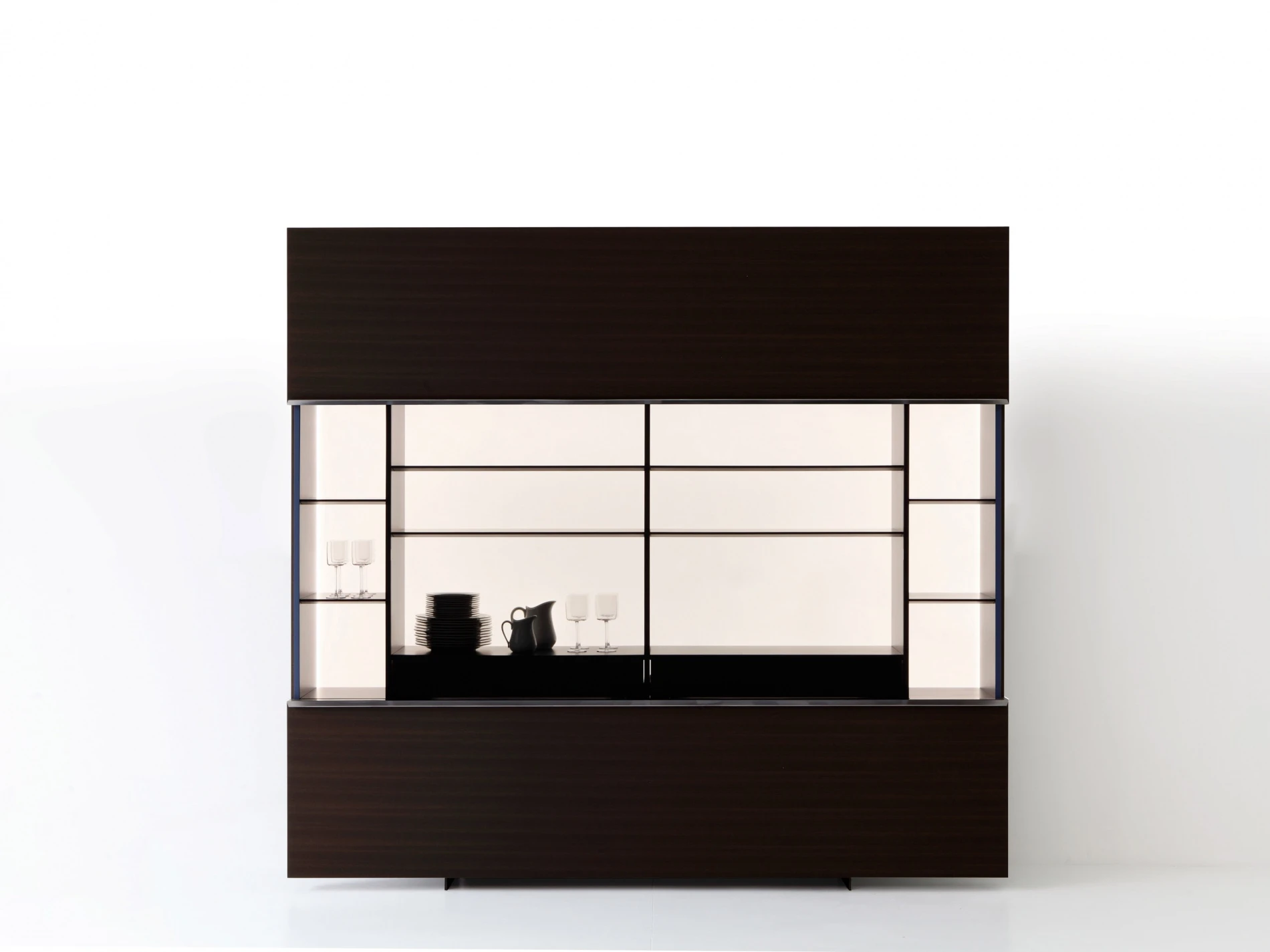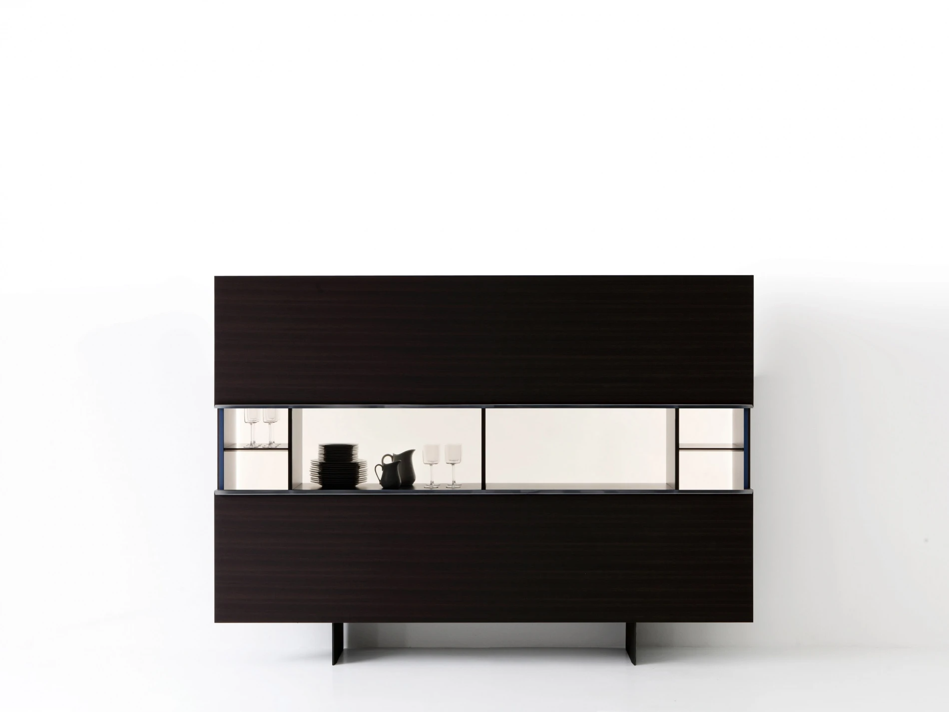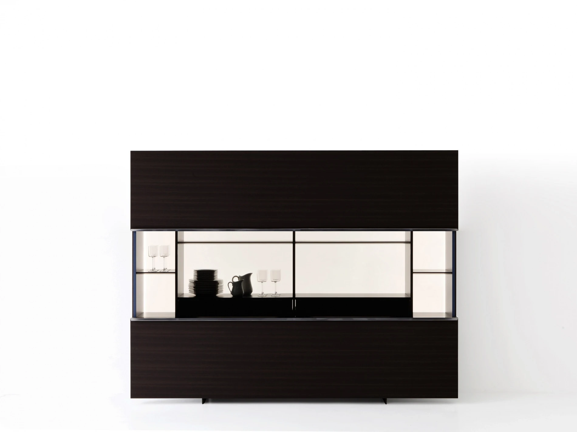 Porro meets the Gabriele e Oscar Buratti brothers, whose projects span the architecture of buildings and urban areas to that of interiors, from the design of furniture and objects to the staging of exhibitions and showrooms, weaving together themes, places and types, materials and workmanship. Their Gallery cupboard is a clean and rational architectural space, traversed only by a horizontal cut between the two broad wooden wings that separate with a light touch. Sliding upwards and downwards, they reveal precious interiors highlighted by a luminous milk white background, articulated by drawers and shelves on which the dishes, silverware, most beautiful glasses, rare bottles, and prized whiskeys can be stored and organized in perfect order, awaiting significant occasions. Available in a hanging version or on a metal base, in two sizes 2400 x H. 1200 mm and 3000 x H. 1200 mm, Gallery fits into a space like an abstract painting, a very clean, almost invisible wall surface that, upon the arrival of guests, yields the stage to a sophisticated service vitrine in the dining room.