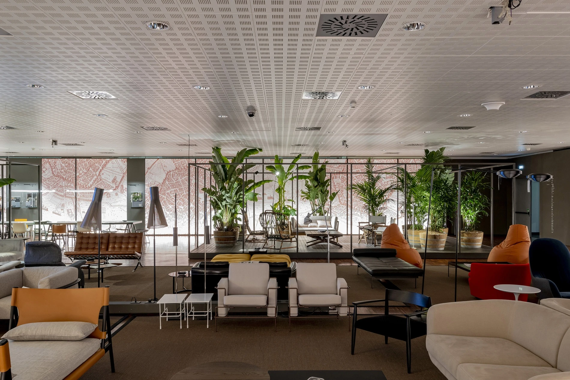 The elegant Traveller daybed by GamFratesi, with its trestle structure in black painted metal and saddle leather sides, the 3Table coffee table by Front, made of 3 single tops that can revolve on themselves and the Ghiaccio low and comfortable armchair by Piero Lissoni, with unusual proportions, are among the pieces selected by Lissoni Associati to furnish the vip & press area during Salone del Mobile.