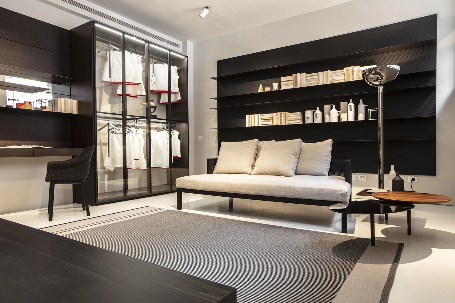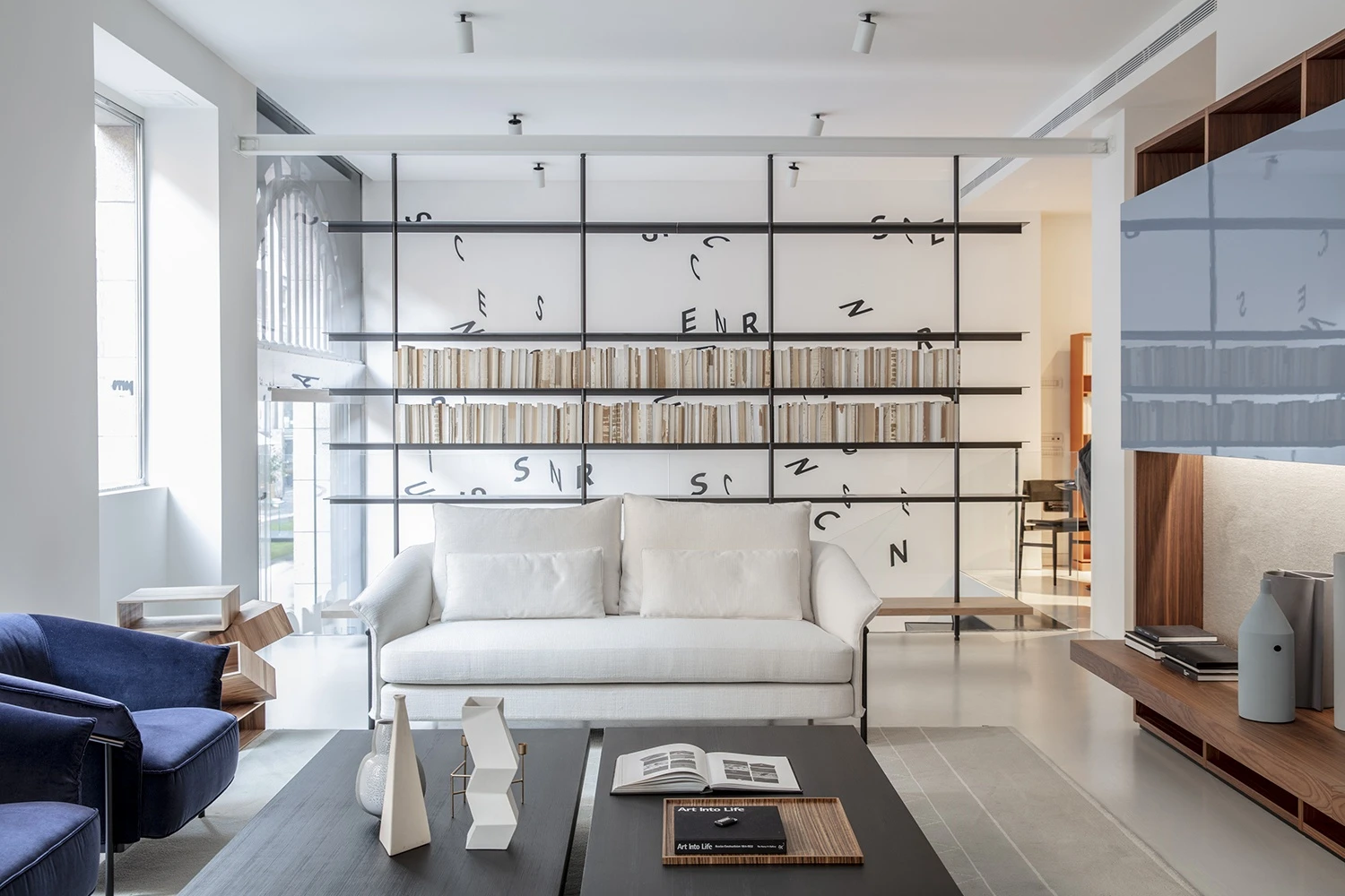 In the central living area, the new generation Boutique Mast system designed by Piero Lissoni + Porro Research Centre is conjugated in the day version, with Iron painted metal uprights and reduced thickness Iron metal shelves, like a spacious bookcase.