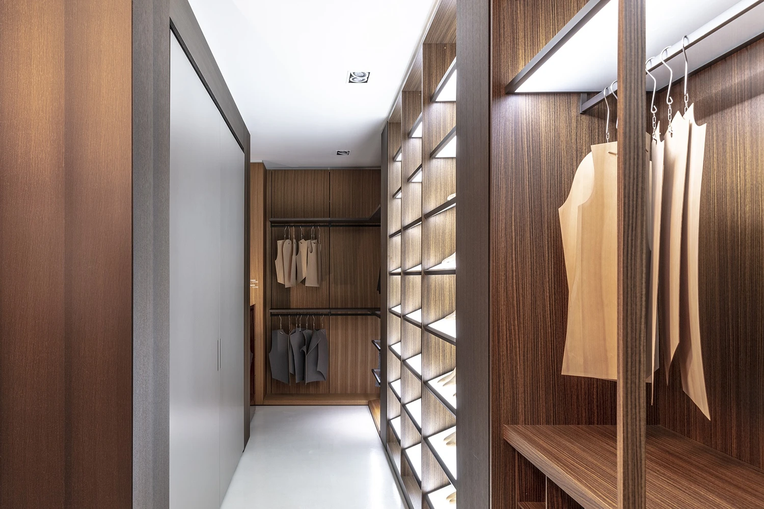 In the background, the Storage Boiserie in teak is a solution halfway between the minimalism of the walk-in closet and the protection of the closet, combining the view of the interiors with the warmth of paneling.