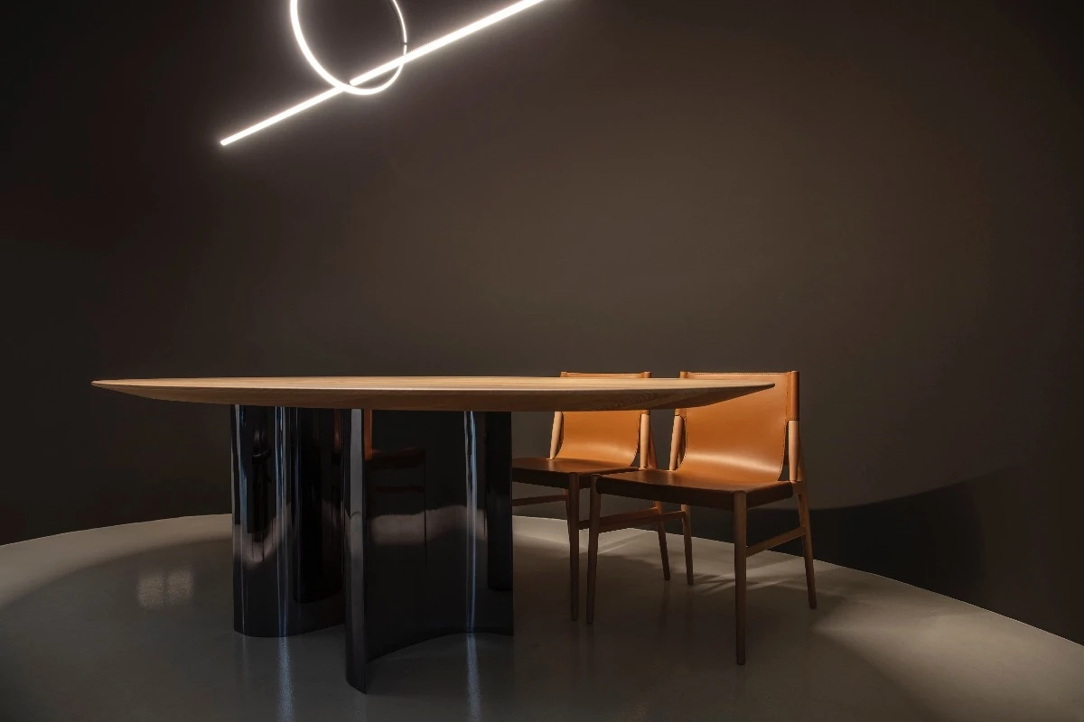 A dining room with strong character places the Jeff table by Gabriele and Oscar Buratti on stage in its new version with an oval top in solid chestnut and blue pigmented shiny curvilinear bases and Voyage chairs by GamFratesi with maple structure and a fitted leather covering, with their natural look.