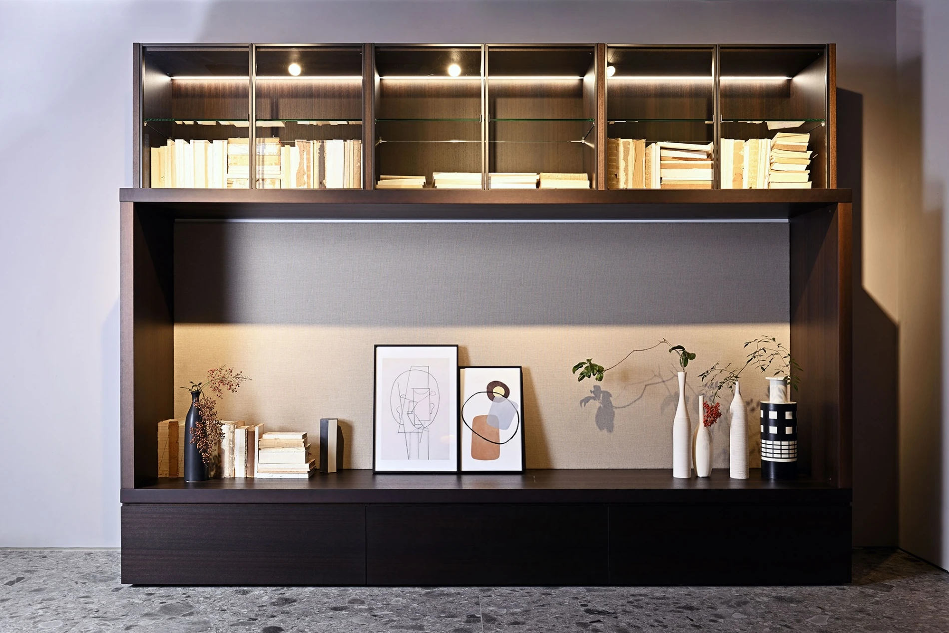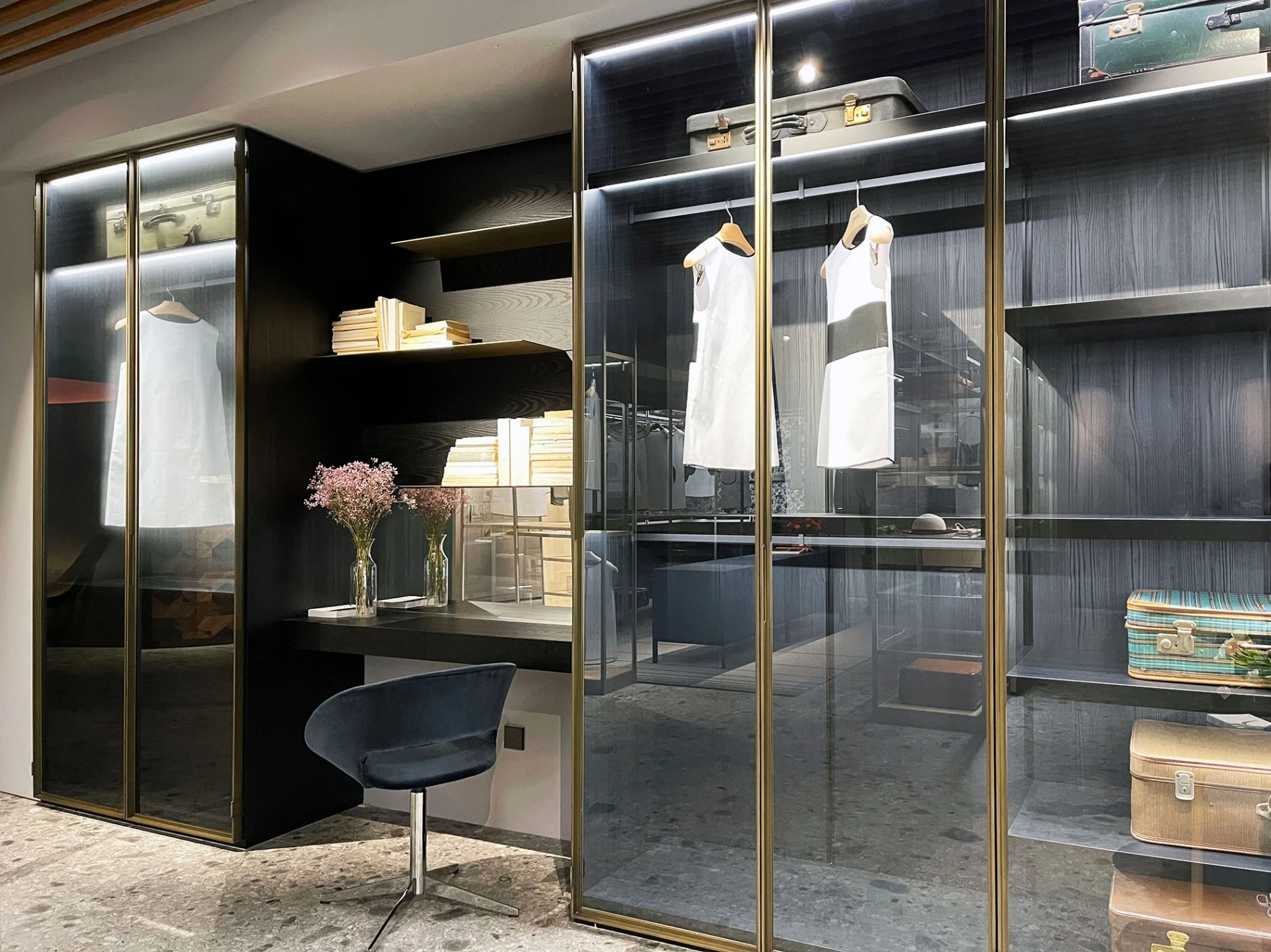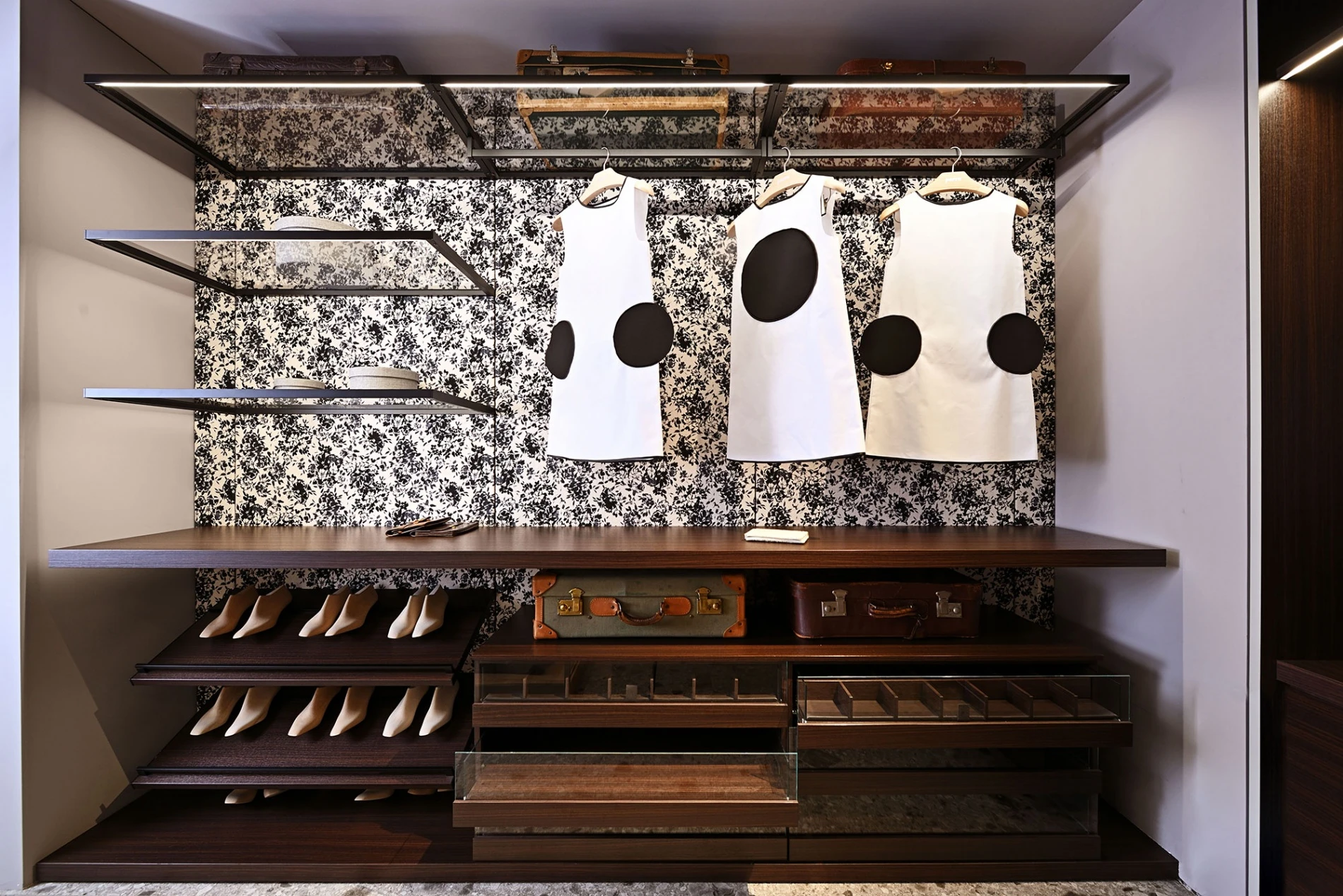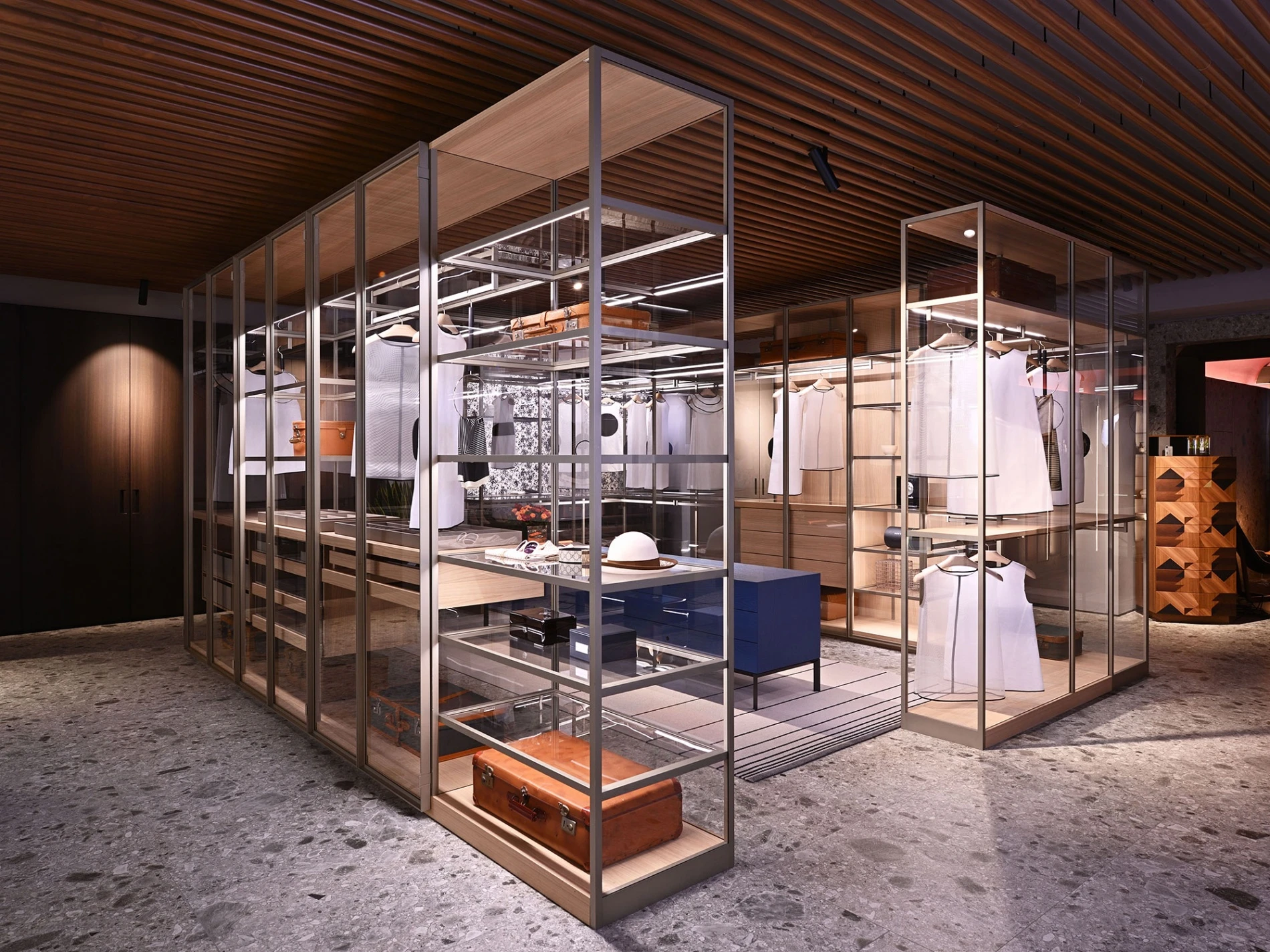 At the entrance, visitors are welcomed in the area dedicated to Storage, Porro’s wardrobe and dressing-room system by Piero Lissoni + Porro Research Centre, which epitomizes the quintessence of the brand’s customisation possibilities and is its best-seller on the market. Here the company’s bespoke service materialises not only in the ingenious and innovative space solutions and in the accuracy of door and interior finishes, but also in the streamlining and optimisation of interior space so that the objects stored – your preferred shirts, clothes and accessories - are not only protected and in perfect order but also displayed and enhanced, with an obsessive care for hidden details that makes Porro’s wardrobe different from all the others – a world apart.