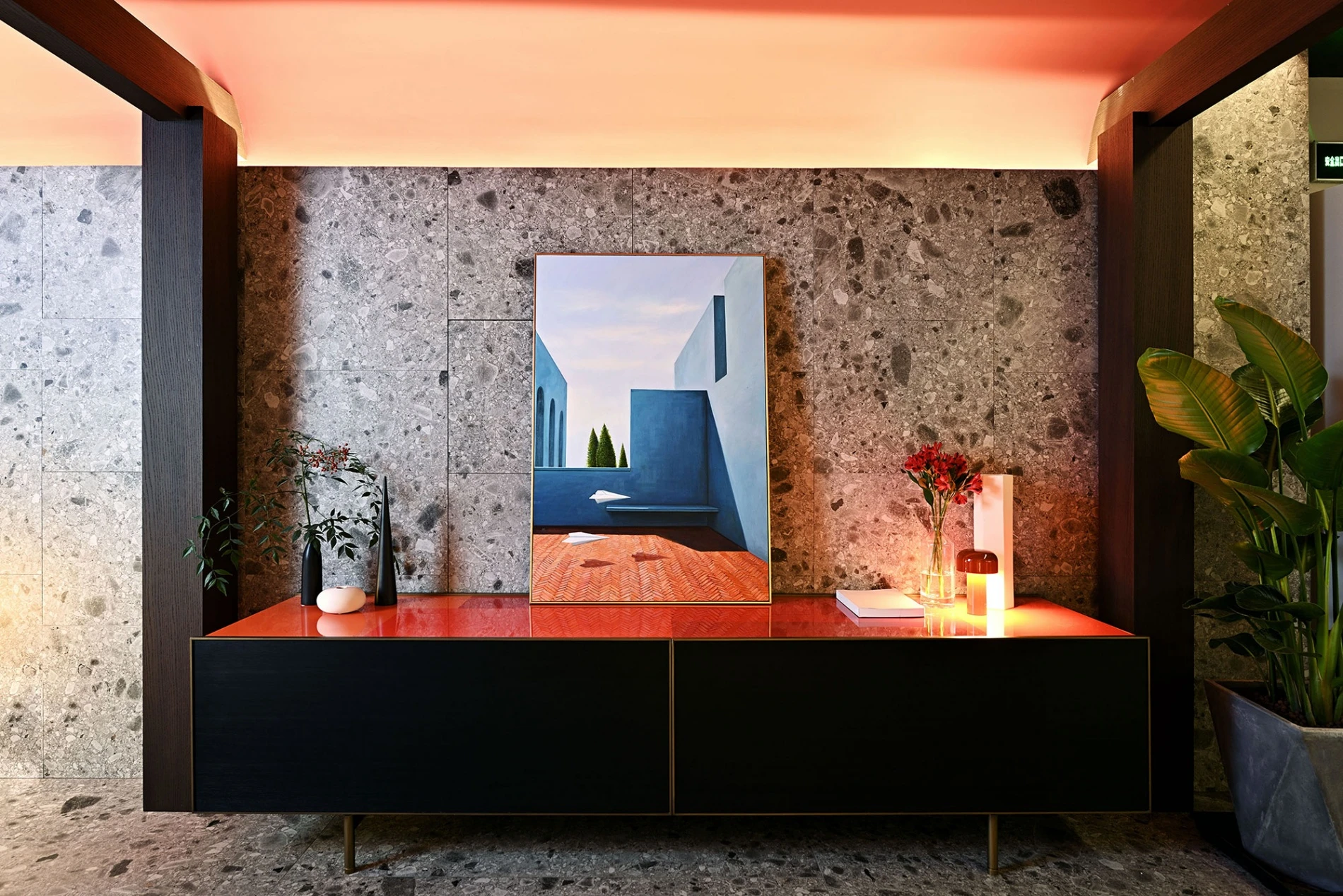 A lighted tunnel marked by wooden beams and uprights and red painted ceilings leads to the second part of the showroom, in a museum-like itinerary where some Porro’s signature products are displayed, like the Shahan coffee table and the Jade armchair by Christophe Pillet, featuring a crossed wood supporting structure on which the leather seat harmoniously lies, the Gap hanging bookcase by Carlo Tamborini in grigio piombo and rosso cina and the Ipercolore chest of drawers by Piero Lissoni, boasting a fine contrast between the black-stained hemlock frame and rigorous fronts and the top and side panels brightly lacquered in shades ranging from orange to red.