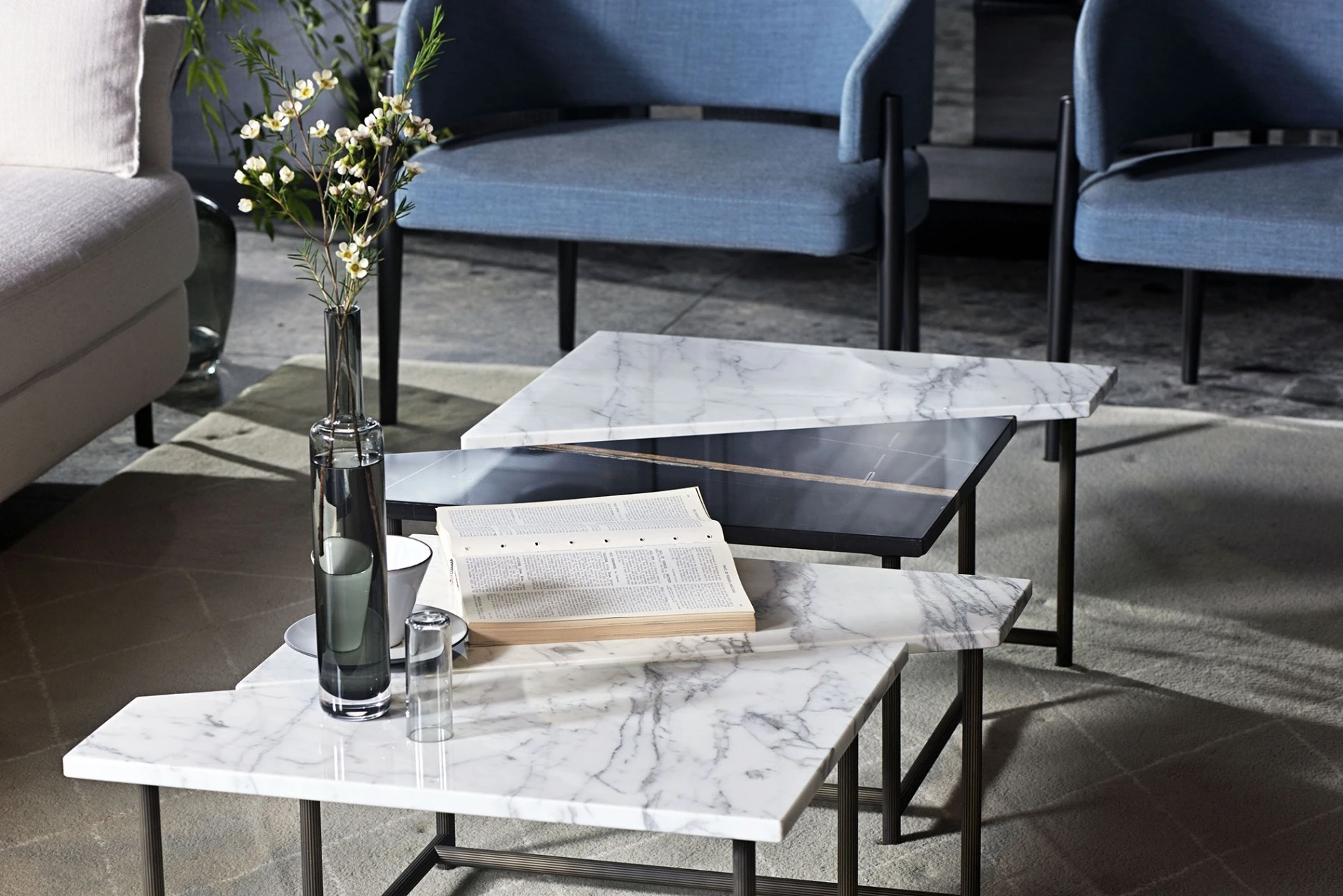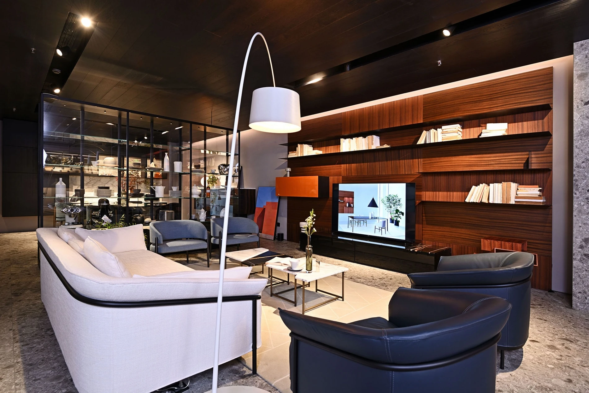 In the living area, featuring Palladio coffee tables and Kite Sofas and armchairs by GamFratesi, a Modern + Load-it composition by Piero Lissoni and Wolfgang Tolk focuses on the delicate visual effect provided by the wall panels in natural canneté textures..On the wall, the System bookcase in eucalyptus is an unconventional architectural presence, running from floor to ceiling and promoting different uses.