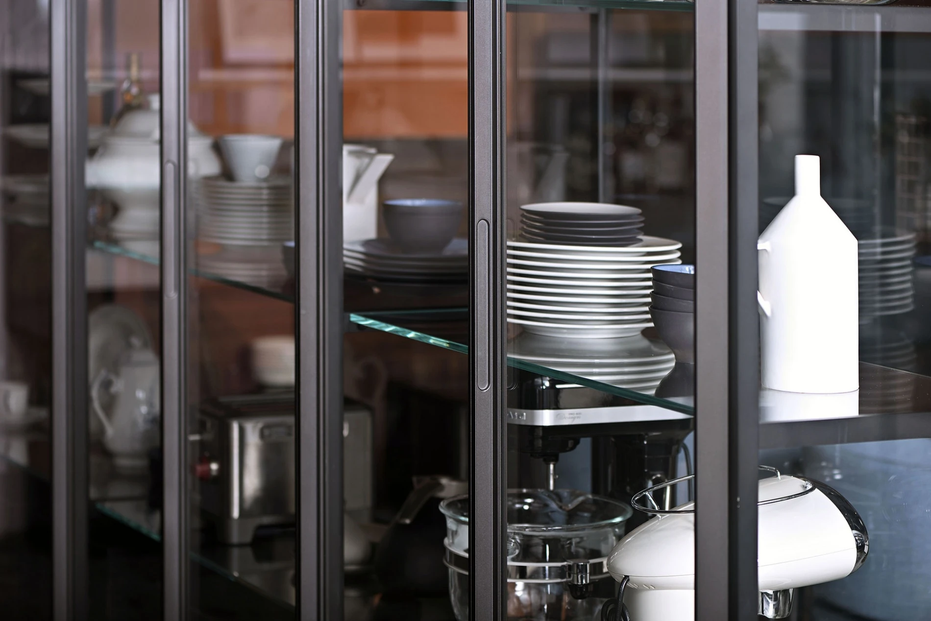 A Storage Battente seasonal wardrobe with eucalyptus frame features compartments closed by powder blue glossy lacquered doors, with the new Block metal handle painted in the same colour as the doors, alongside a glass cabinet and the new Bento open box: 2 signs, a horizontal and a vertical one, which break the continuity of the coloured surface.