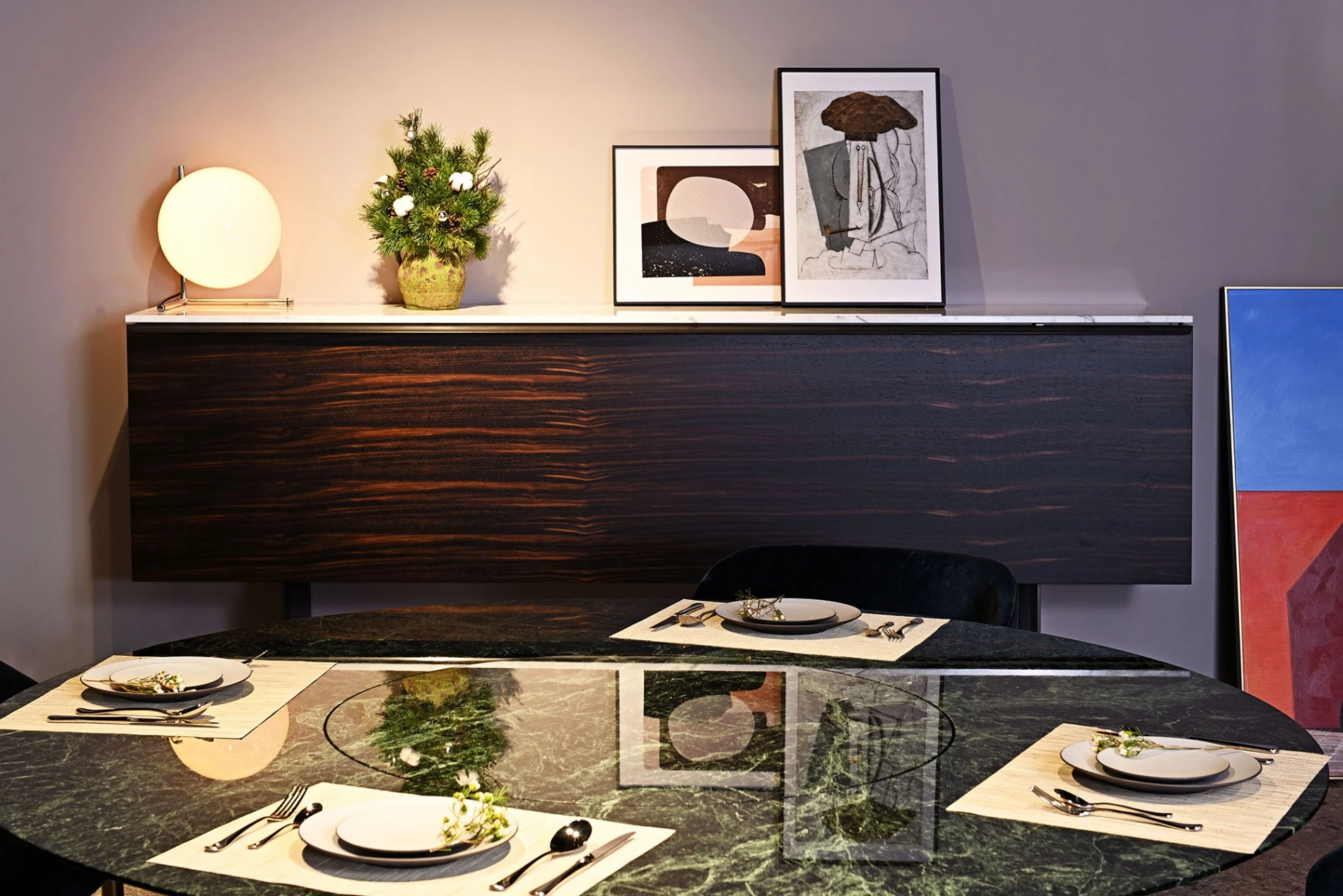 In the dining room, the eye is caught by the purity of the Materic table by Piero Lissoni, with a thin round top in Calacatta oro marble with a tapered base in solid black-stained ash. A Modern floor-to-ceiling composition by Piero Lissoni + Porro Research Centre for the dining area plays with the emptying of its central part featuring a marble shelf.The Gallery Low Cupboard by Gabriele and Oscar Buratti adds to the fascination of the room, with its Calacatta oro marble top. A plain, rational architectural volume closed by a single pale moon door, which slides downwards to reveal a sand lacquered interior with a mirrored back panel, suitable for storing dishes and as a bar cabinet.