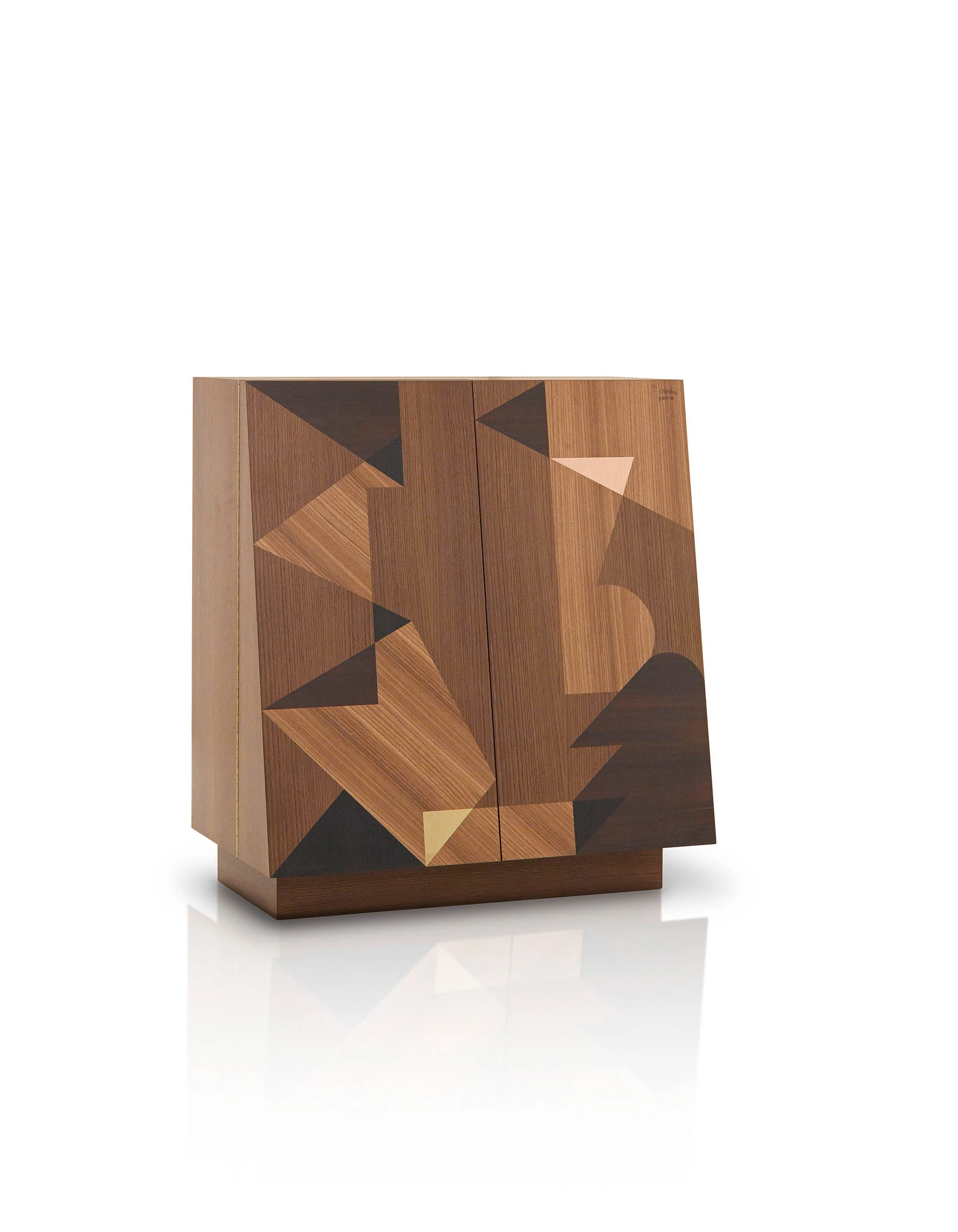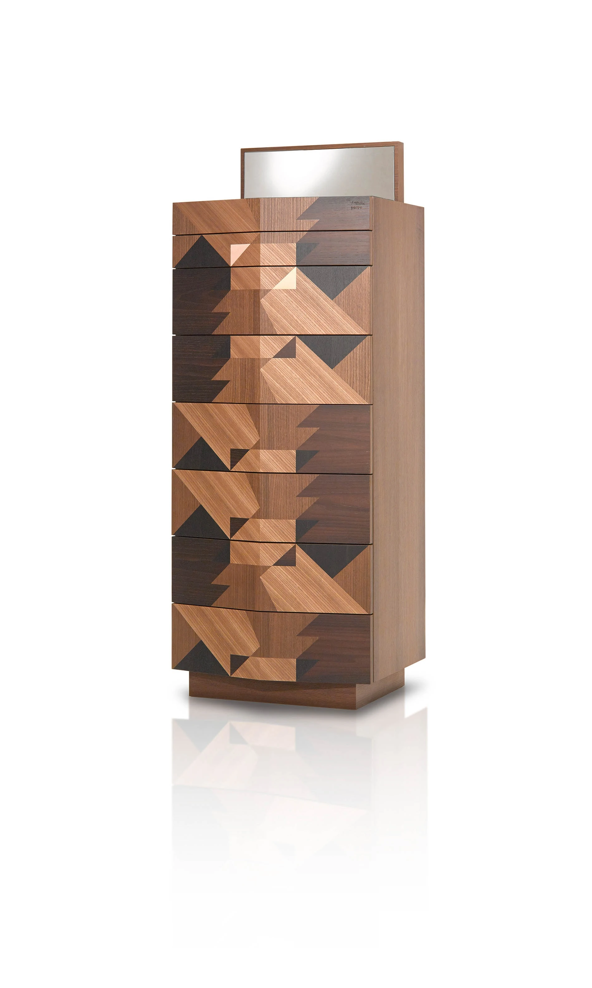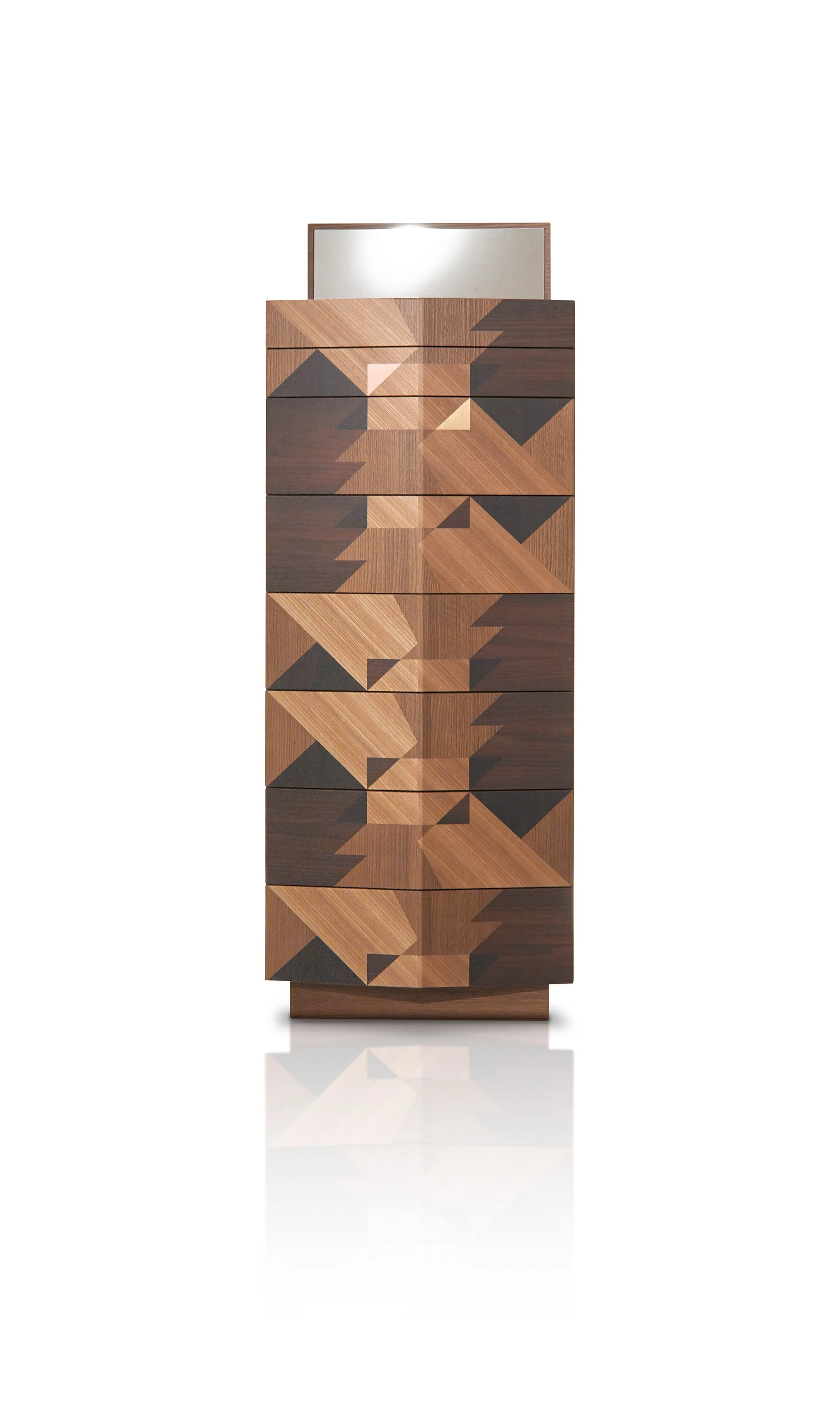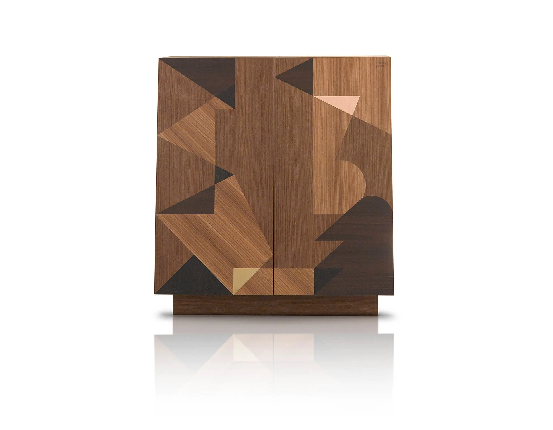 All of the vitality and exuberance of their designer bursts forth, using many of the new wooden essences in Porro’s palette for a combination of coordinating colors: these are the two new inlaid Maggio and Schermo sideboards, designed by Alessandro Mendini. For once, Porro forgets its usual minimalism and throws itself into the decoration exploration of wood; guided by the master, the par excellence interpreter of a playful approach, chromatic and irreverent in design. Two universes, seemingly poles apart meet, thanks to the shared passion for wood, in a volcanic mix that touches upon the two opposites of rationality and expressiveness. Narrow and elongated, Maggio is an amusing chest of drawers crowned with a mirror, with a diamond-shaped section, 2 pullout trays and 6 large drawers. On the other hand, Schermo is a square cupboard on a base with a sloping hinged door. Both are created with an inlaid design on the front, achieved by combining three different types of wood – elm, oak and acacia – according to abstract geometric compositions that meld the points of the triangle with the curved contours of the circle in unexpected directions. With a maple interior, pliable brass, bronze and inox steel elements, and unexpected three-dimensionality in their profiles, Maggio and Schermo create a small series of exquisite and collectible furniture, between art and design.