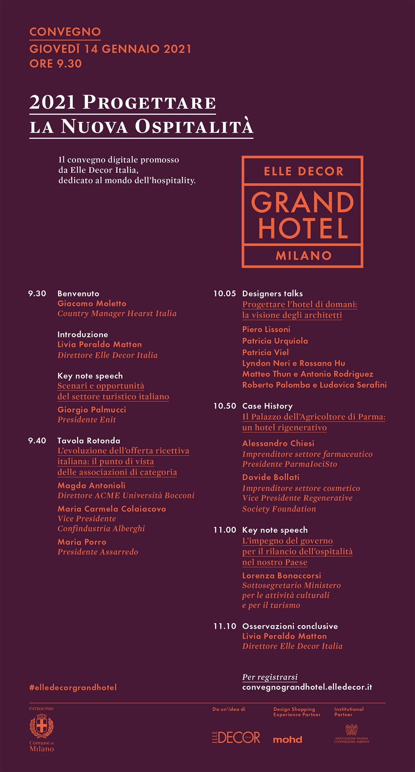 With the first digital conference, 2021 Progettare la nuova ospitalità,  Elle Decor Italia, the international brand of design, interiors and architecture, pursues the objective of opening a discussion table on the changes that are affecting the hospitality sector today in the post-pandemic era. Emphasizing the importance of synergy between institutions, trade associations, designers and entrepreneurs, the conference has seen the flourishing of ideas and new directions to be taken, in favor of a world that plays a central role in the economy of the country.