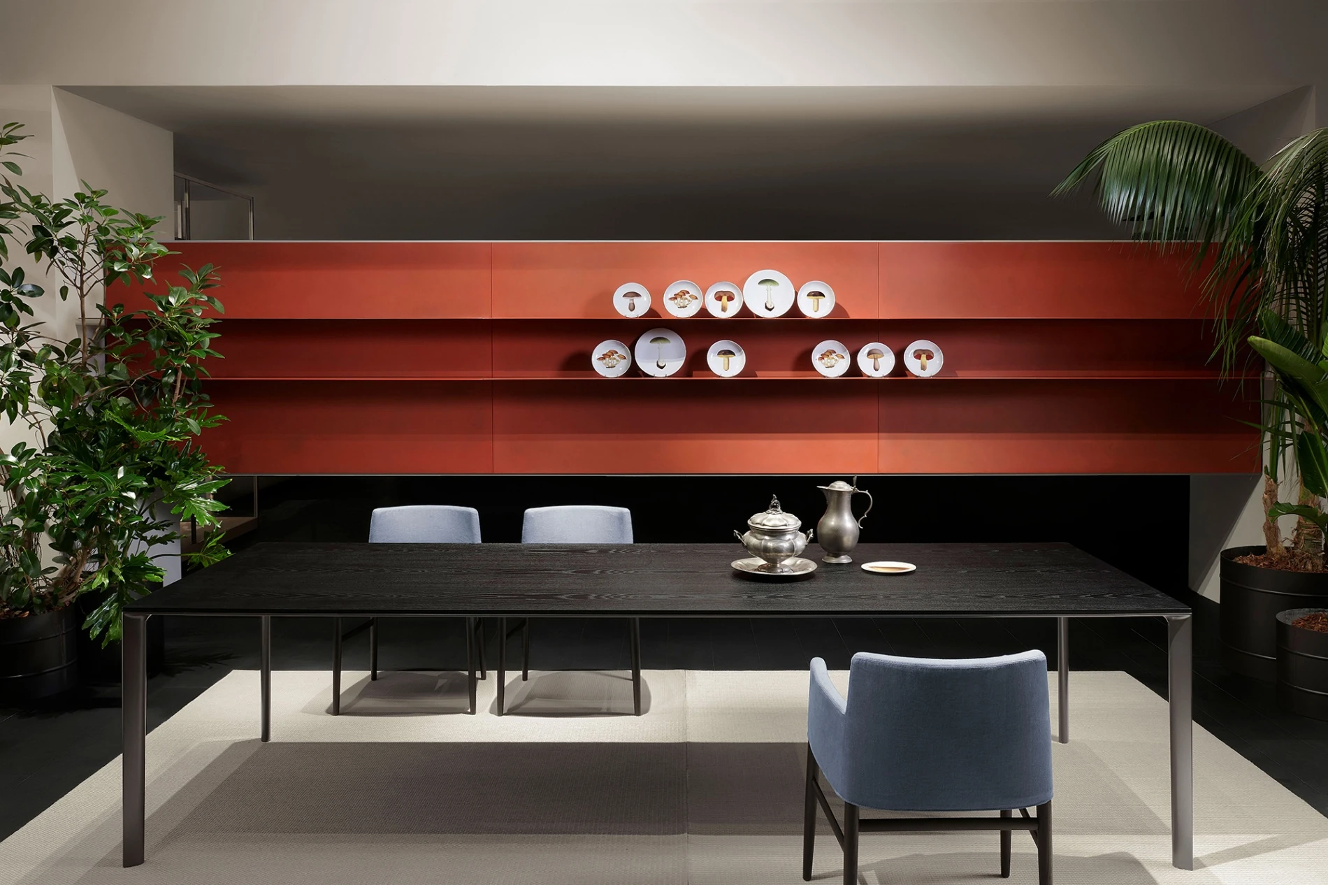 The new Pascal system of tables is distinguished by the visual lightness of its die-cast aluminum wing-shaped legs which is connected without interruption with the horizontal supporting structure on which the top rests, available in a variety of materials, solid wood, marble or ceramic, creating an interplay of superimpositions and double thickness. Produced by the industrial soul that has enabled the attainment of unprecedent lengths, it is combined with Pioggia, the padded chair that complements the family composed of the chair Neve and the armchair Ghiaccio. The chair structure is made of solid ash, in the finishes natural, black stained, red stained and white stained, with visibly tapered legs and soft padding.