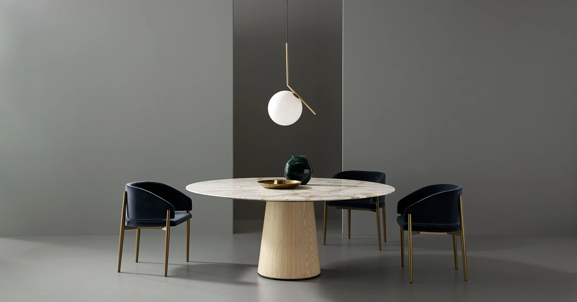 The Materic table is a sculptural object where the absolute simplicity of design is juxtaposed to the sophistication of materials and workmanships. With a round and tapered marble table top, laying on a turned truncated cone as a base in solid ash, Materic can also feature at the centre a coplanar rotating tray in marble realized in the same slab of the top or a revolving wooden tray leaning on the top in the same finishes of the base. Here is matched with the Frank armchair, freely inspired by French decoration. Its design unites three distinct elements in a harmonious indissoluble whole: the soft, enveloping shell-shaped back, the solid, robust metal legs that gain momentum thanks to the variable section, which is at first thin and then gets wider to support more firmly, and the high thickness of the seat with elastic straps, providing superior comfort.