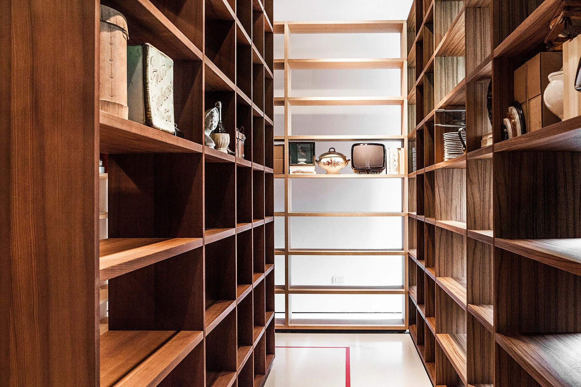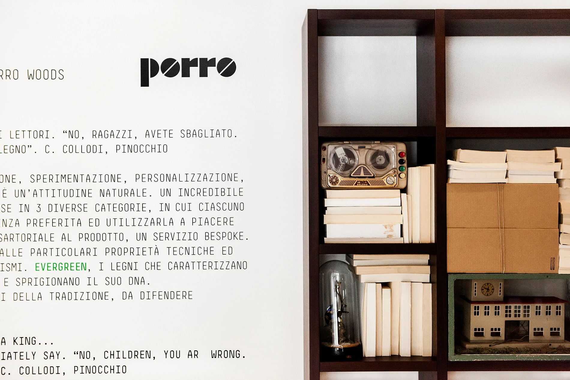 Inside System, all kinds of objets trouvés - boxes, bags, corsets, dishes, televisions, bottles and food - all line up one after the other and continue on for 60 linear meters, suggesting combinations of materials and shades with the idea that the wood in both Porro’s systems and products is an ingredient that can be chosen to your liking, like what usually happens with fabric, relying on the highest quality of a Porro selection.