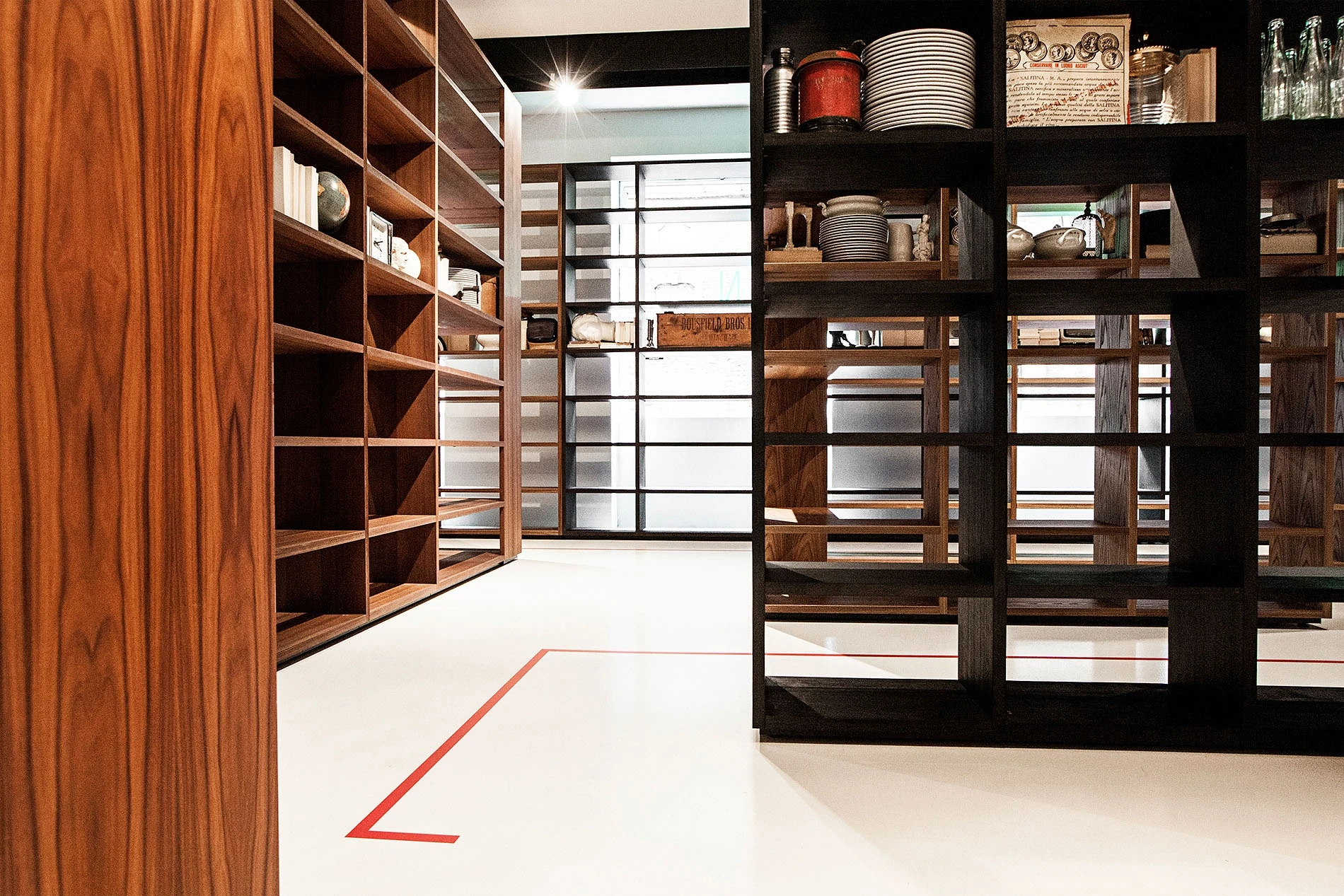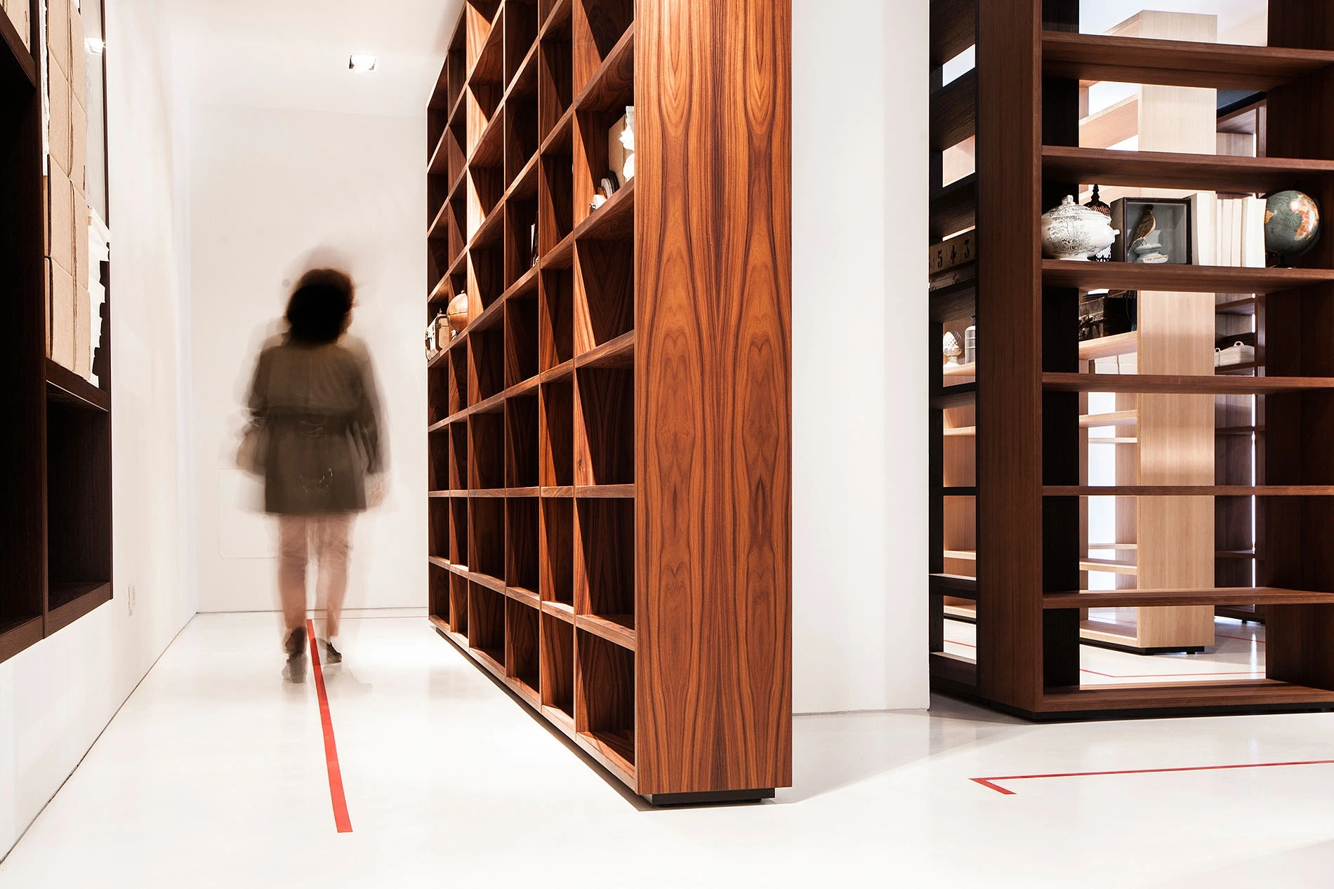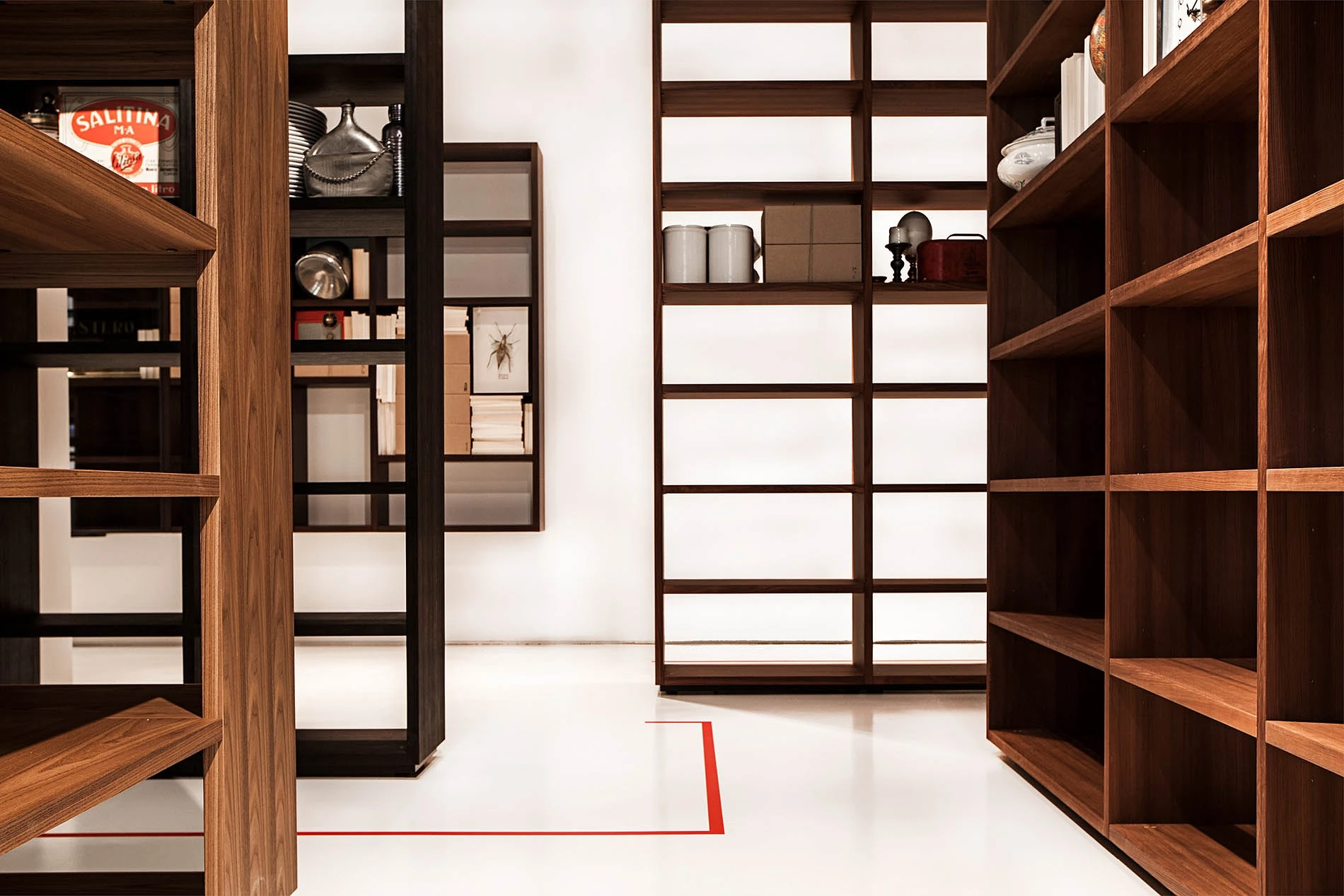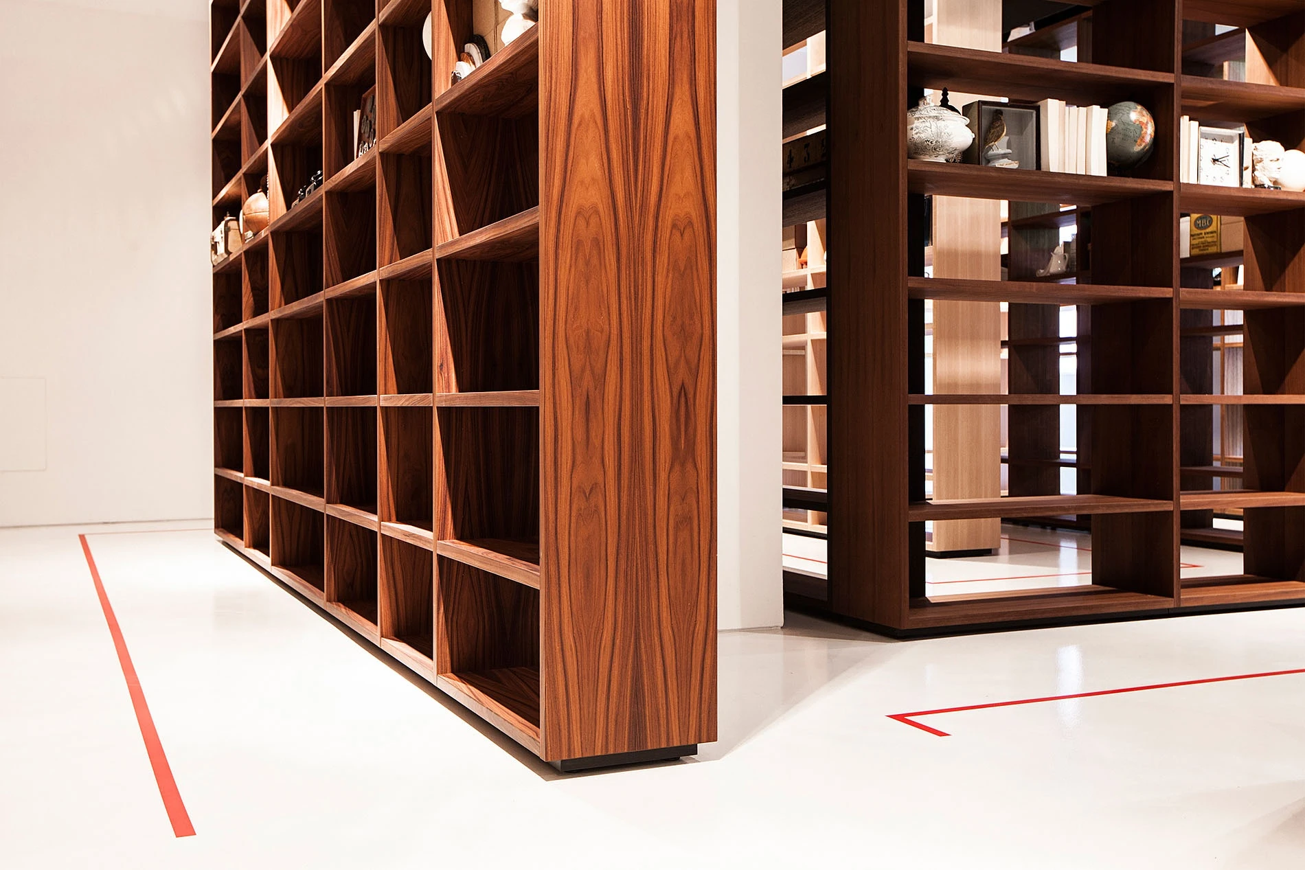 Porro’s savoir-faire on wood filters through in a conceptual manner in the “Woodenland” installation by Piero Lissoni in the Porro duriniquindici showroom: an itinerary where the regular grid of the System bookcase is transformed into a natural labyrinth in which to discover different essences, where a file rouge guides the visitor, helping him or her to orient themselves through the finishes. Showing “on its own skin” the new essences, System modules the space in the pursuit of naturalness, in a gradual passage of colours and textures.