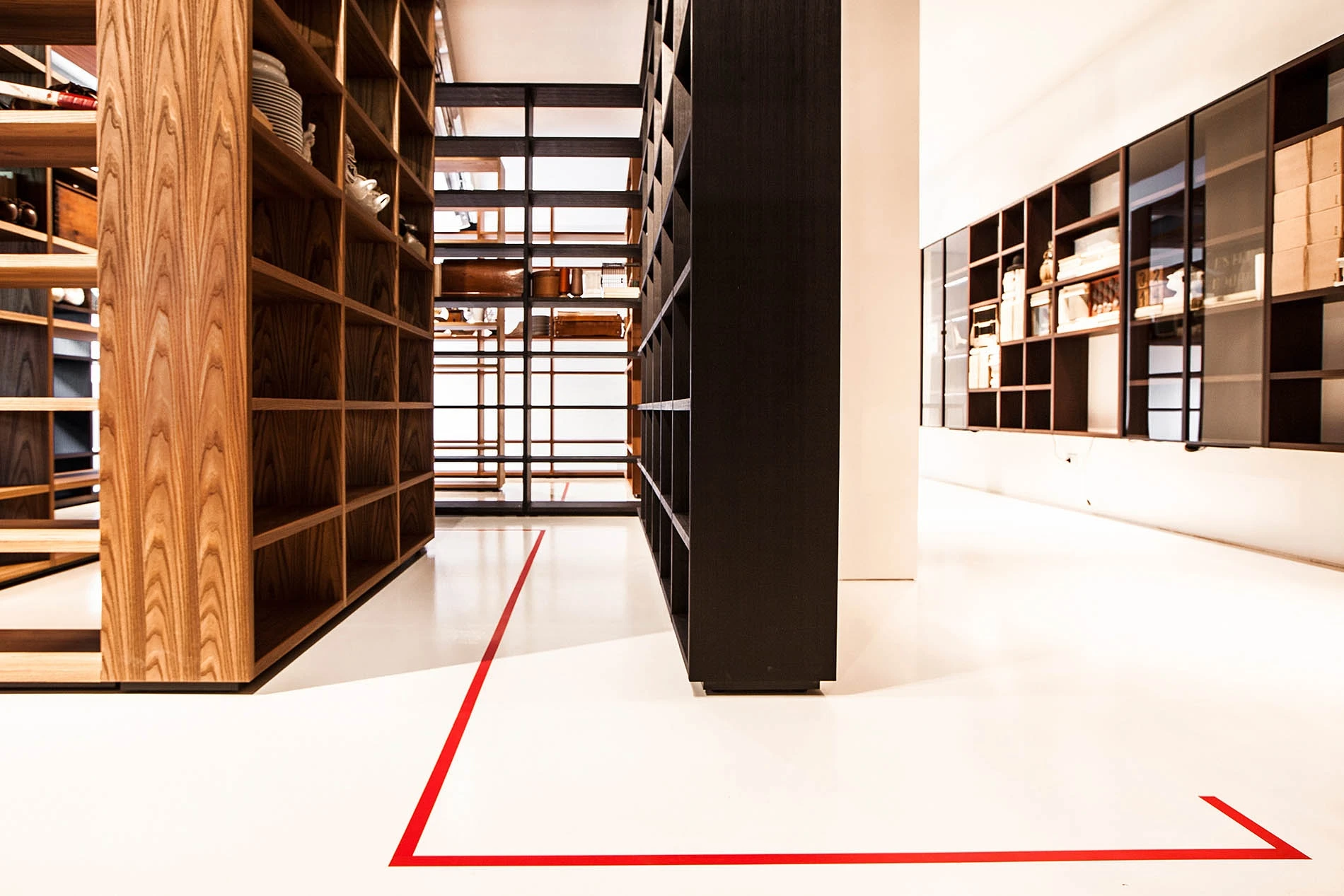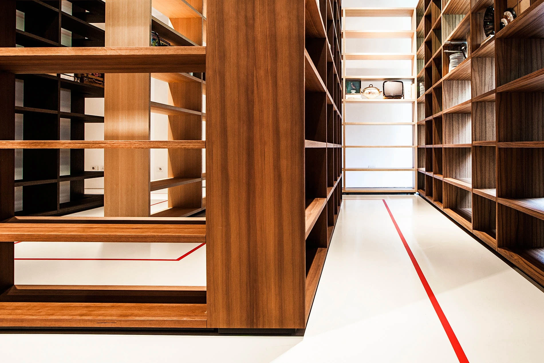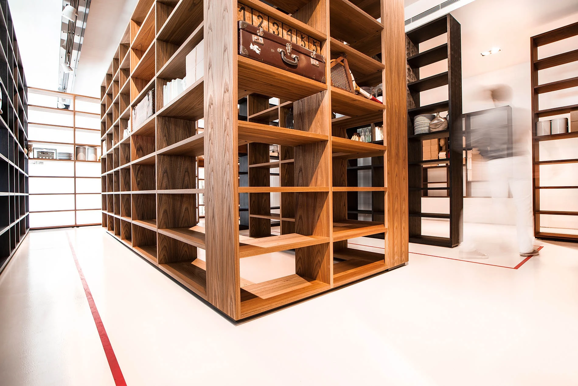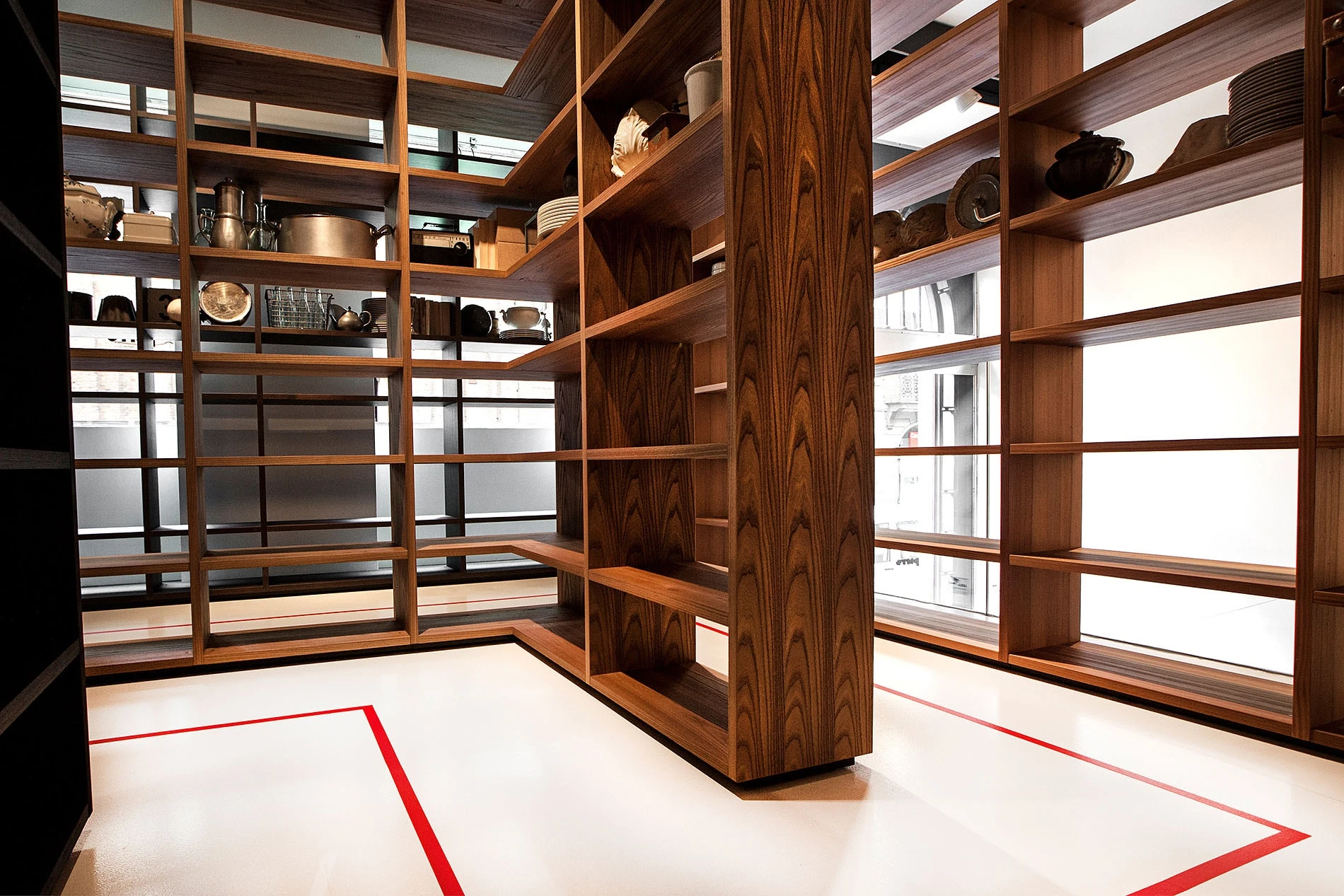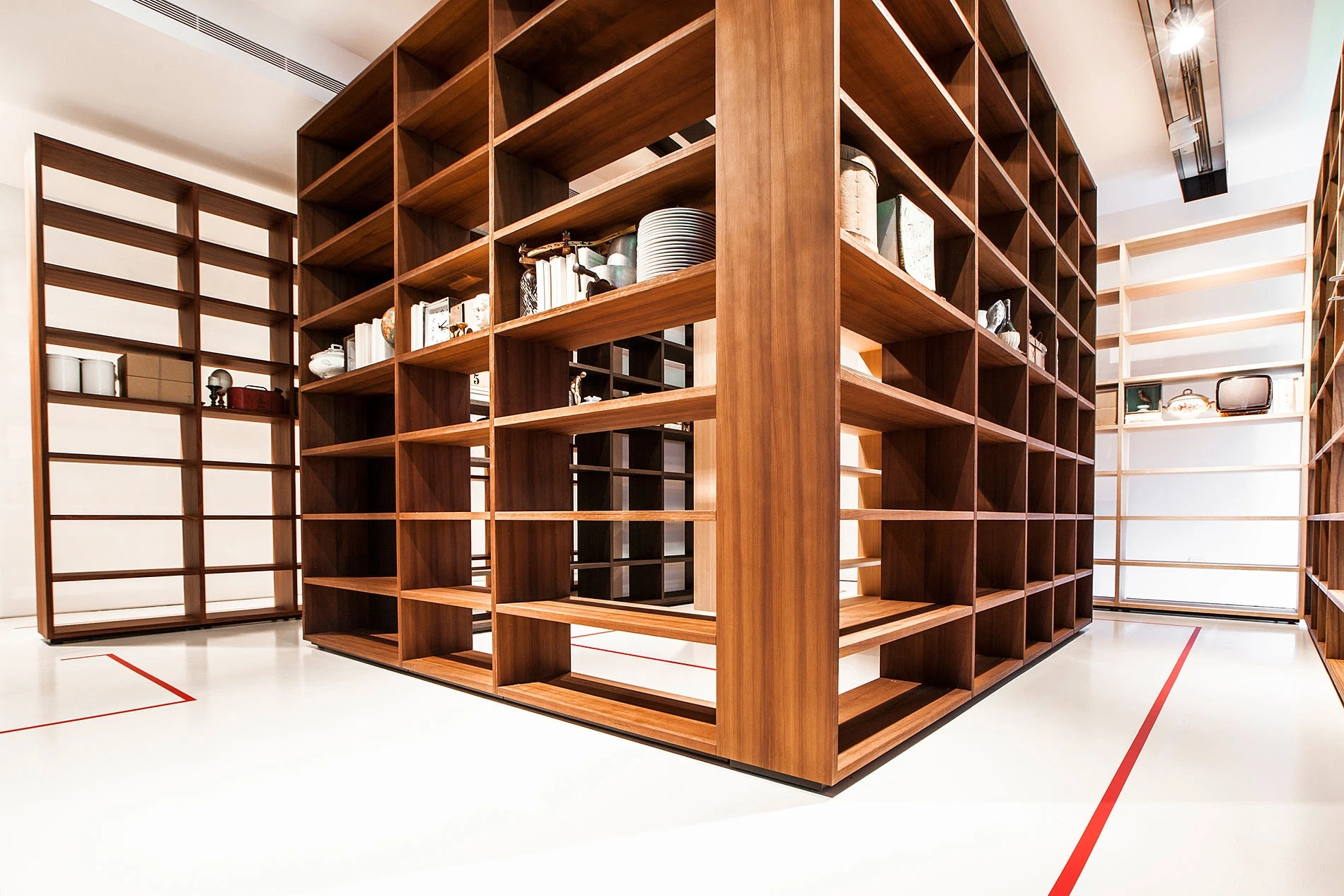 Porro’s savoir-faire on wood filters through in a conceptual manner in the “Woodenland” installation by Piero Lissoni in the Porro duriniquindici showroom: an itinerary where the regular grid of the System bookcase is transformed into a natural labyrinth in which to discover different essences, where a file rouge guides the visitor, helping him or her to orient themselves through the finishes. Showing “on its own skin” the new essences, System modules the space in the pursuit of naturalness, in a gradual passage of colours and textures.
