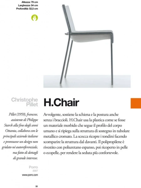 For its wrap-around design, supporting the back for a comfortable rest, H.Chair was inserted in "Sedie. I libri di Artedossier", the 128-pages book in A5 format curated by Valentina Croci and Porzia Bergamasco, edited last April by Giunti Editore, inside the series “Repertori Design”.