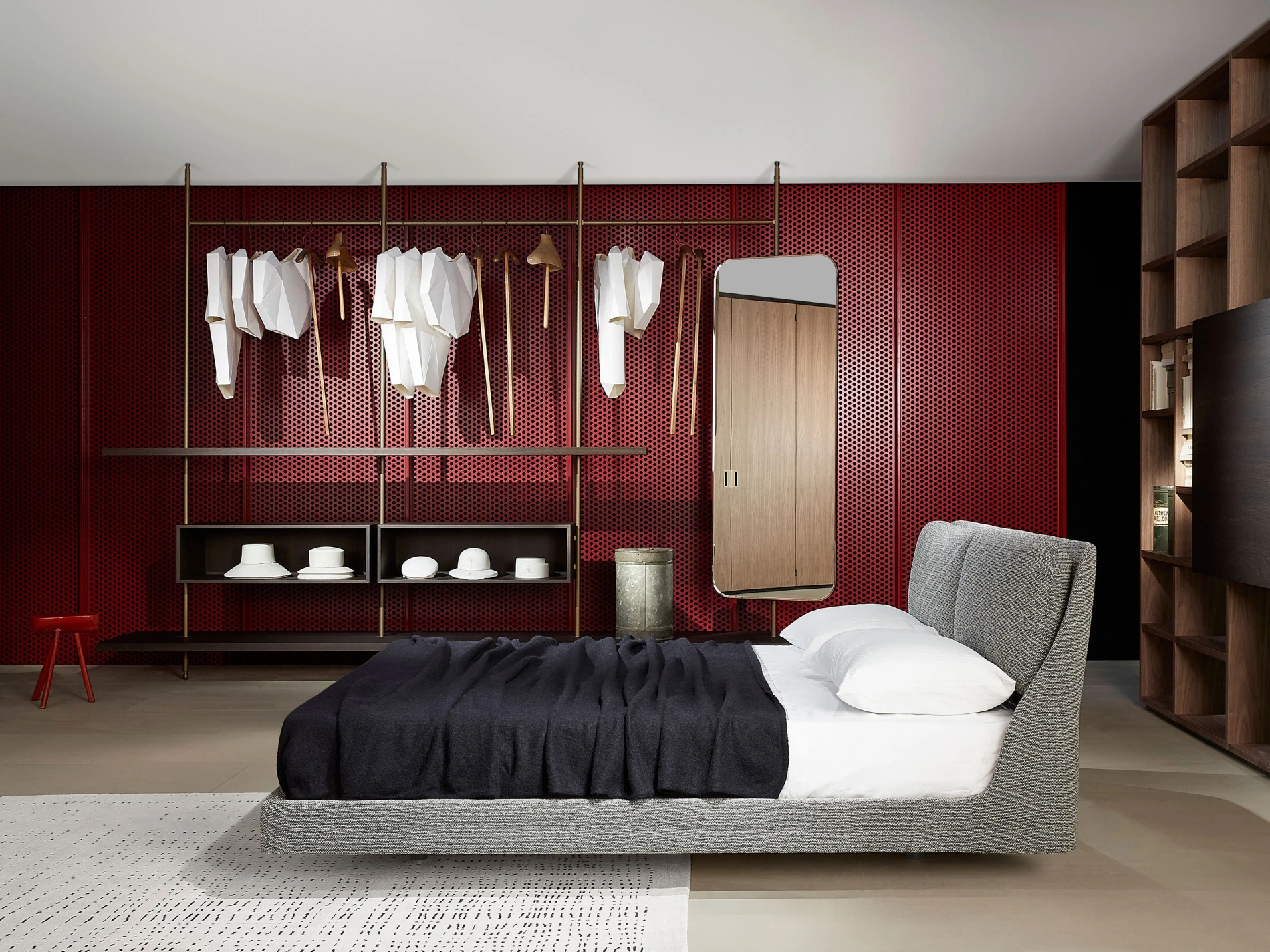 Makura textile bed is a new interpretation of domestic warmth that is a cross between rationality and sensuality. Lightly suspended with its welcoming and inviting form, it is embellished with soft cushions and a sinuous covering in leather, eco-leather or fabric that ends in a light volute, a decorative geometric ornament brought back to order betraying the brand’s love for detail and for objects made with care.